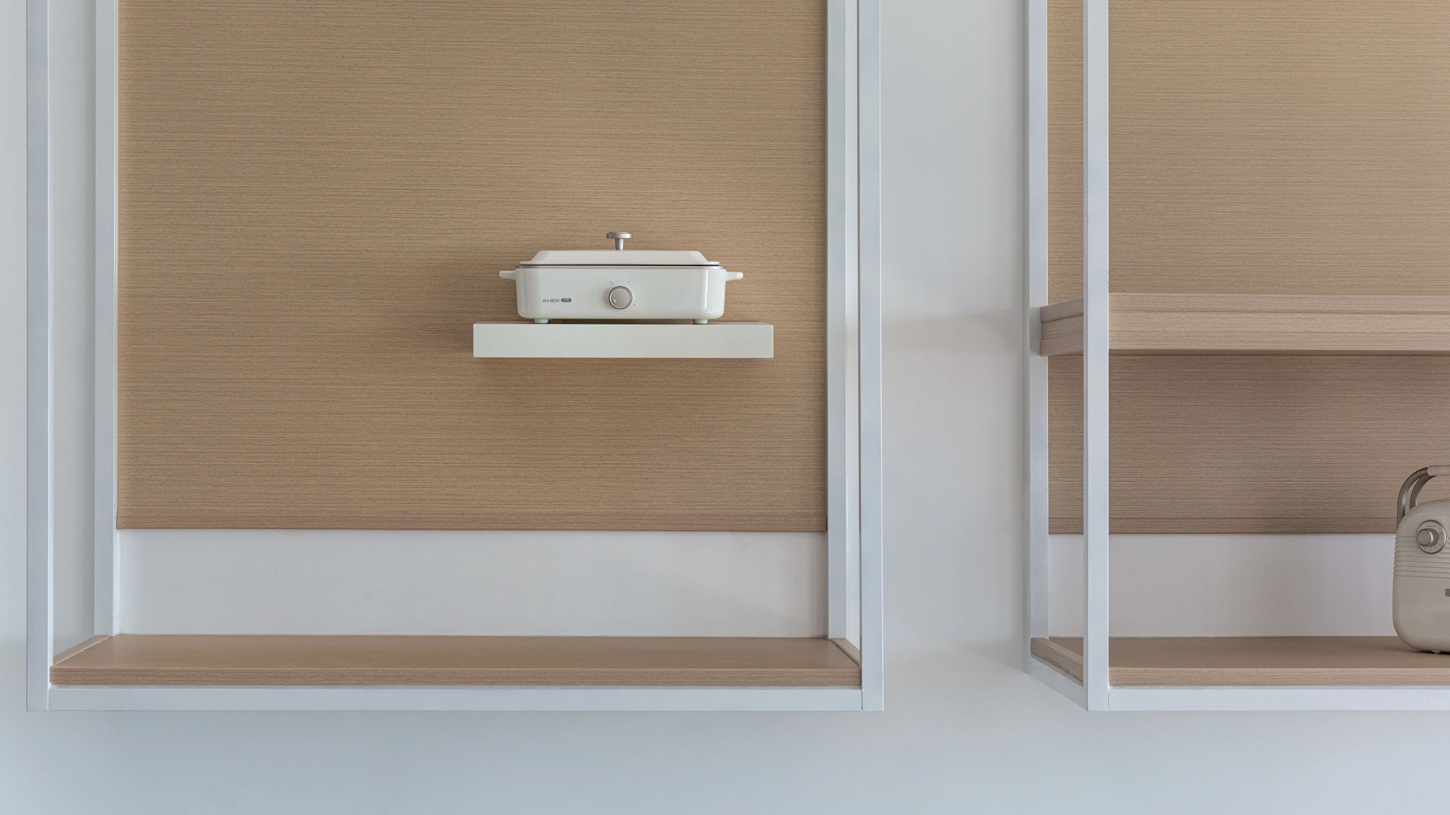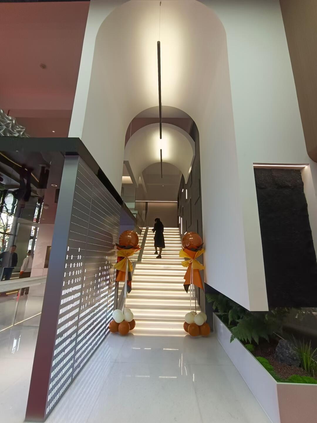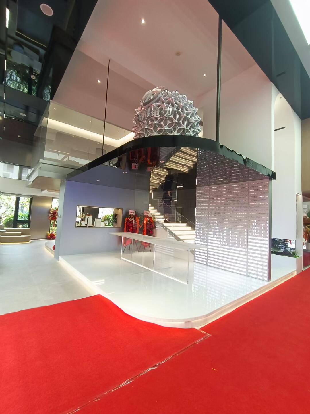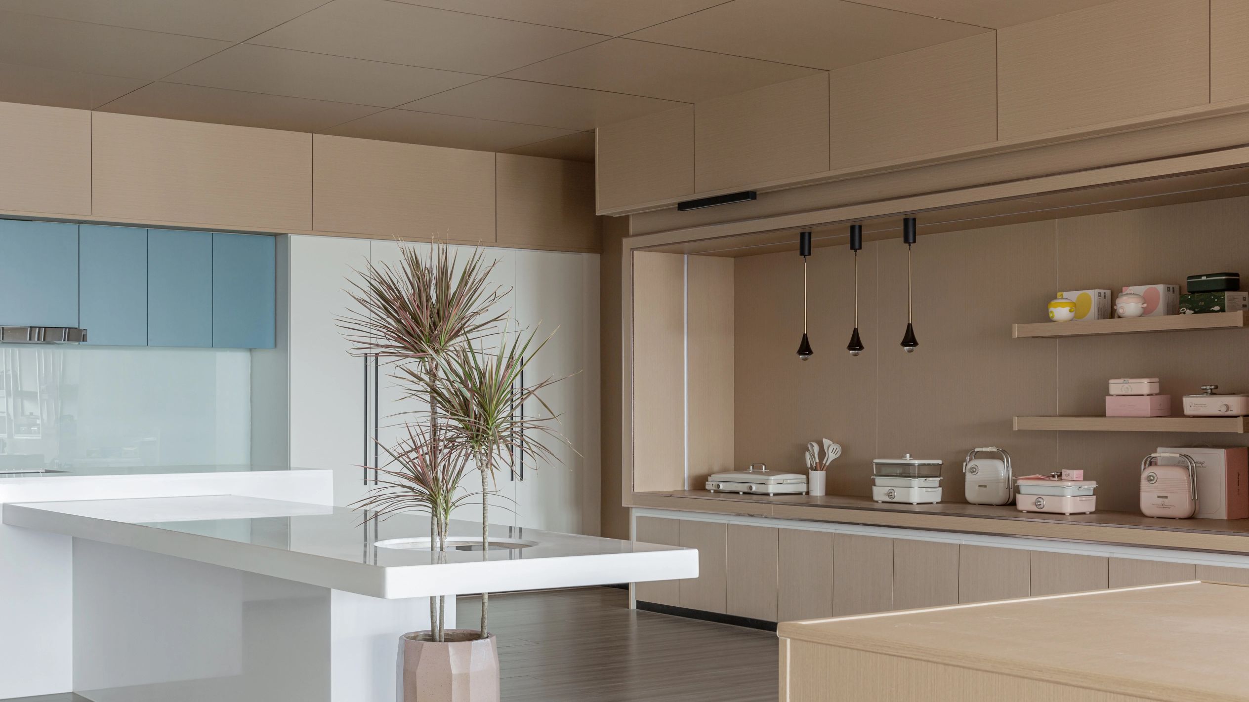 公共空间着力体现电子元件产品的精确性和稳定性带来的冷静感,办公区及展厅则体现人文关怀的友好感。办公区域是内部人员长时间活动的主要区域,在冰冷的工业园区内迫切需求有温度的办公环境,可以有效的缓解工业厂房带来的冷漠感与紧张感;自有品牌的白色小厨电展厅切合产品属性,强调亲切感与友好感。