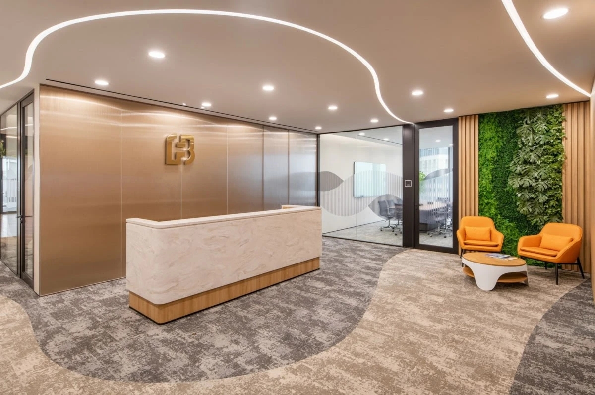 与充满活力的休息区形成对比,董事会的设计则偏向正式与优雅。橙色皮椅围绕中央桌子,营造出既舒适又不失风格的空间。极简主义的设计使得外部城市景观成为空间的视觉焦点,而圆角和柔和的灯光则进一步增强了董事会区域的复杂氛围。台北富邦银行的新加坡办公室特别注重可持续设计原则,通过绿色网格系统和自然元素的引入,反映了银行在环保解决方案方面的承诺。办公室内的苔藓墙、生物墙和室内植物有效提升了空间的自然氛围,为员工提供了一个更加健康、舒适的工作环境。自然元素与现代设计的结合,完美地体现了银行对员工福祉的关怀以及对可持续发展的承诺。