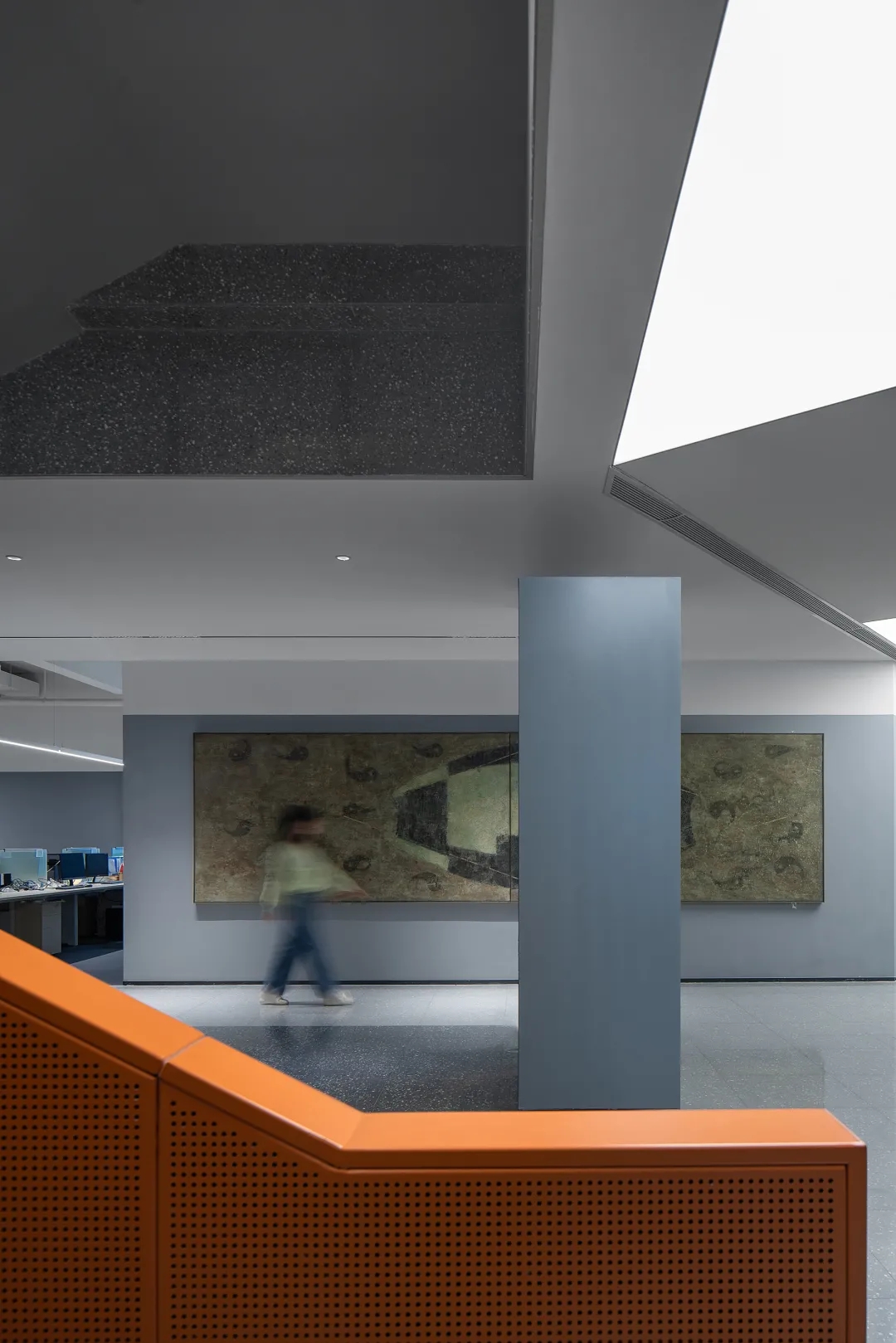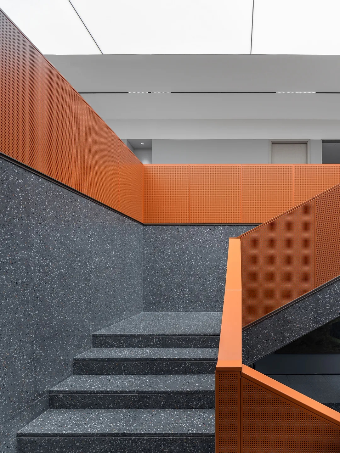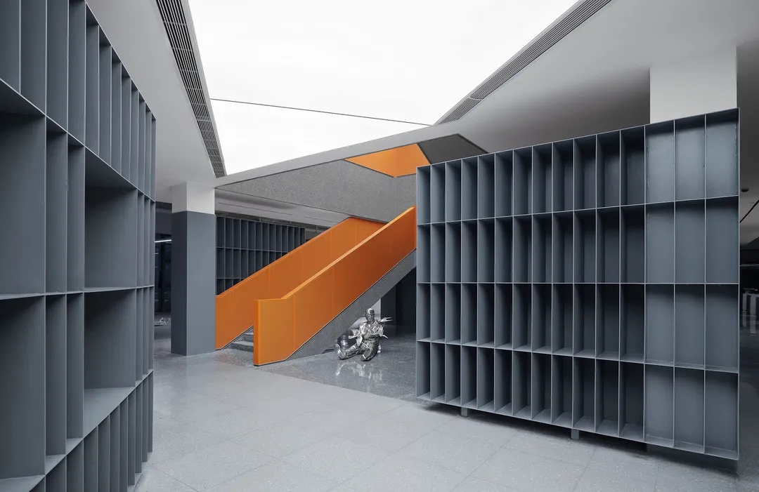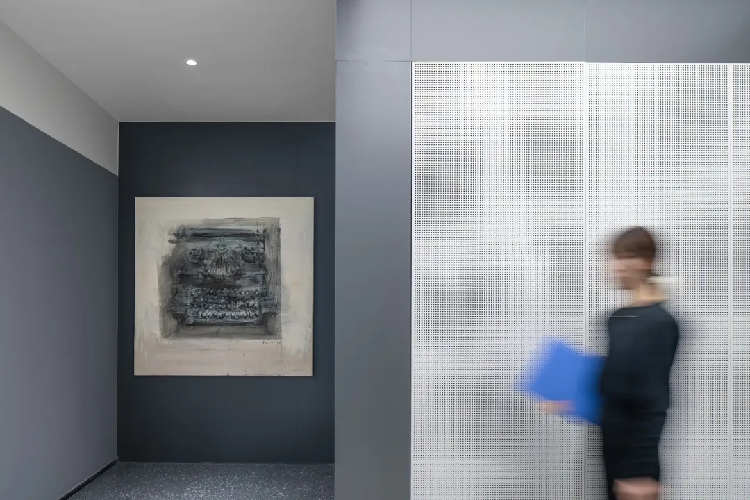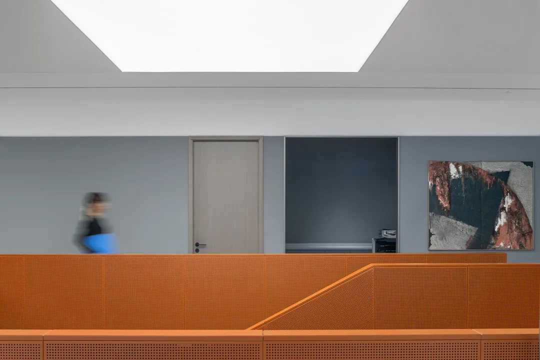 设计师首先采用使用了低饱和度和中性颜色创造一个光滑、简约、高秩序度的内部,使用单一的、浅色的金属多孔板无差别贯穿行走动线,统一空间视觉,创造流动和空间感。