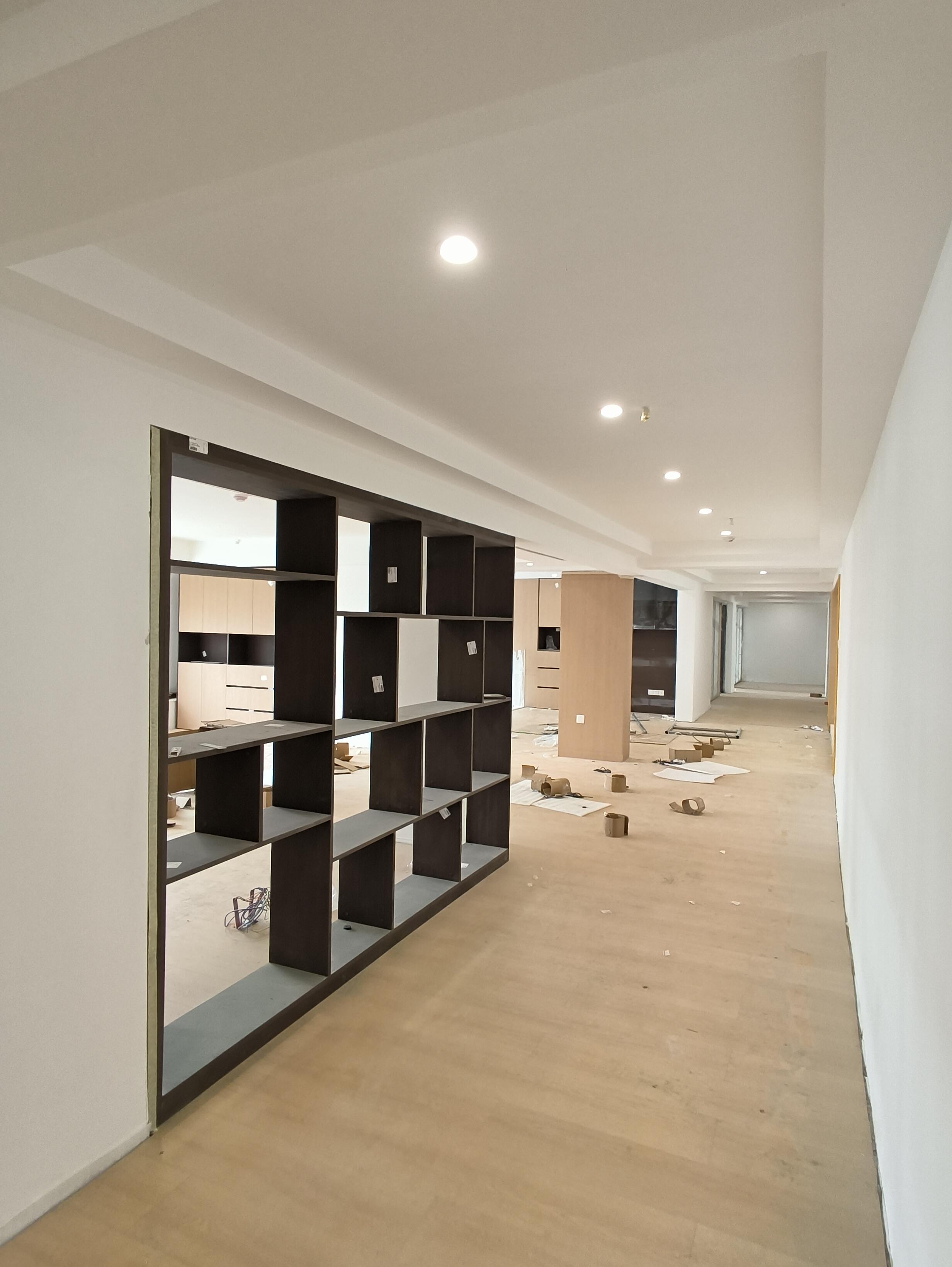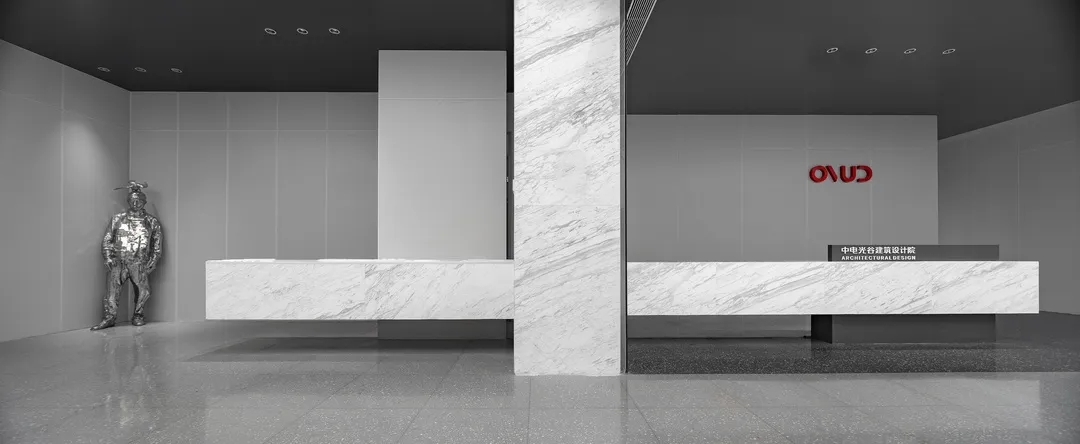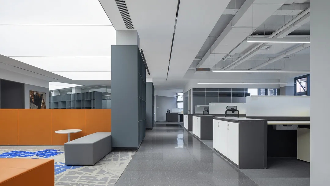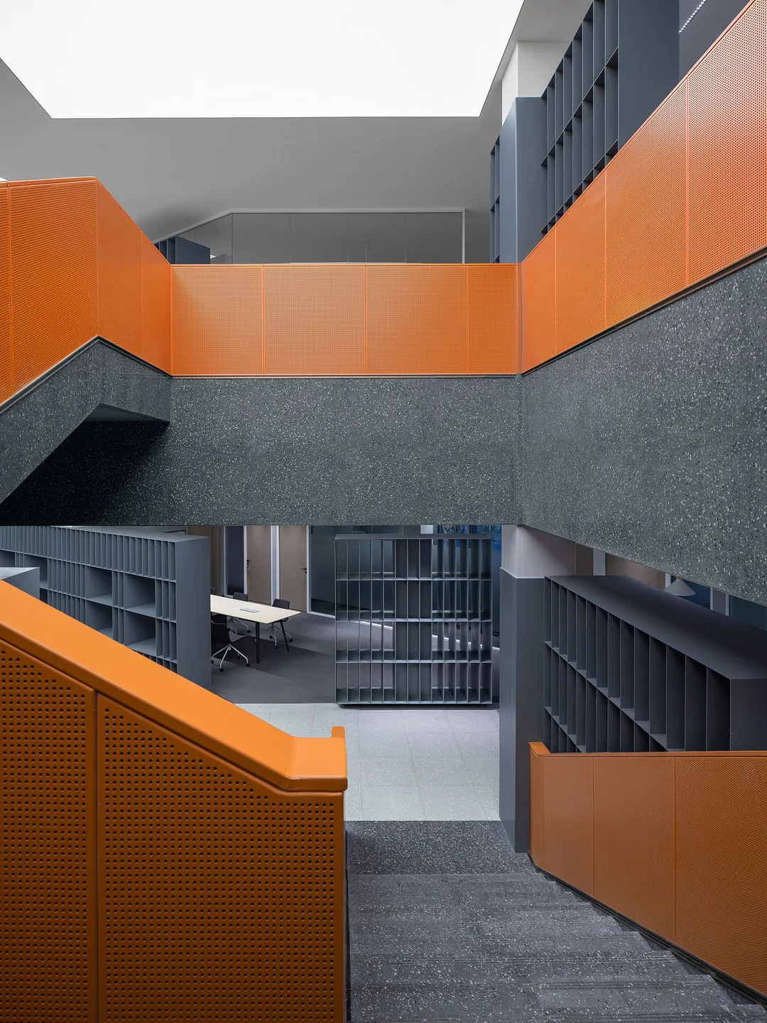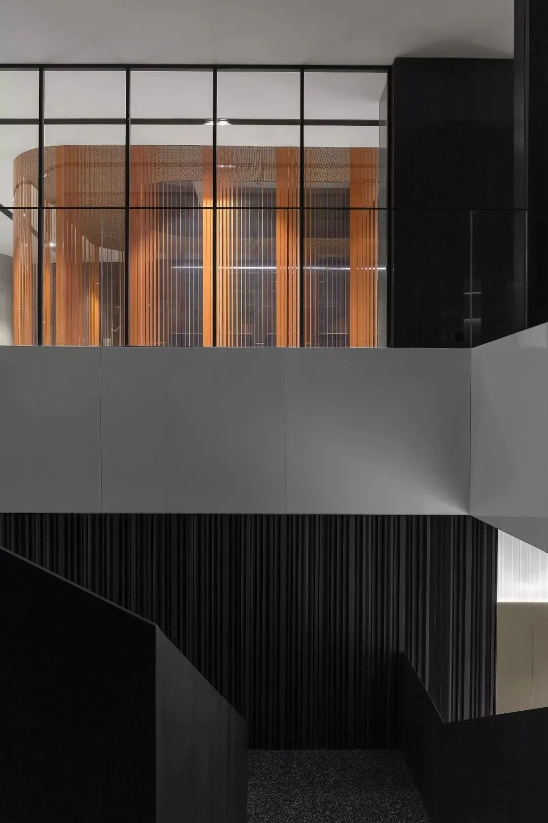 设计师首先采用使用了低饱和度和中性颜色创造一个光滑、简约、高秩序度的内部,使用单一的、浅色的金属多孔板无差别贯穿行走动线,统一空间视觉,创造流动和空间感。