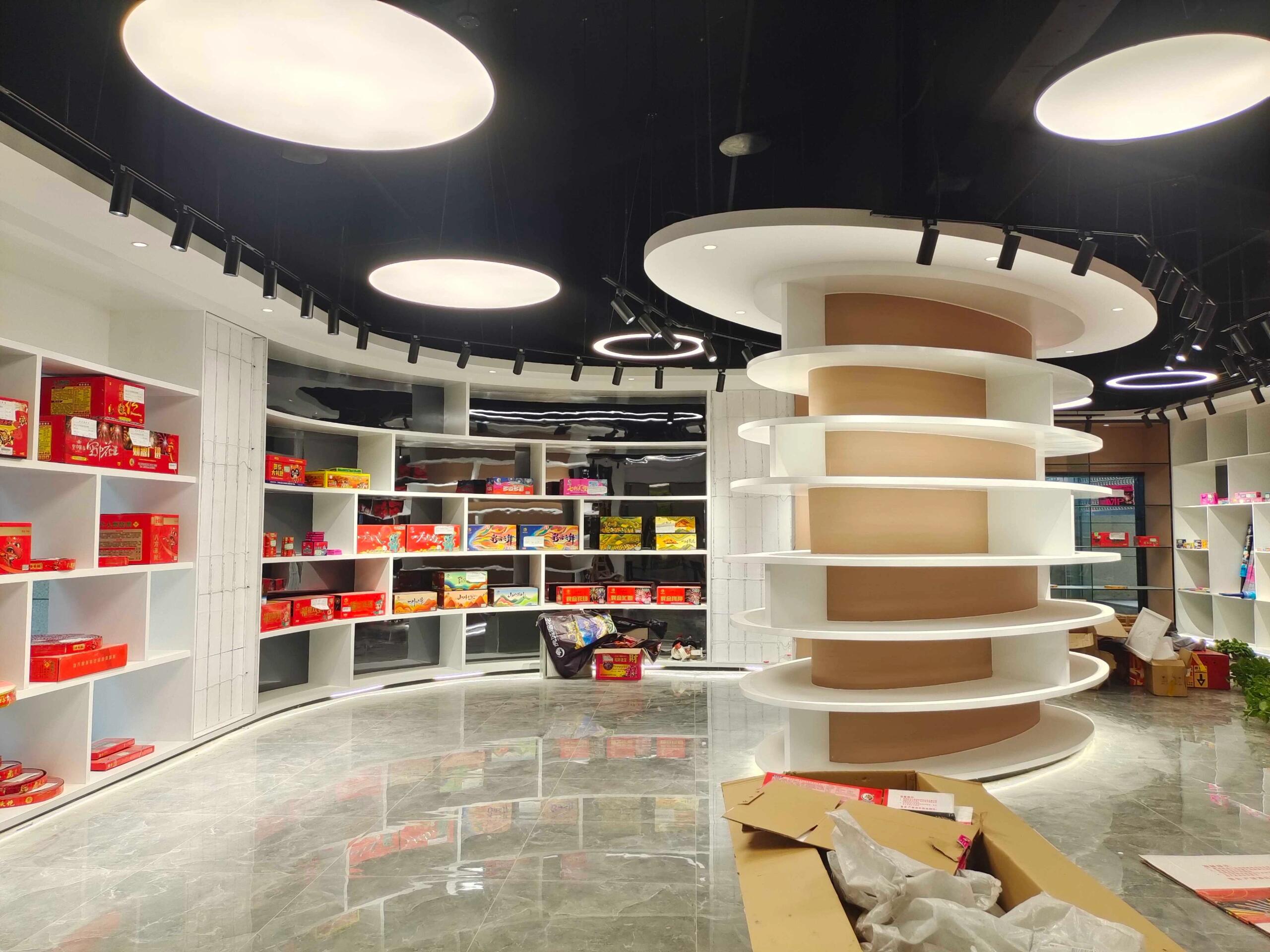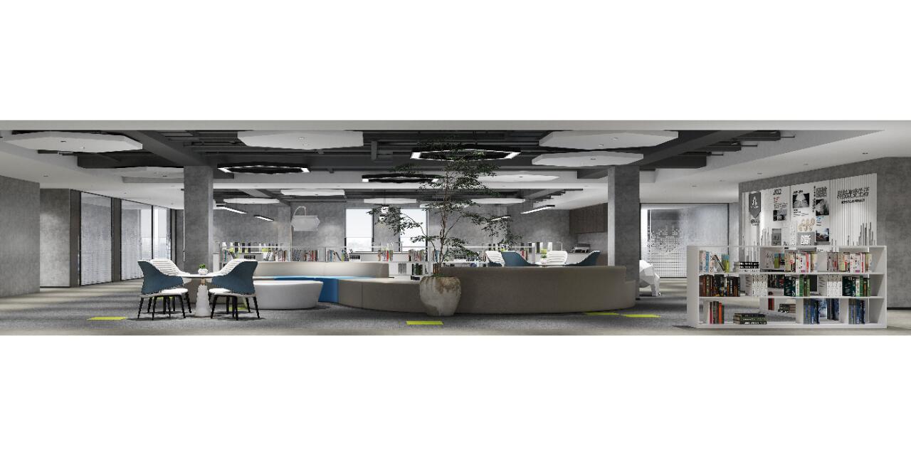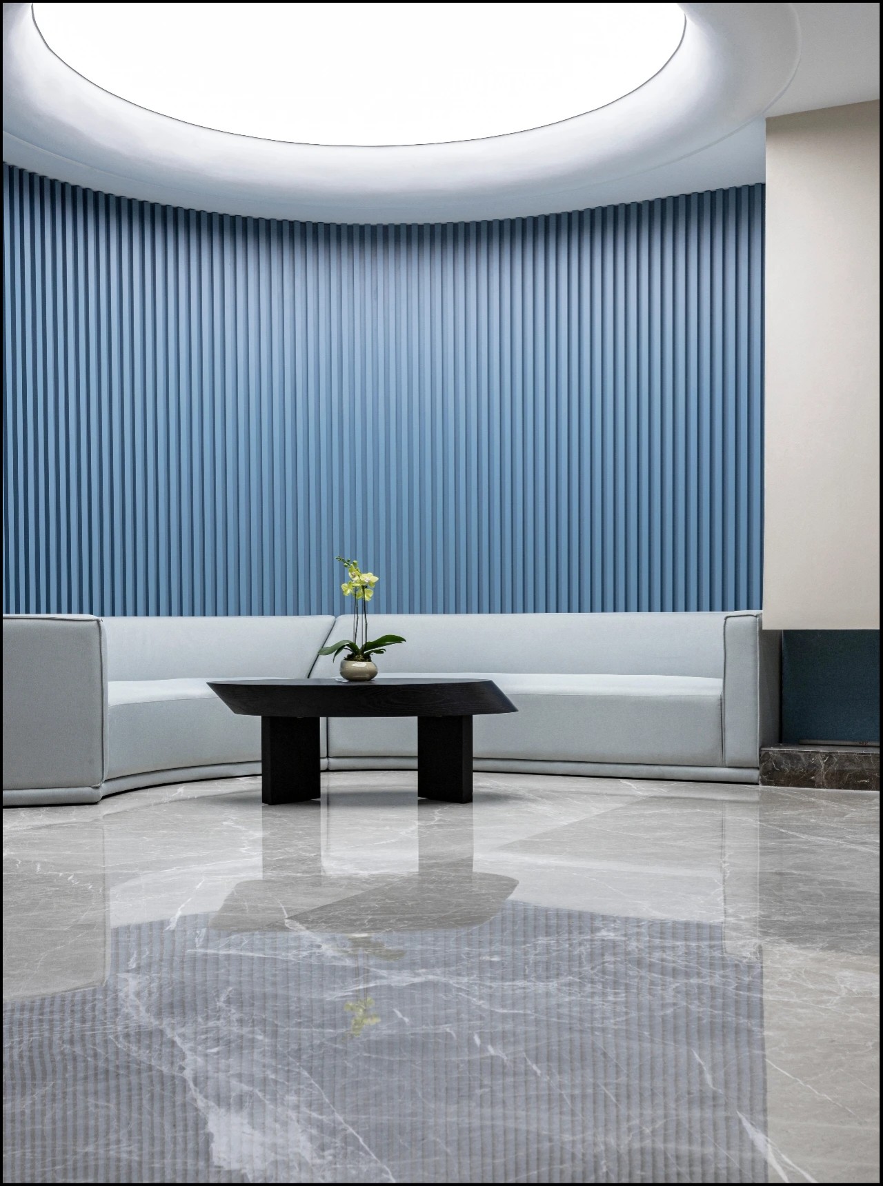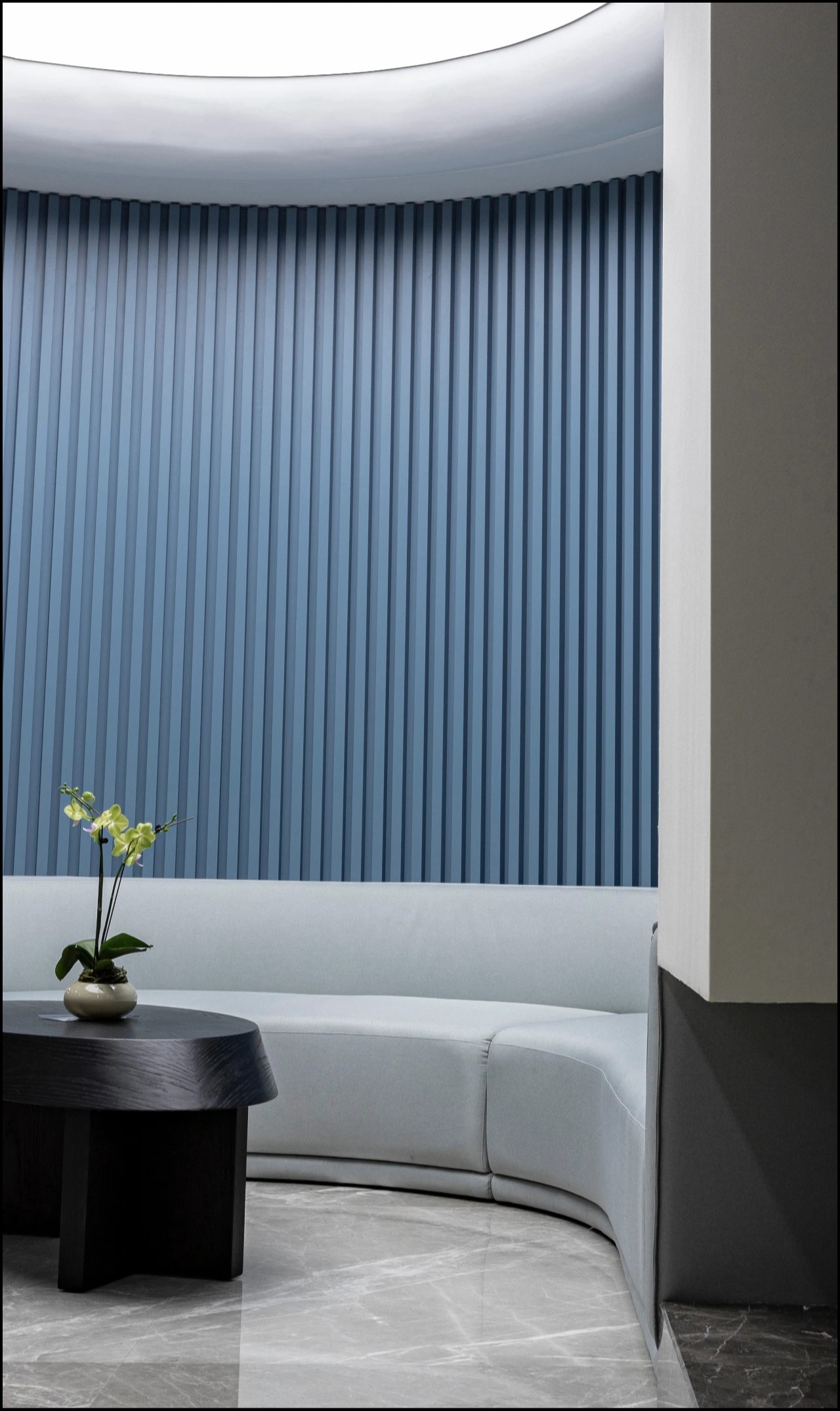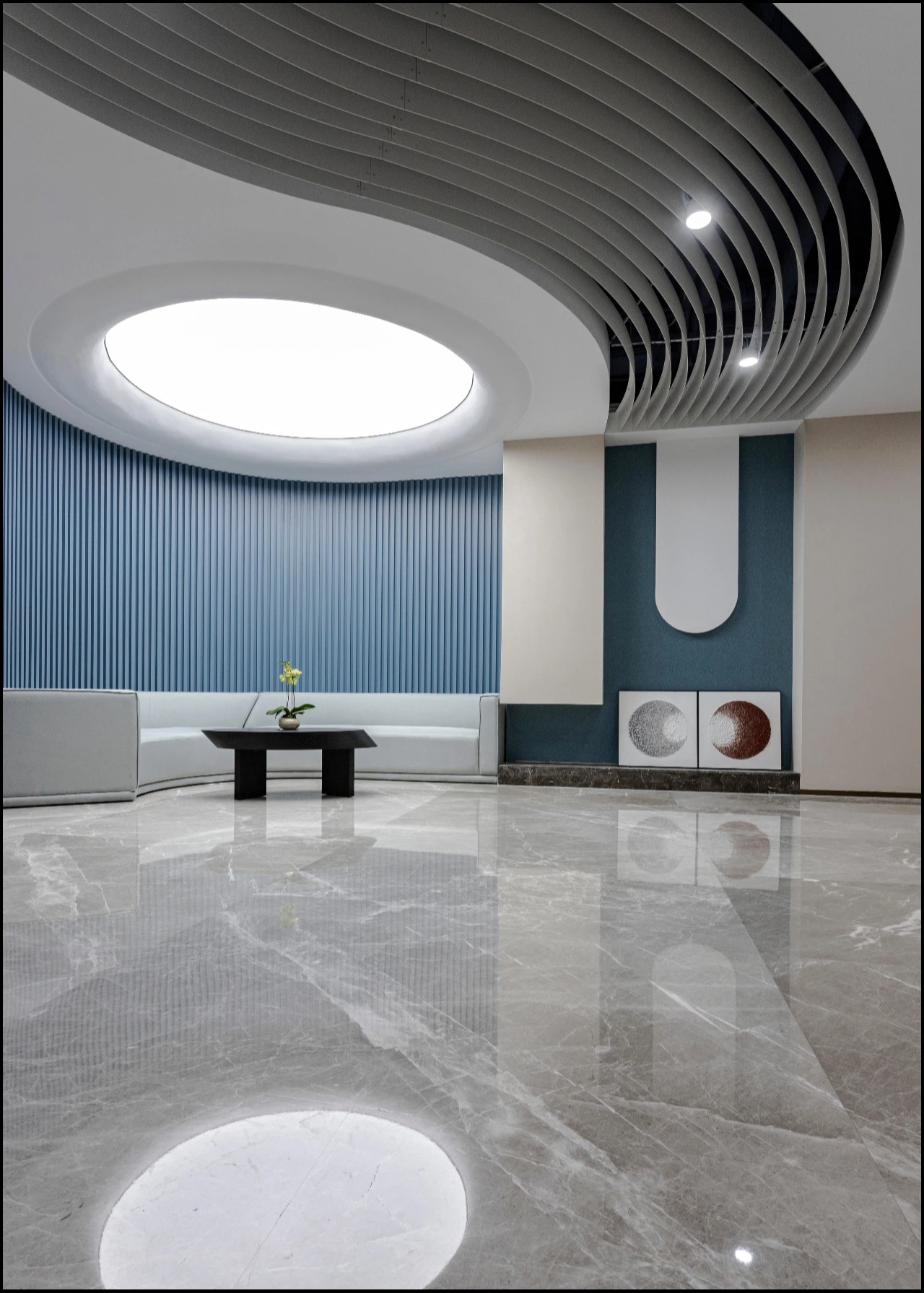以圆形灯膜造型为中心结合环抱式座椅配曲线组合式靠椅延伸休闲区,以蓝白色调为主色,工作休闲互补,顶部结合格栅线条曲线设计简约造型延伸设计。