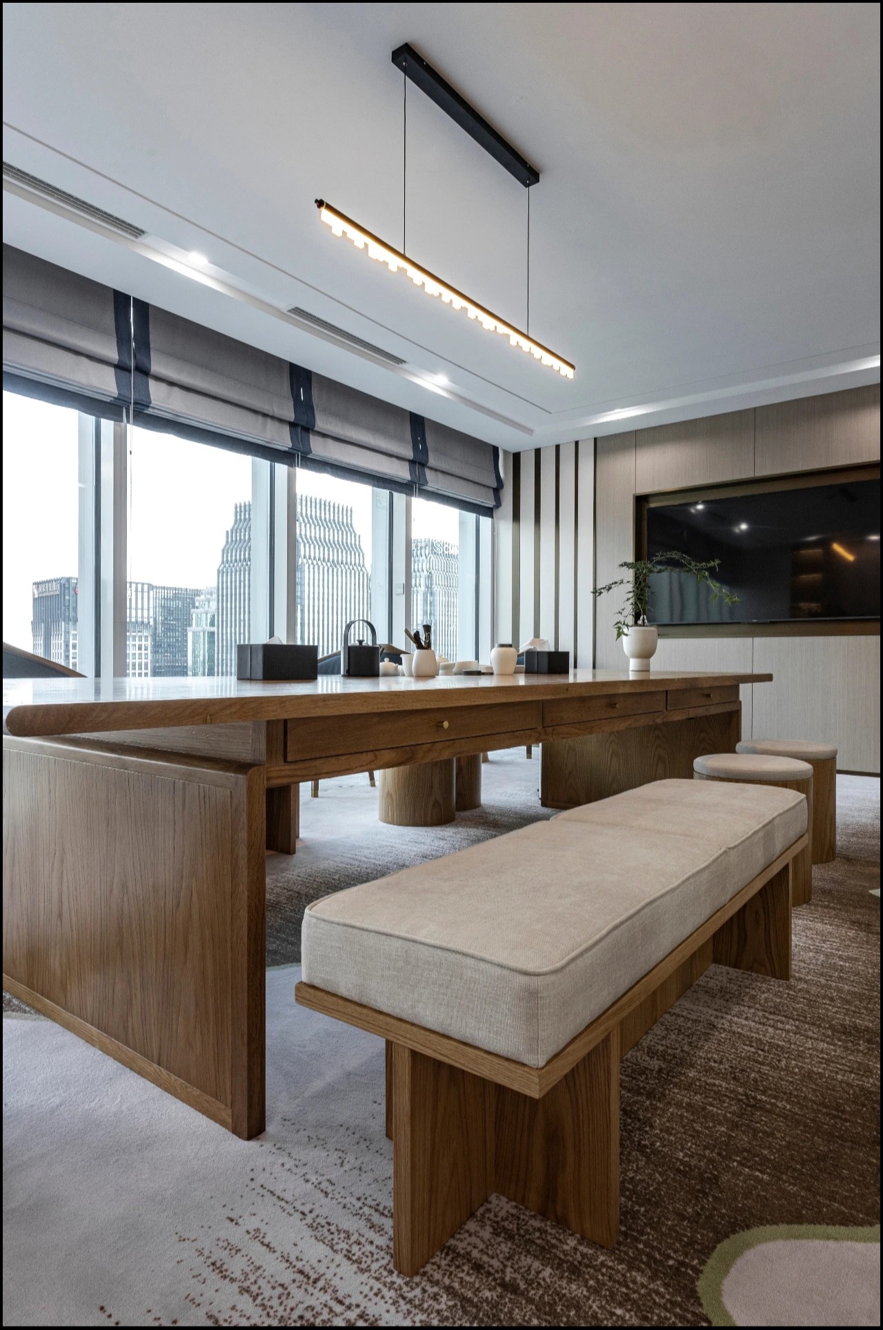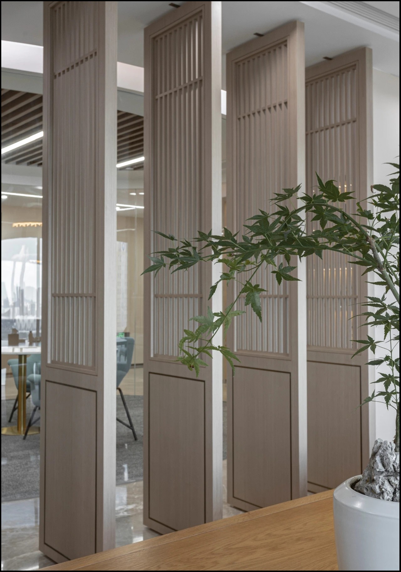 中式的茶室起到空间的点睛设计,不同办公区的设计,以木饰面为主调的空间传达的是素雅轻松的接待与洽谈功能,不浮于表面与浮夸形象。