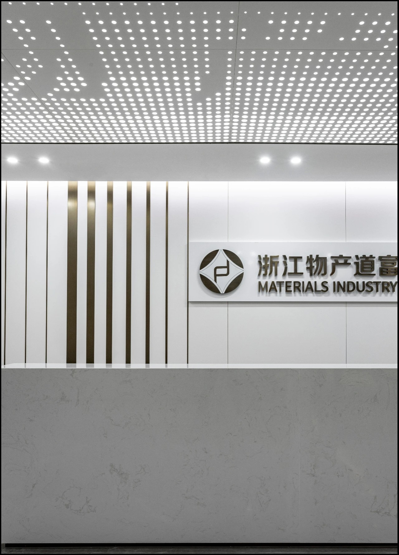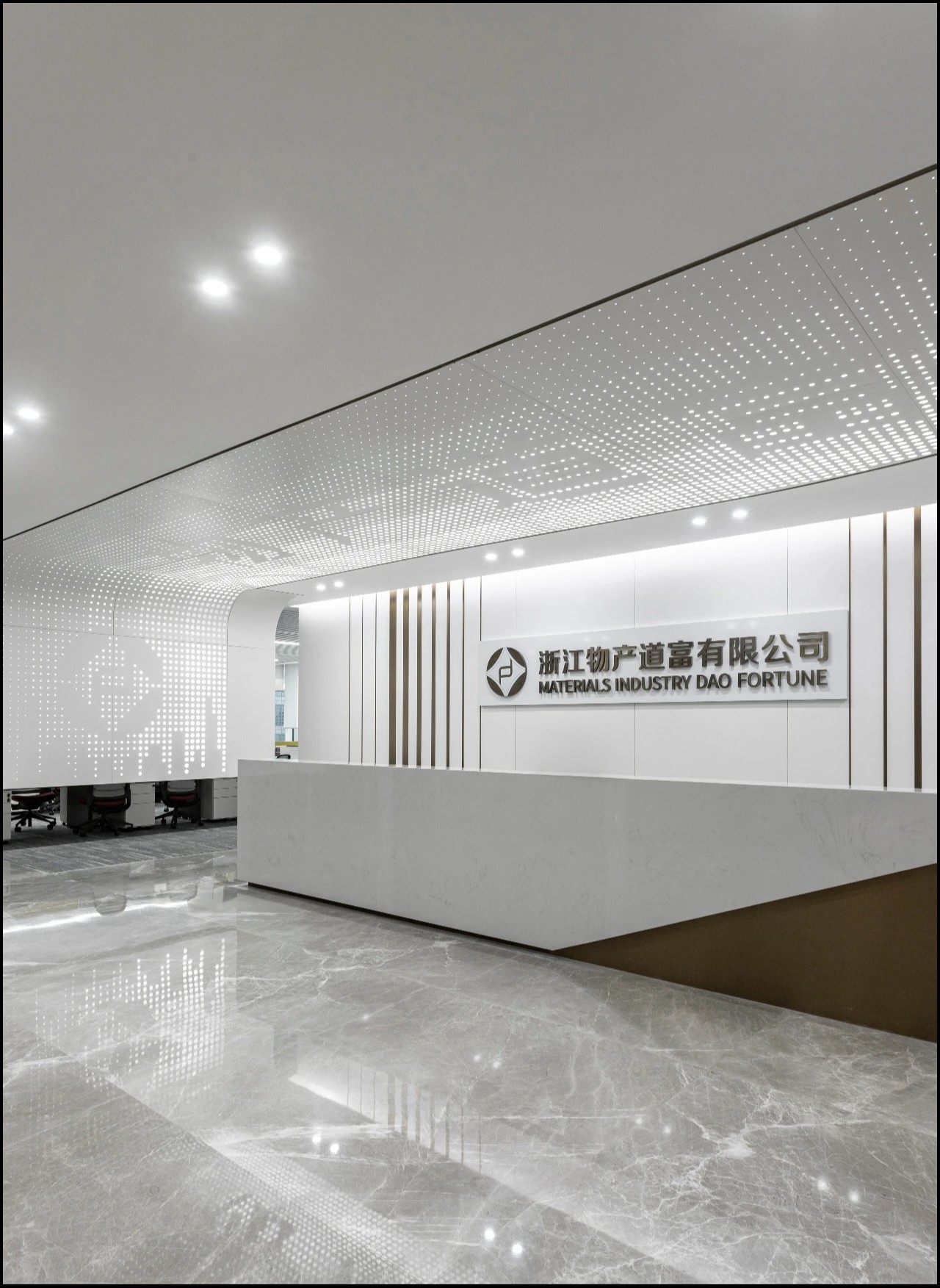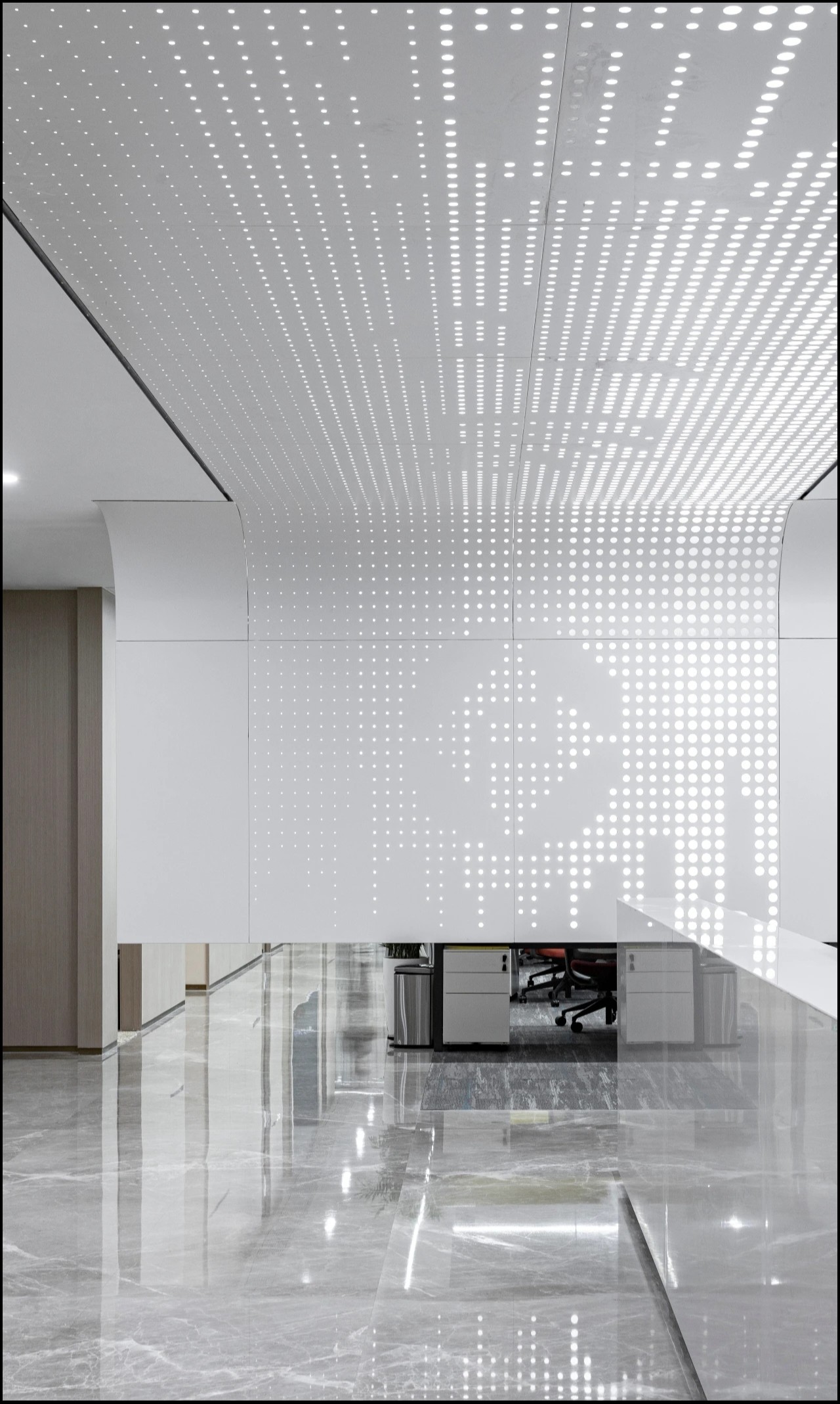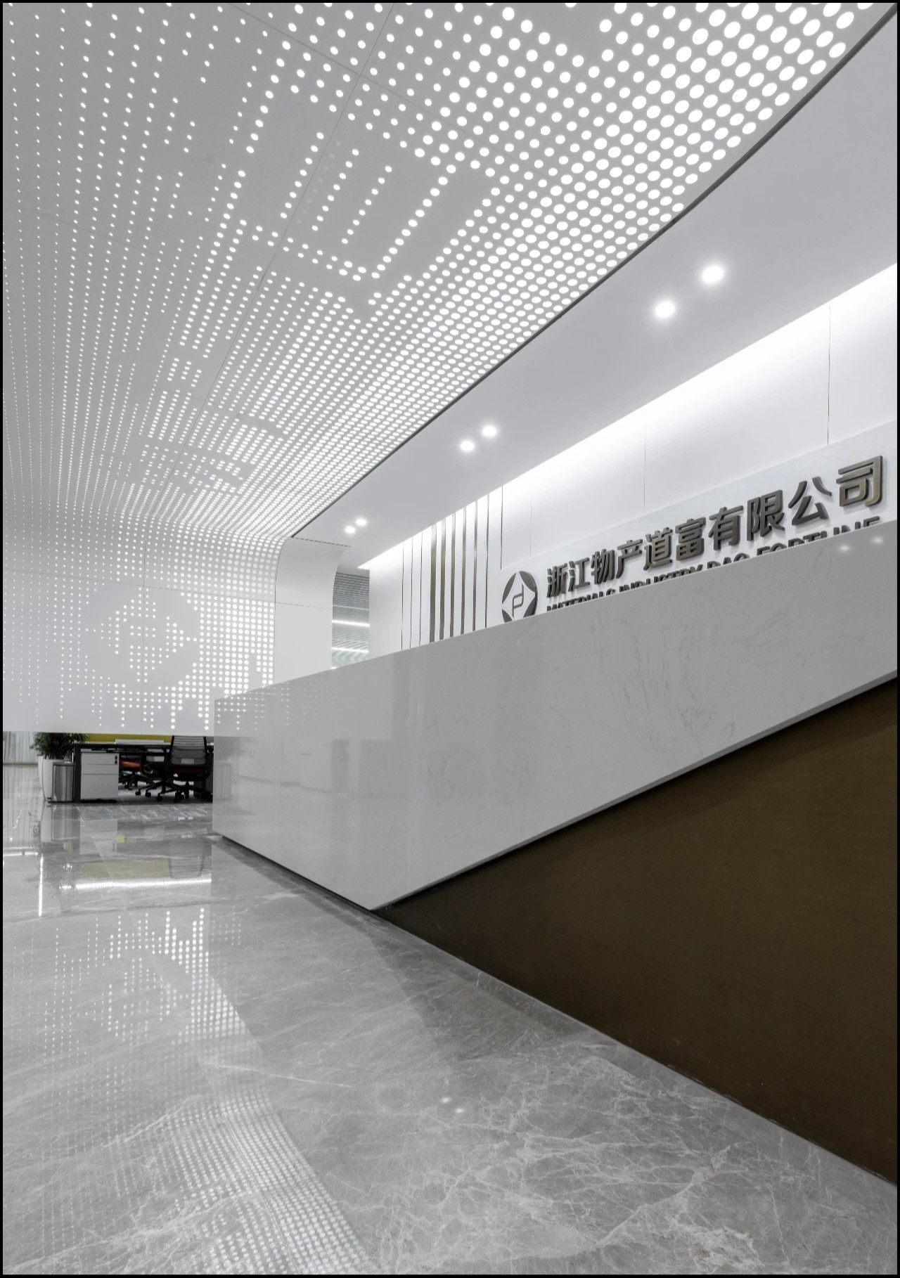 白色调的主视觉形象,提高了空间格调与企业形象,设计师采用吊顶的半挂式穿孔设计,背景墙竖形渐变方式贯穿左右,形成立面的拼接,搭配隐藏灯带,局部的金属和灰色地砖搭配体现空间的高质感;弧形视觉上更有延伸感,左侧的企业的文化墙,传达企业文化展示物产世界500强的强硬实力。