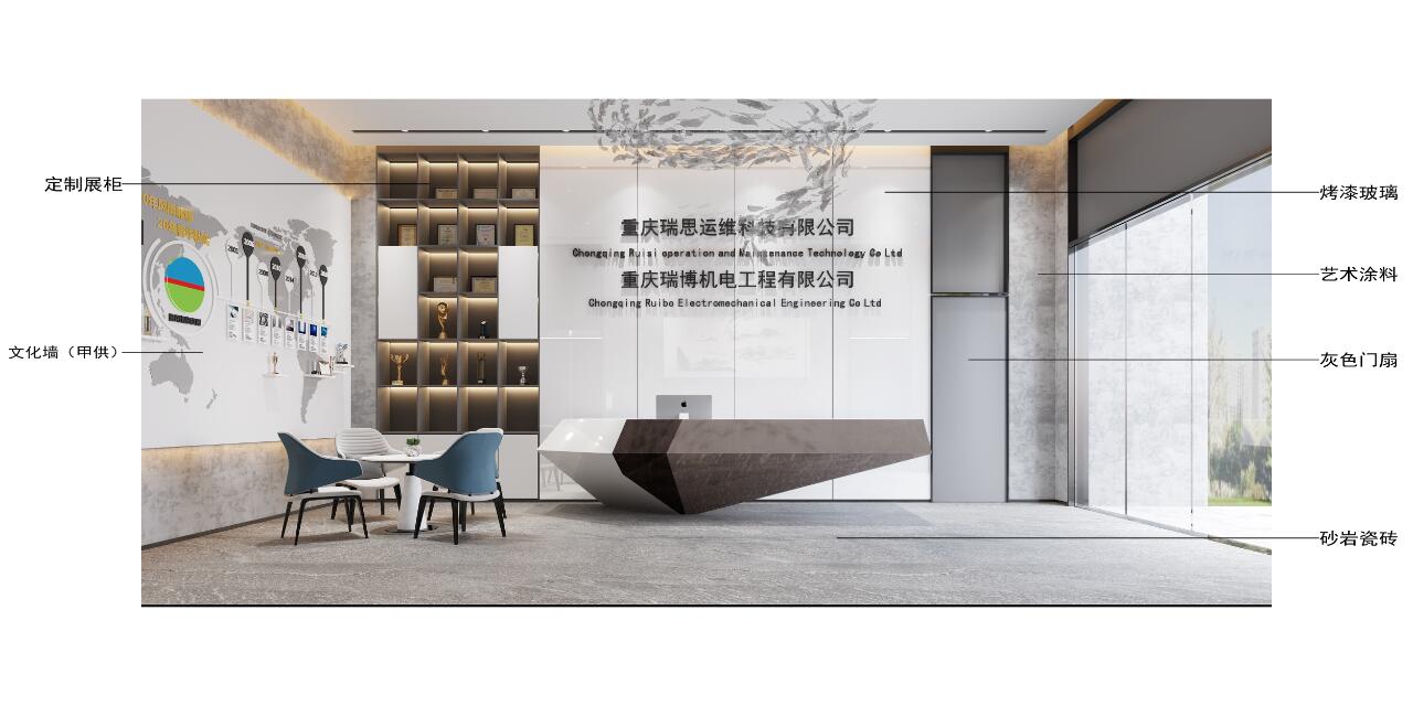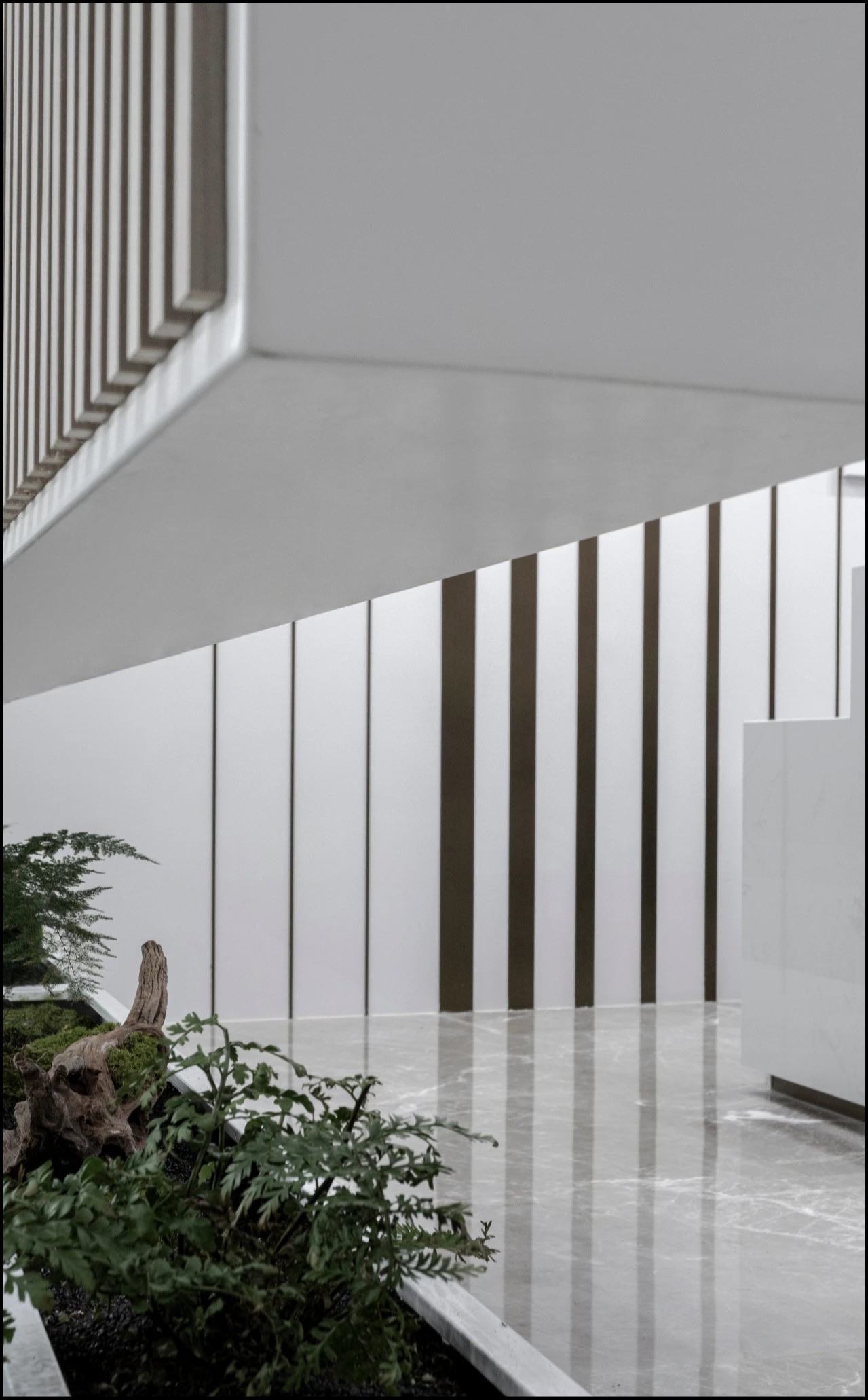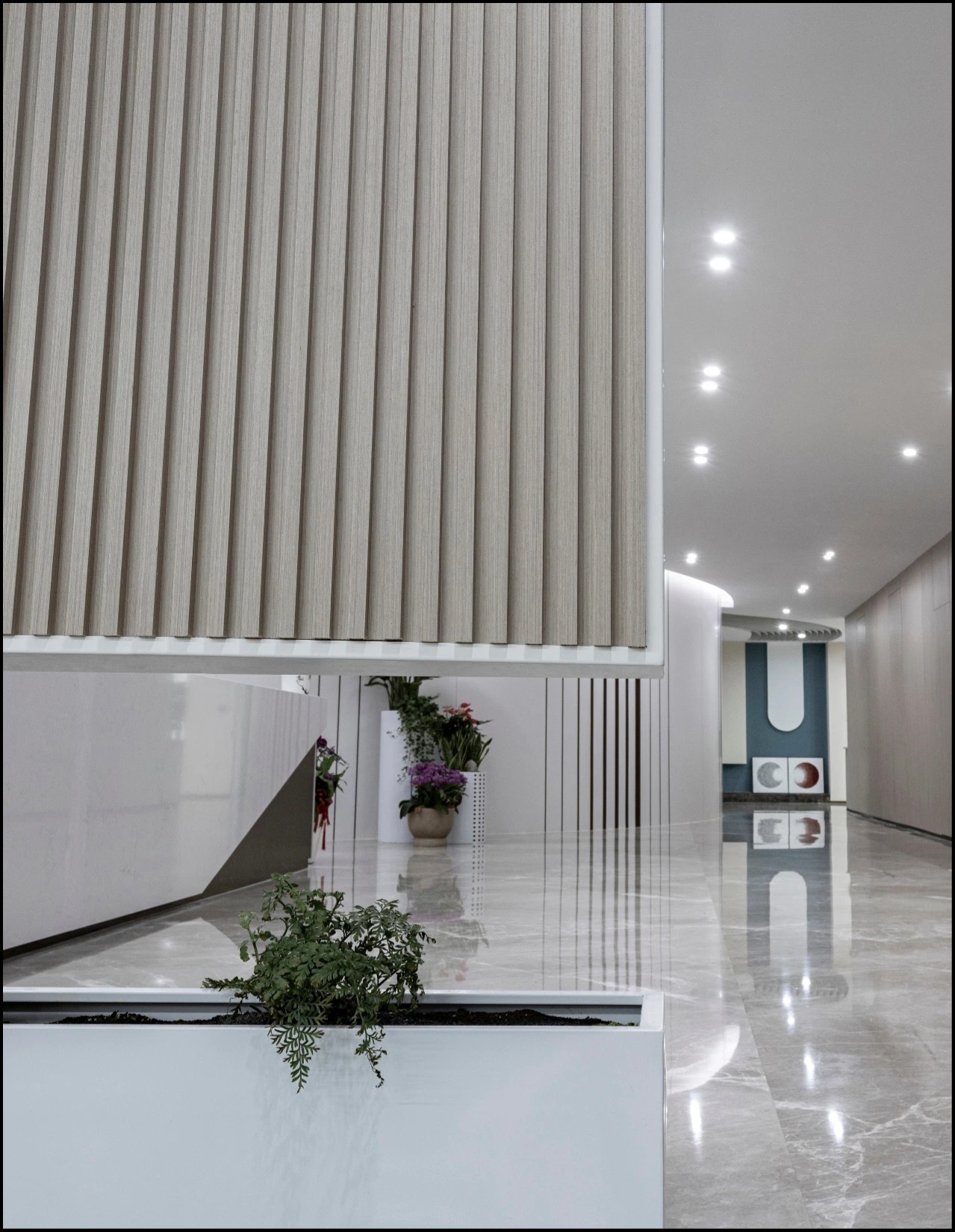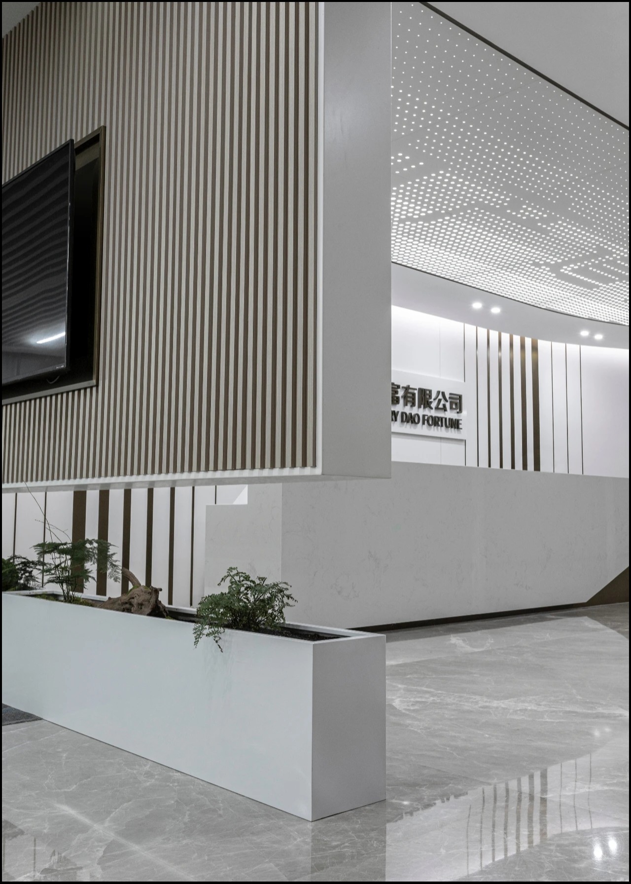白色调的主视觉形象,提高了空间格调与企业形象,设计师采用吊顶的半挂式穿孔设计,背景墙竖形渐变方式贯穿左右,形成立面的拼接,搭配隐藏灯带,局部的金属和灰色地砖搭配体现空间的高质感;弧形视觉上更有延伸感,左侧的企业的文化墙,传达企业文化展示物产世界500强的强硬实力。