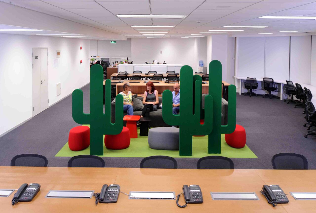 洽谈区以开放式与圆筒式的轻松设计方式,同时兼休闲功能,场景化的体验拉近沟通距离感从而提升效率值;同时加入灯光的处理以灯带与灯膜为主,提升了整体的灯光效果,不管白天和黑夜,都能保持良好的采光;除了接待客户,平时也可小憩;在色彩和家具上我们的设计师采用了蓝色搭配空间,墙面融入了企业荣誉墙为空间提升了识别性和历史感。