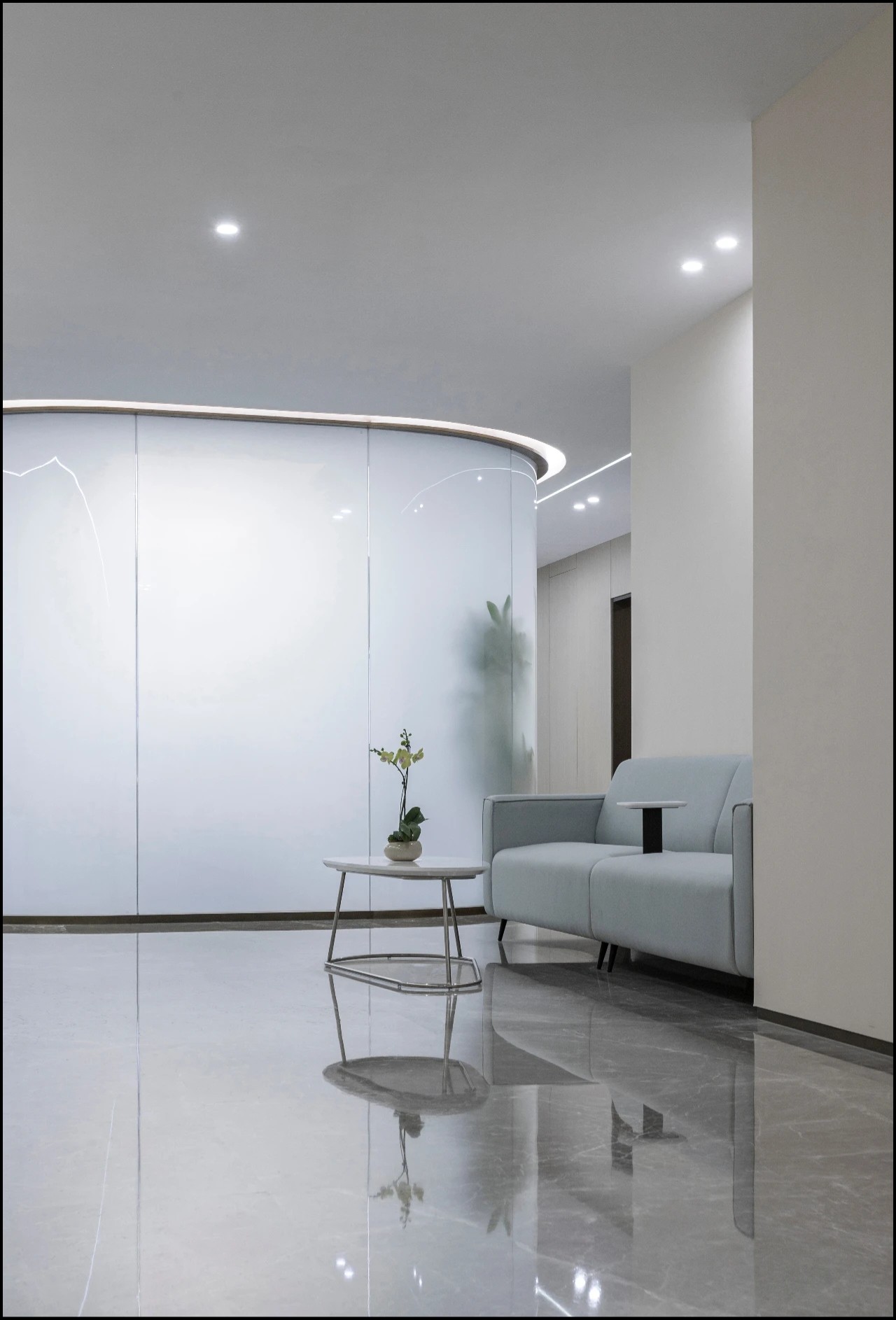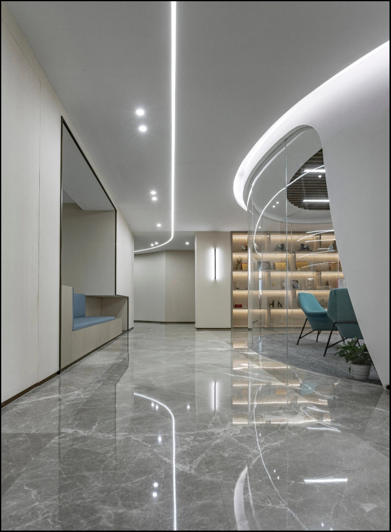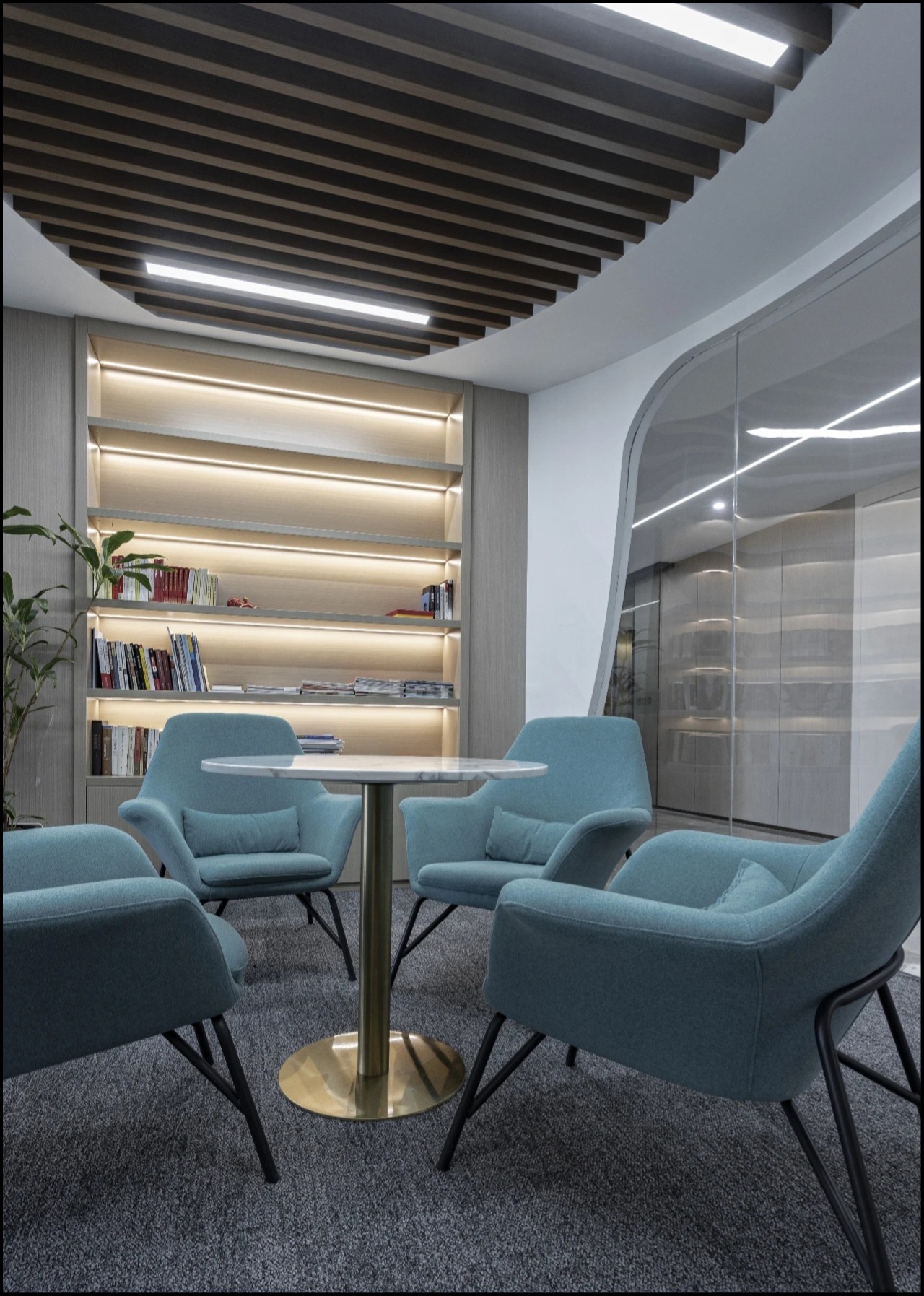 以圆形灯膜造型为中心结合环抱式座椅配曲线组合式靠椅延伸休闲区,以蓝白色调为主色,工作休闲互补,顶部结合格栅线条曲线设计简约造型延伸设计。