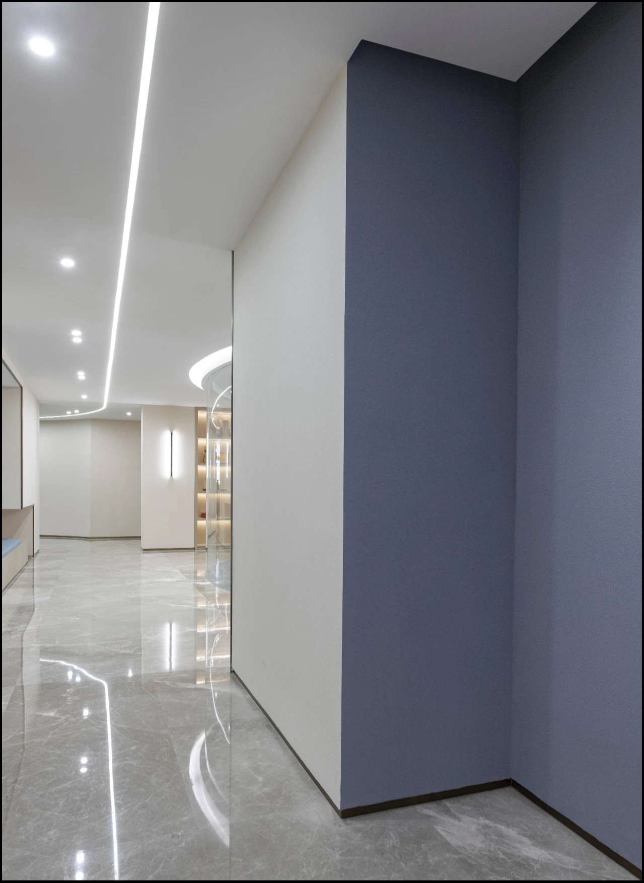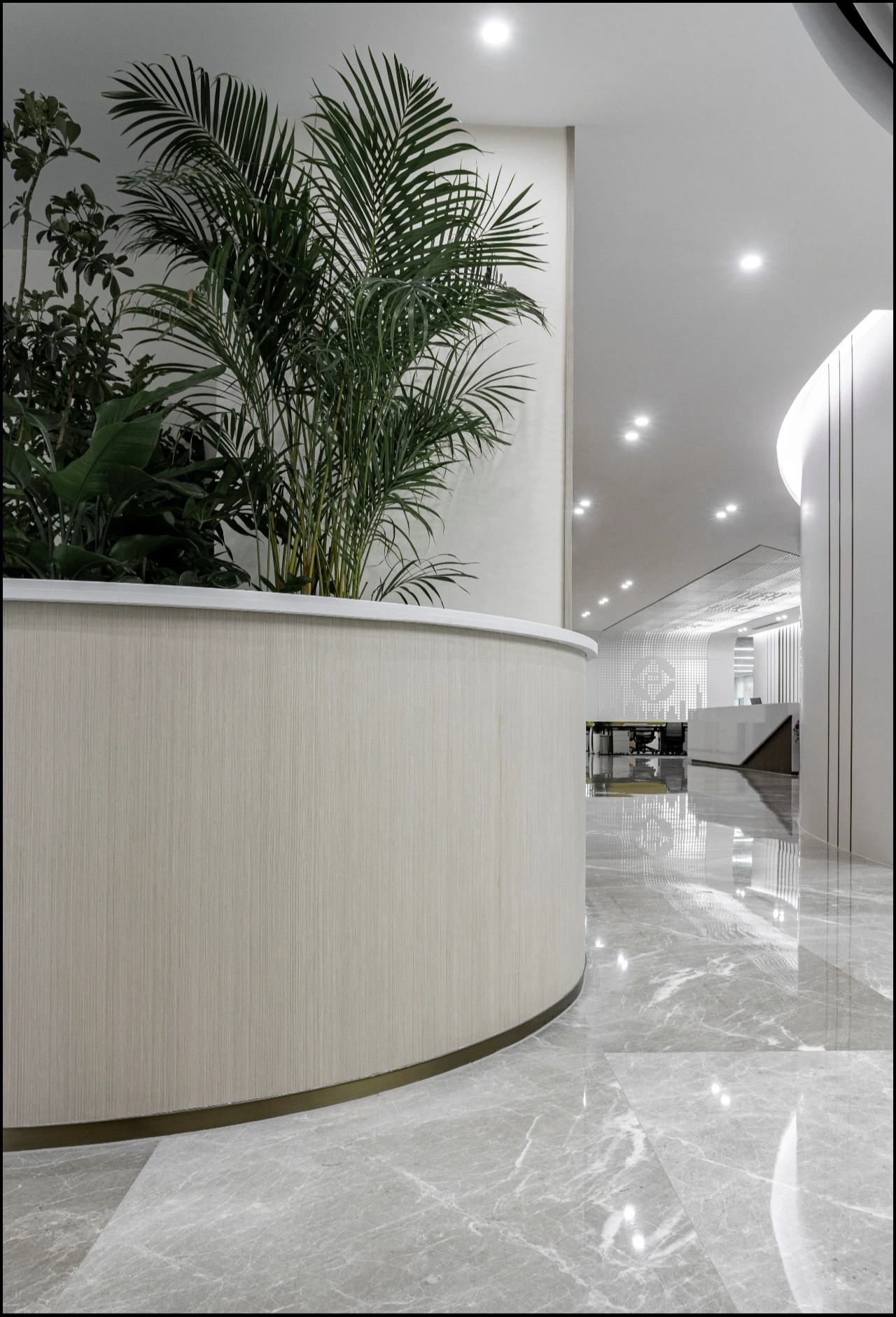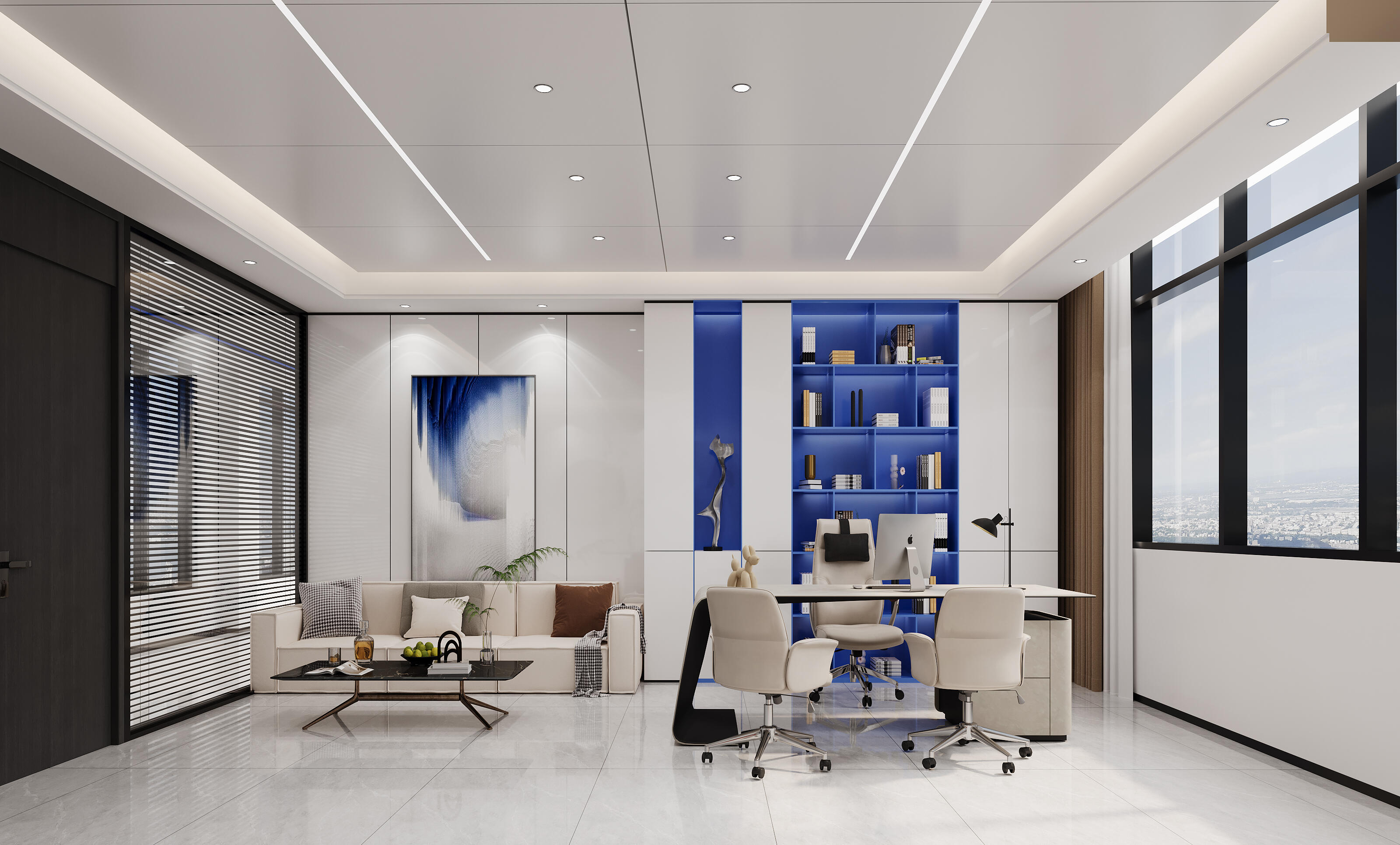 以圆形灯膜造型为中心结合环抱式座椅配曲线组合式靠椅延伸休闲区,以蓝白色调为主色,工作休闲互补,顶部结合格栅线条曲线设计简约造型延伸设计。