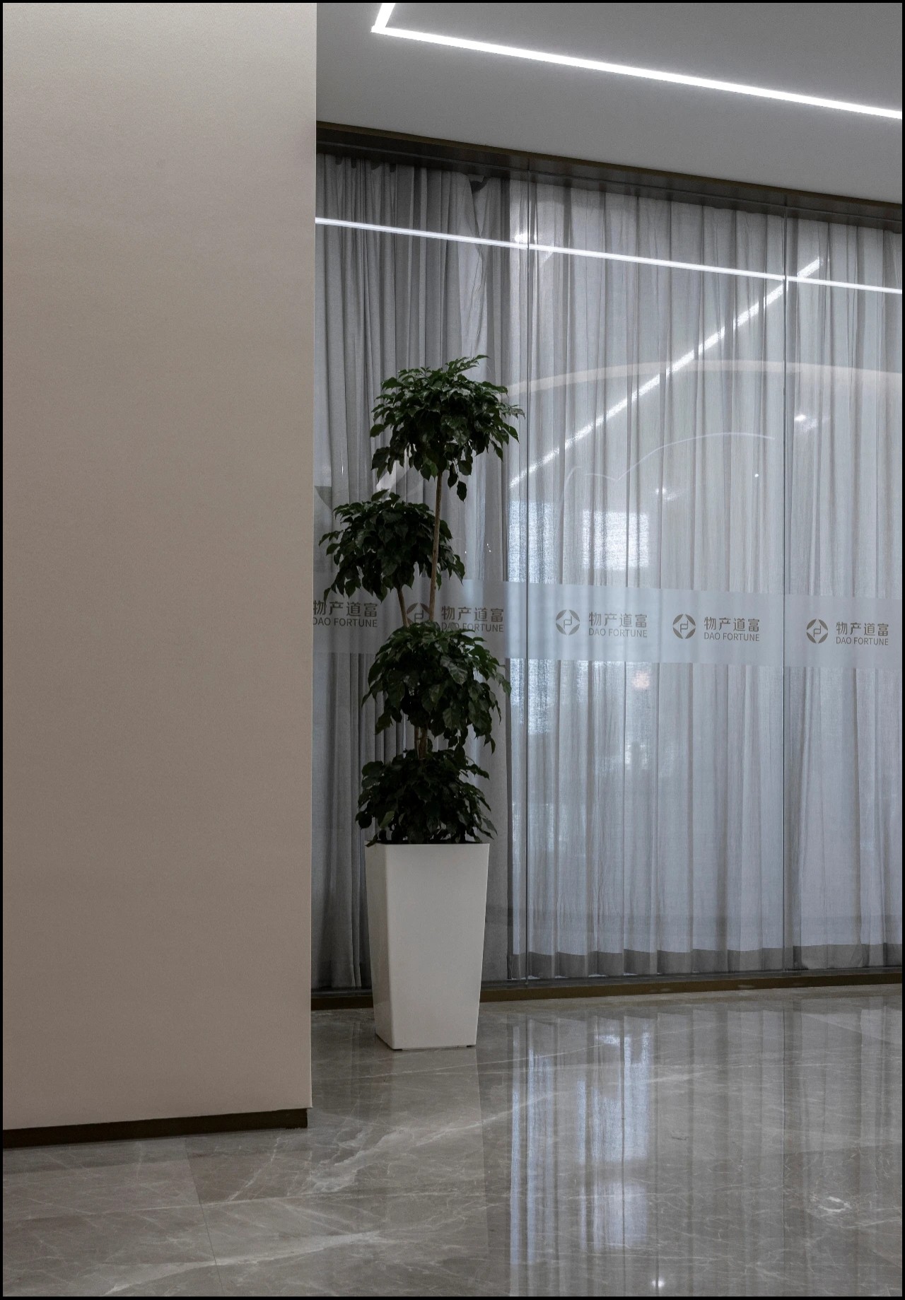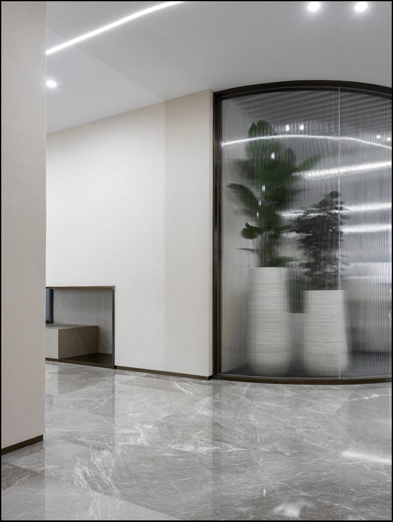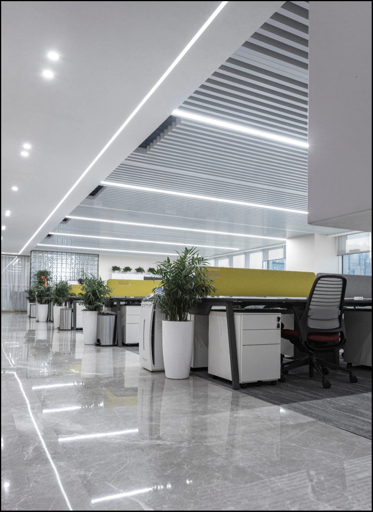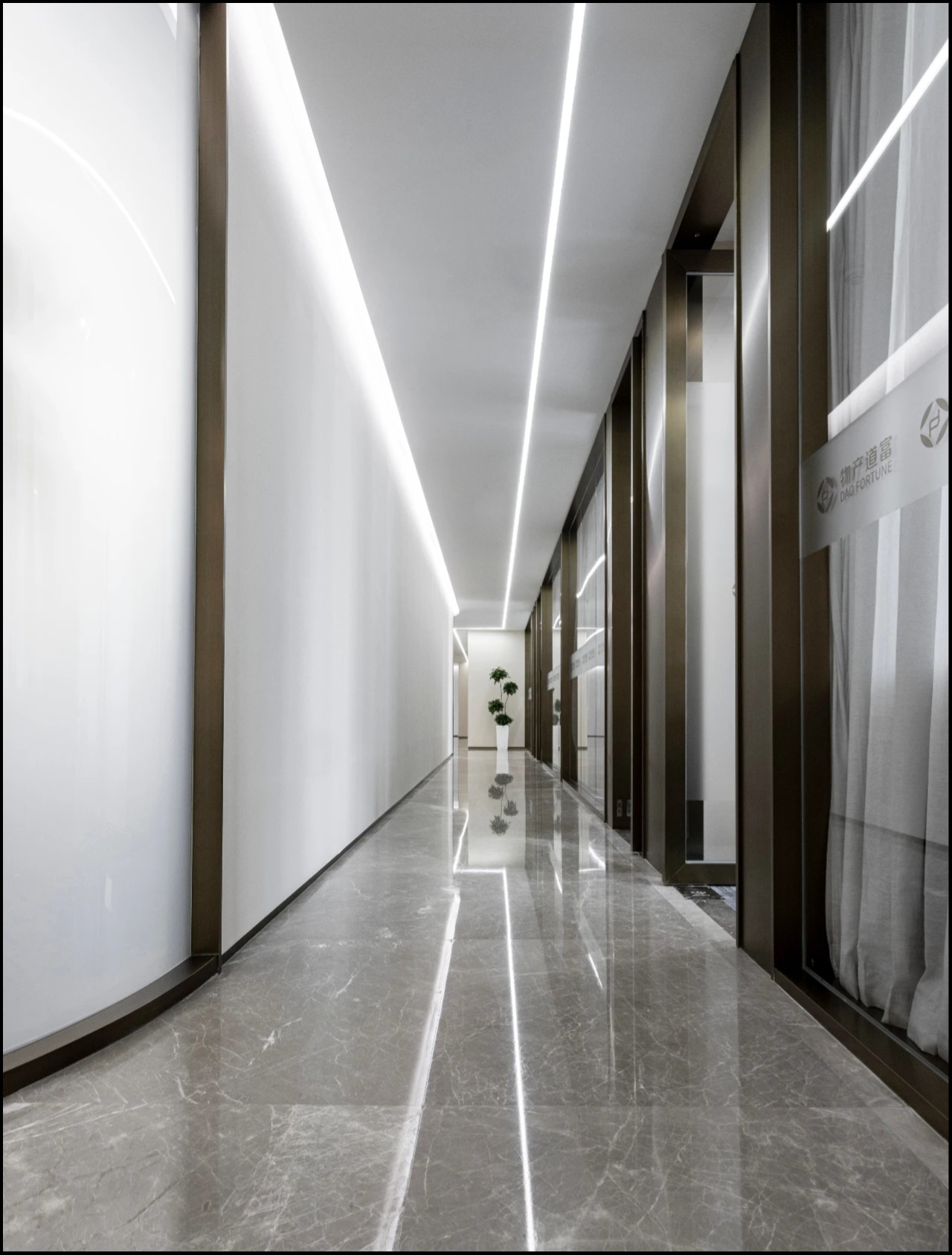 基于对品牌由黑色与白色构建出的“ 清晰”和“纯粹” 调性的认知,设计师采用与品牌标识相关的黑色镜面玻璃作为墙面,平行于墙壁的材料布局覆盖了结构柱、强化了空间的线性分离。