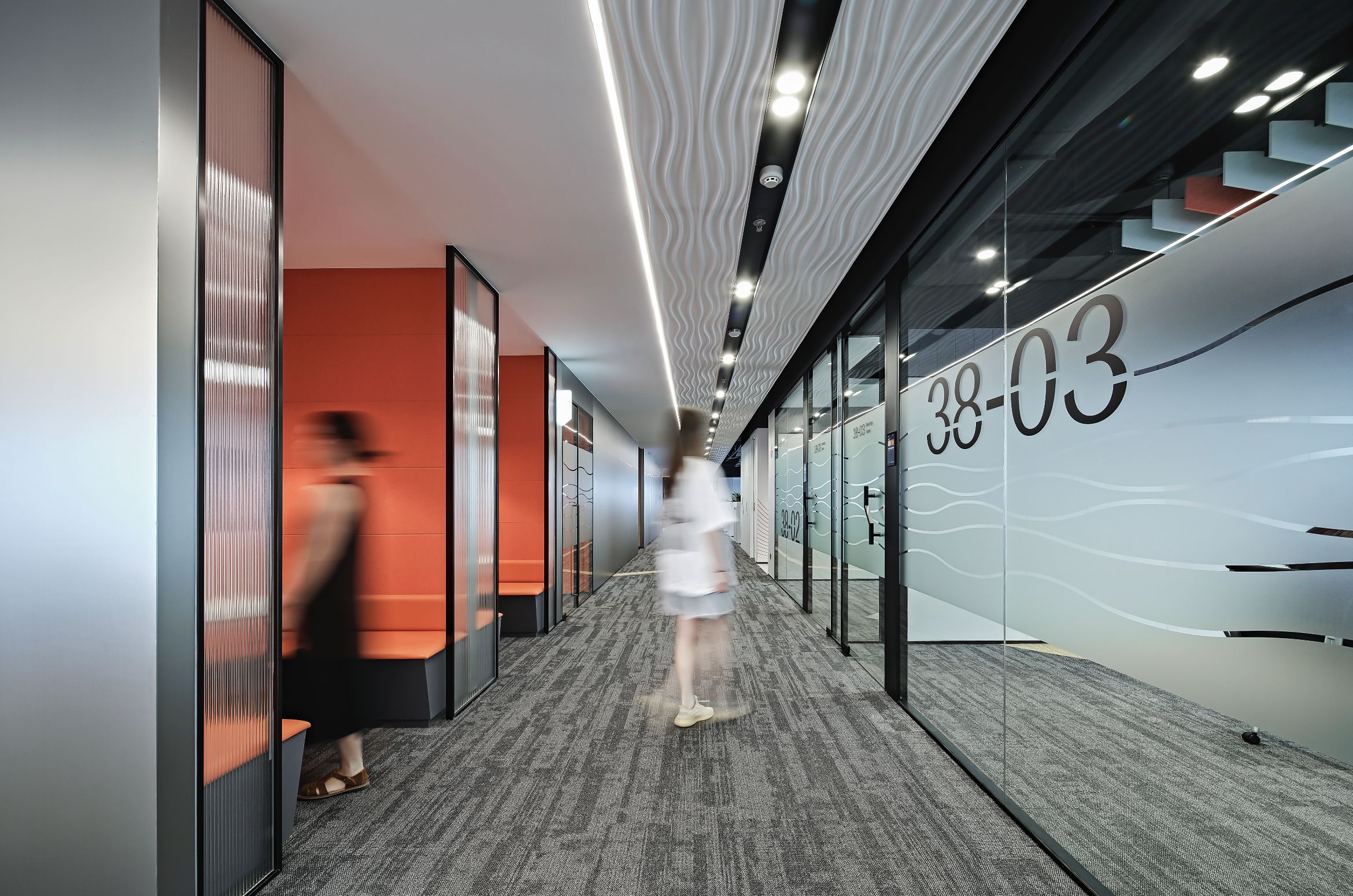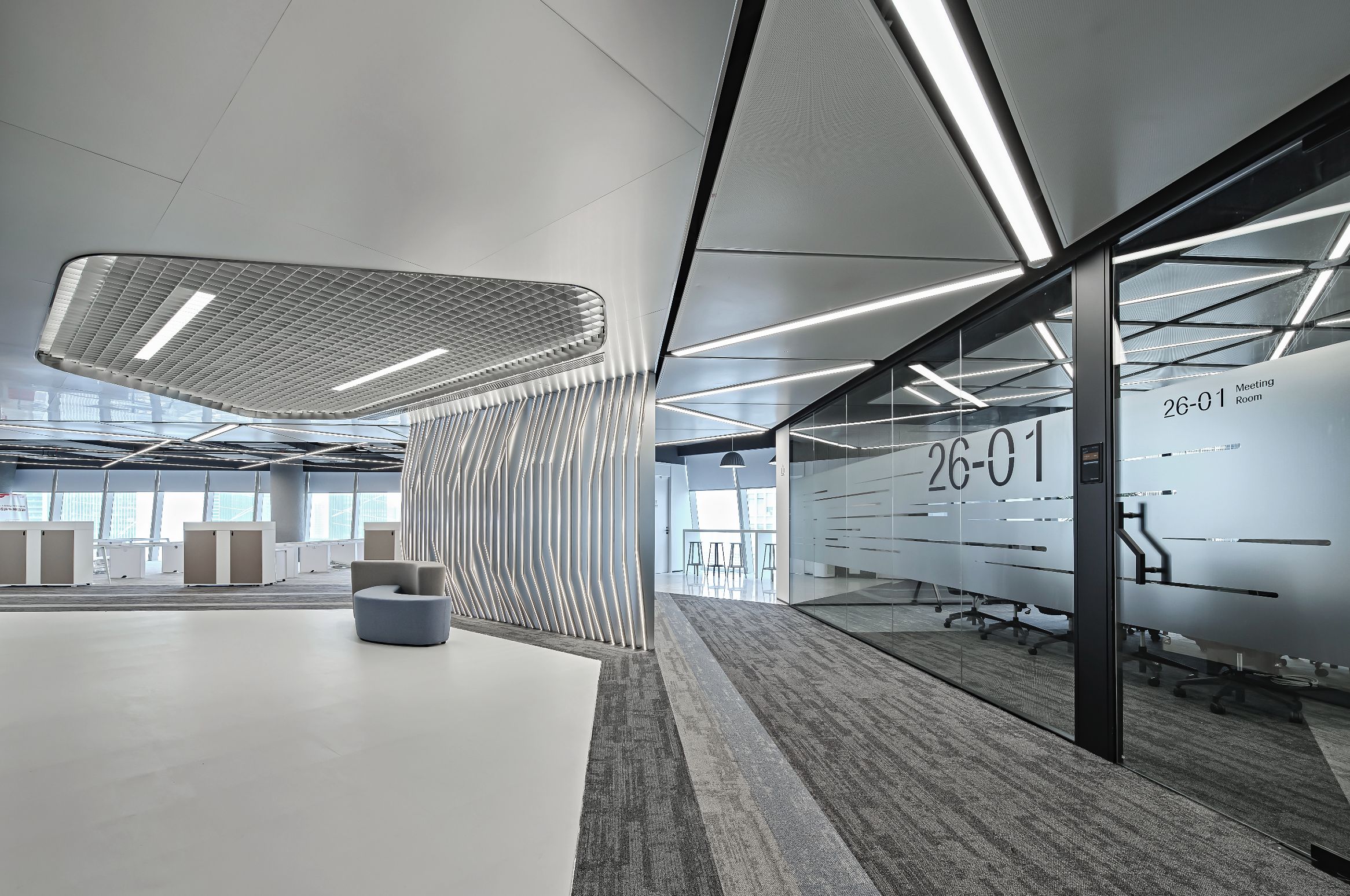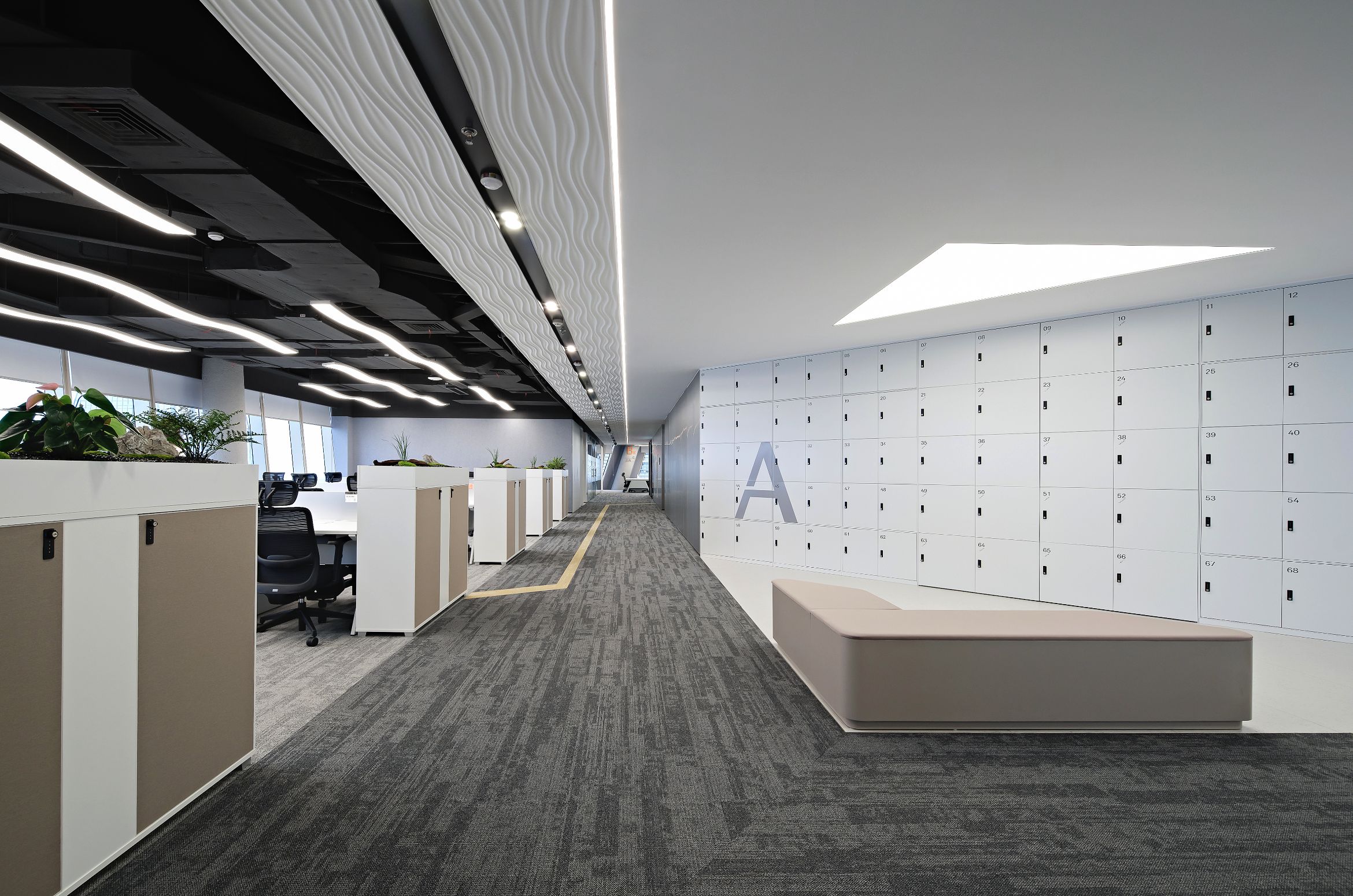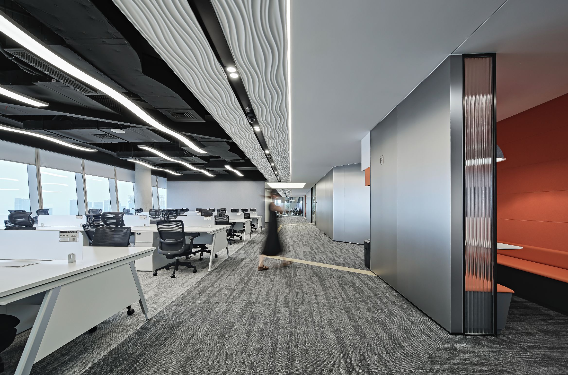四区作为另一个主要办公区和综合功能区,活动场景丰富,人员流动大,设计采用“水”的流畅舒缓的流线型元素,为员工提供一个活泼舒适、疏解紧张情绪的办公环境。