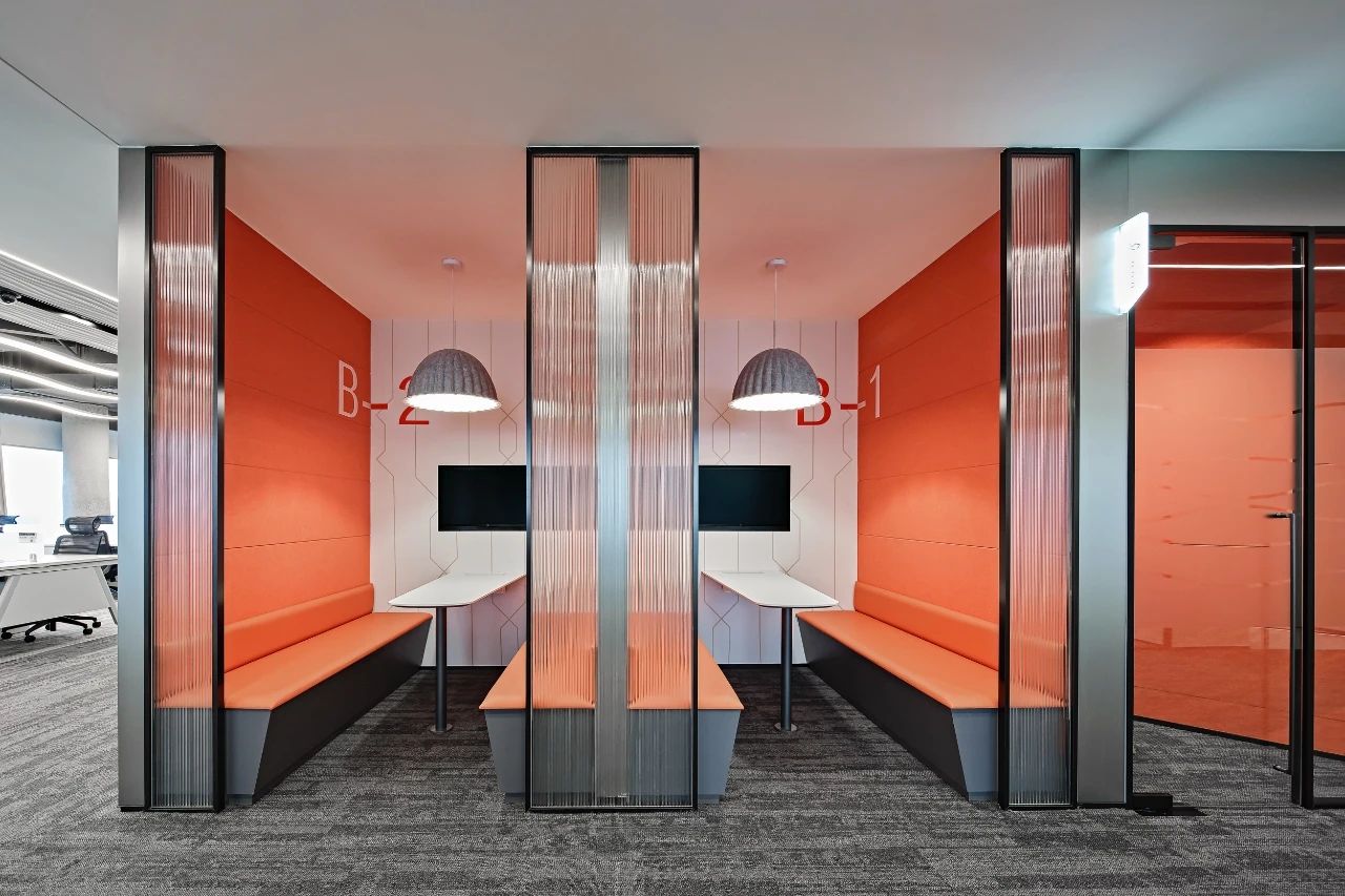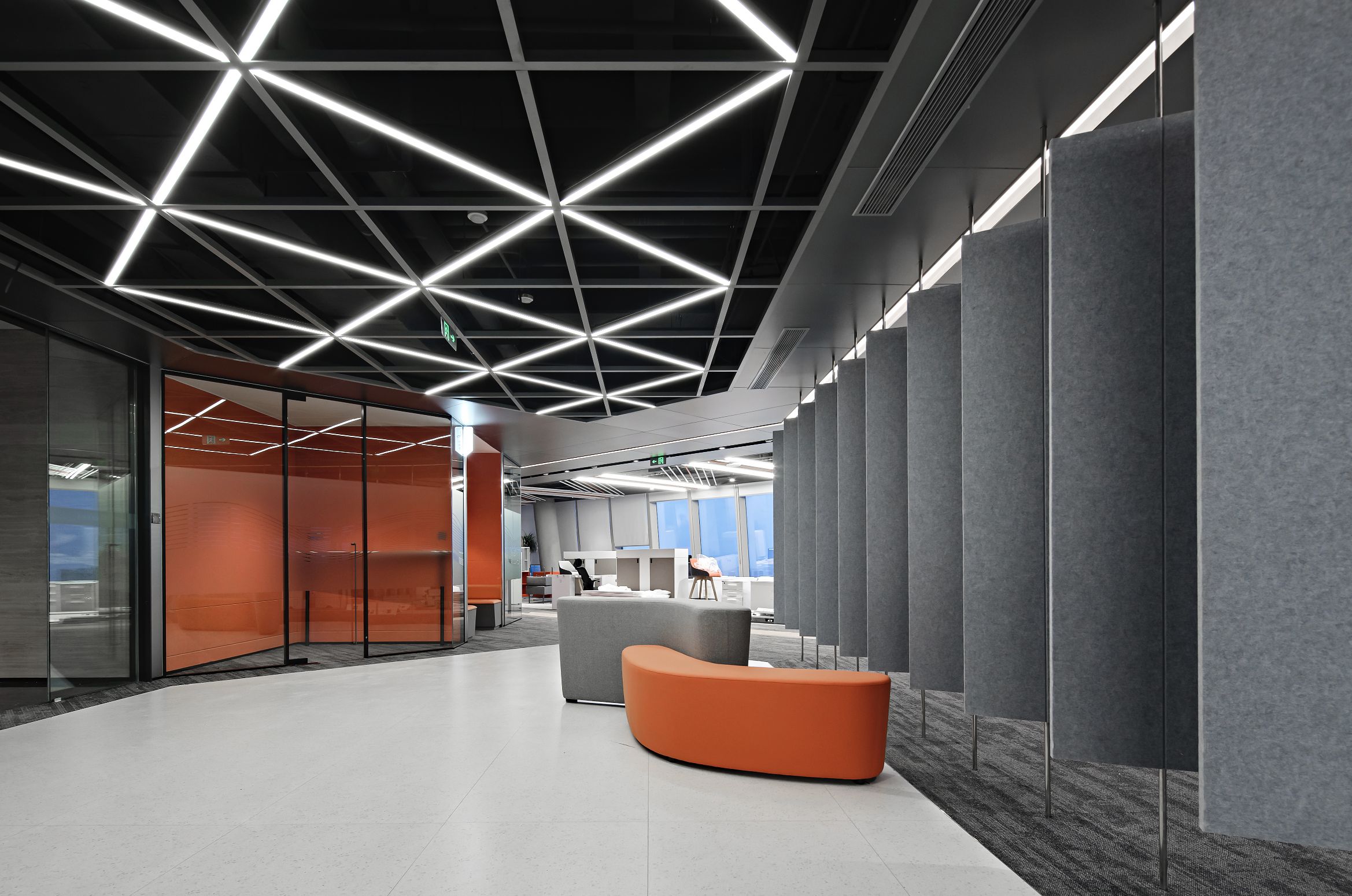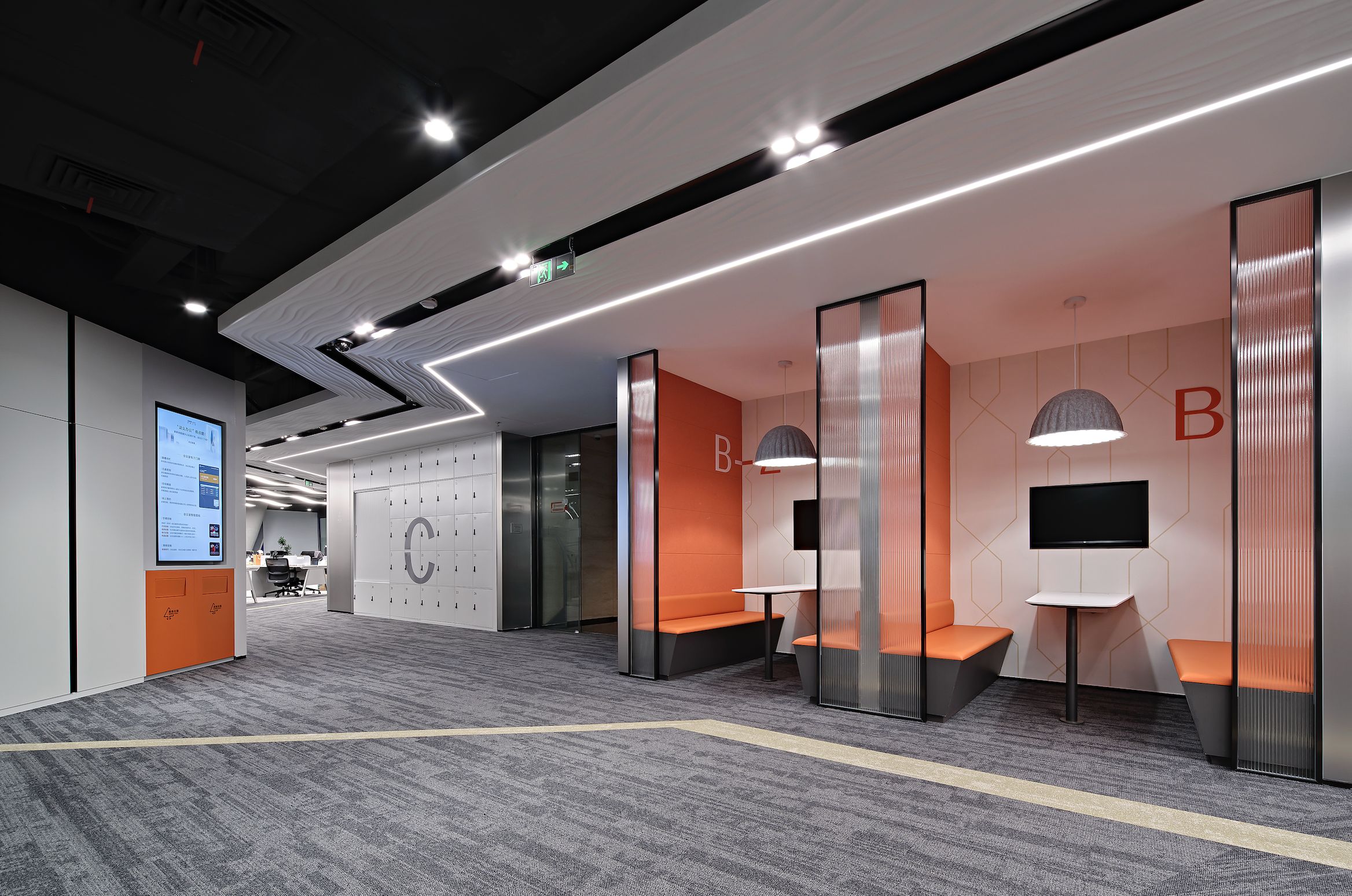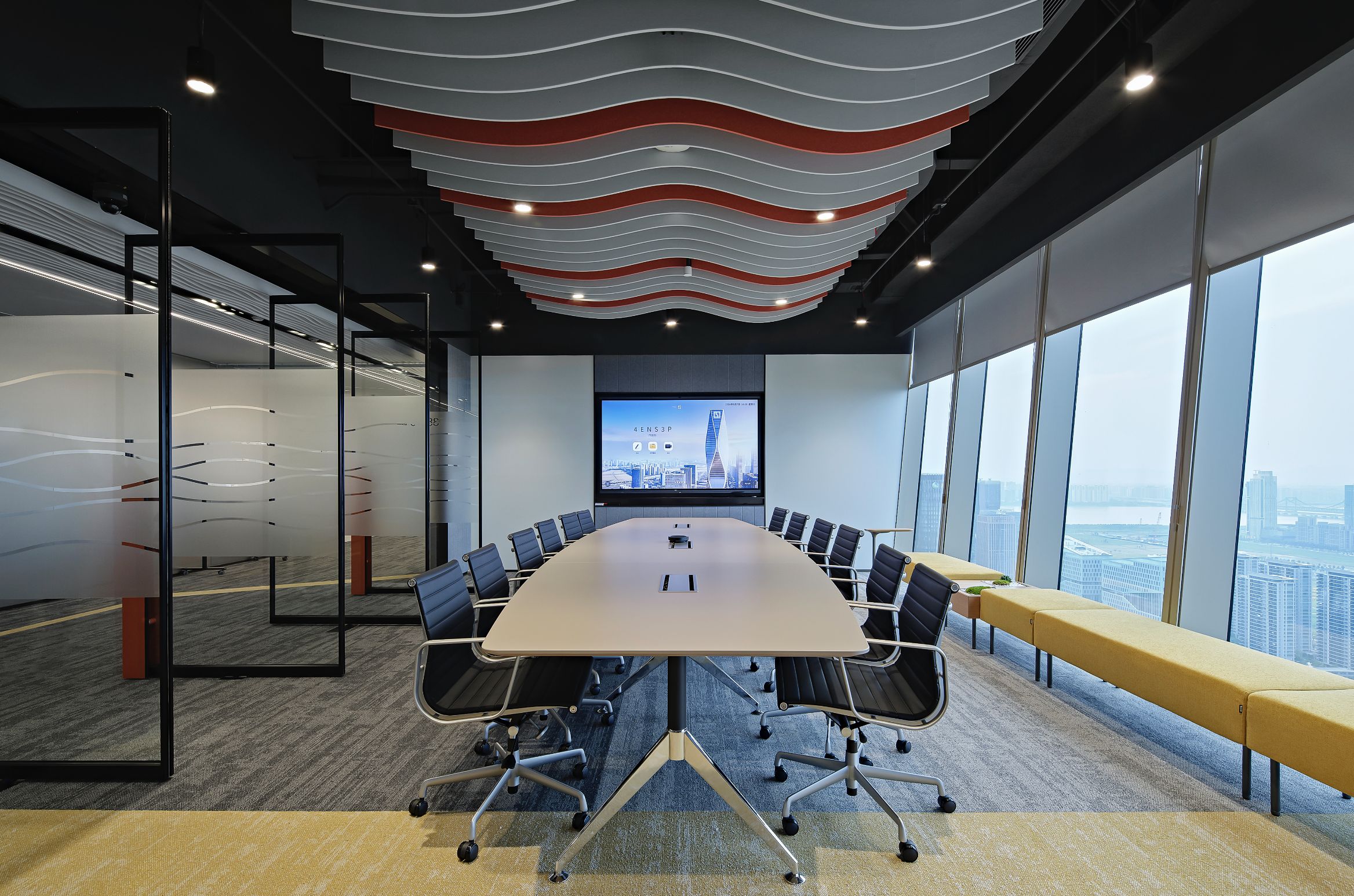 四区作为另一个主要办公区和综合功能区,活动场景丰富,人员流动大,设计采用“水”的流畅舒缓的流线型元素,为员工提供一个活泼舒适、疏解紧张情绪的办公环境。