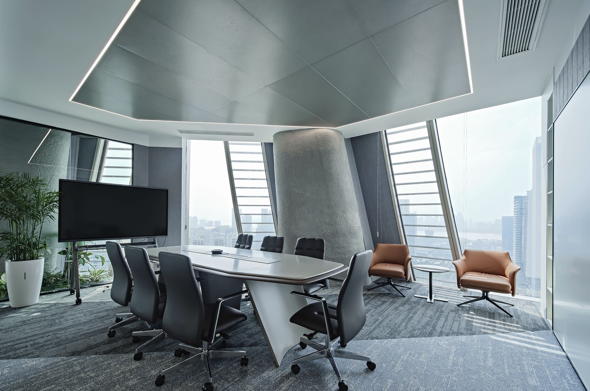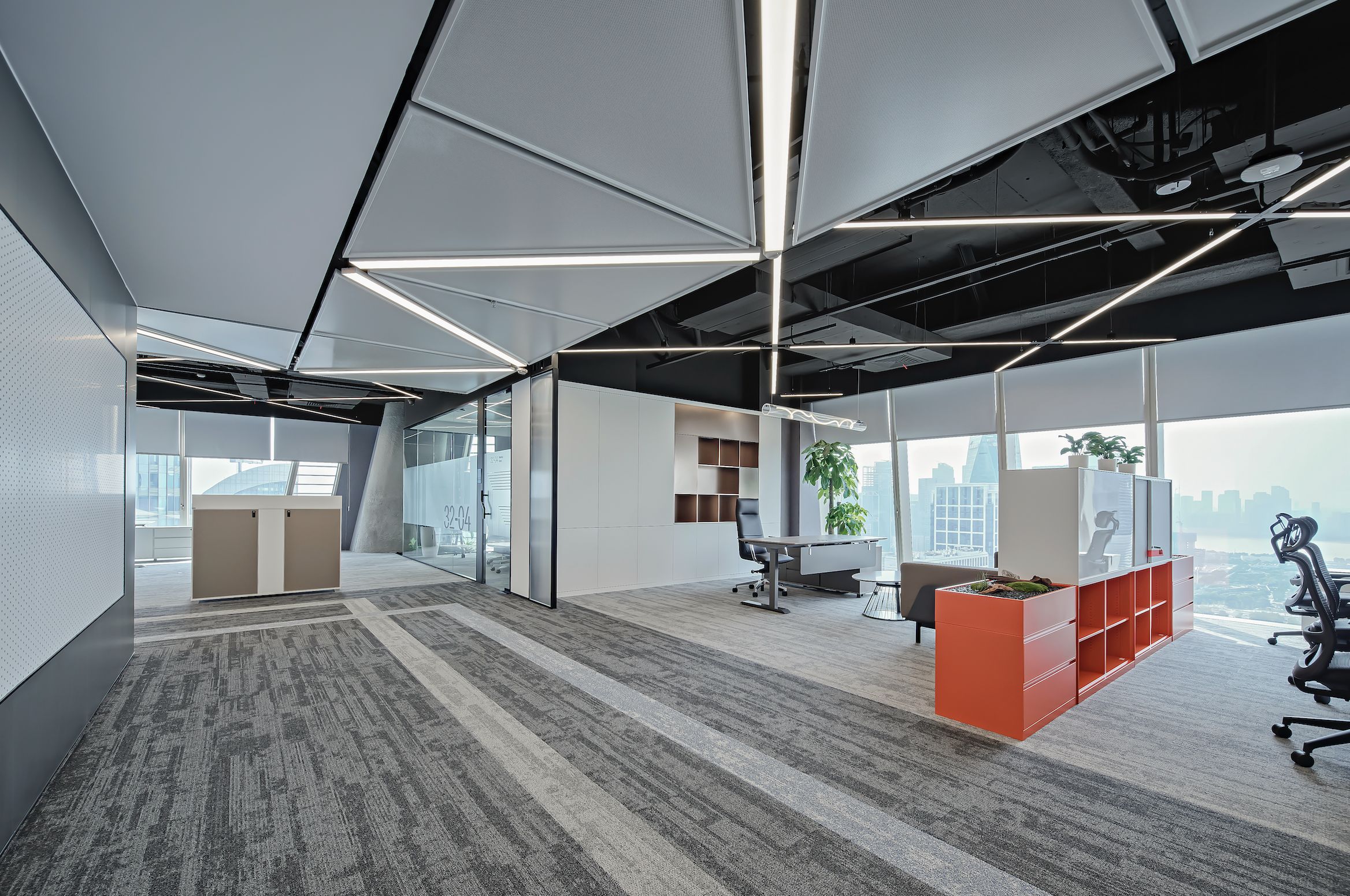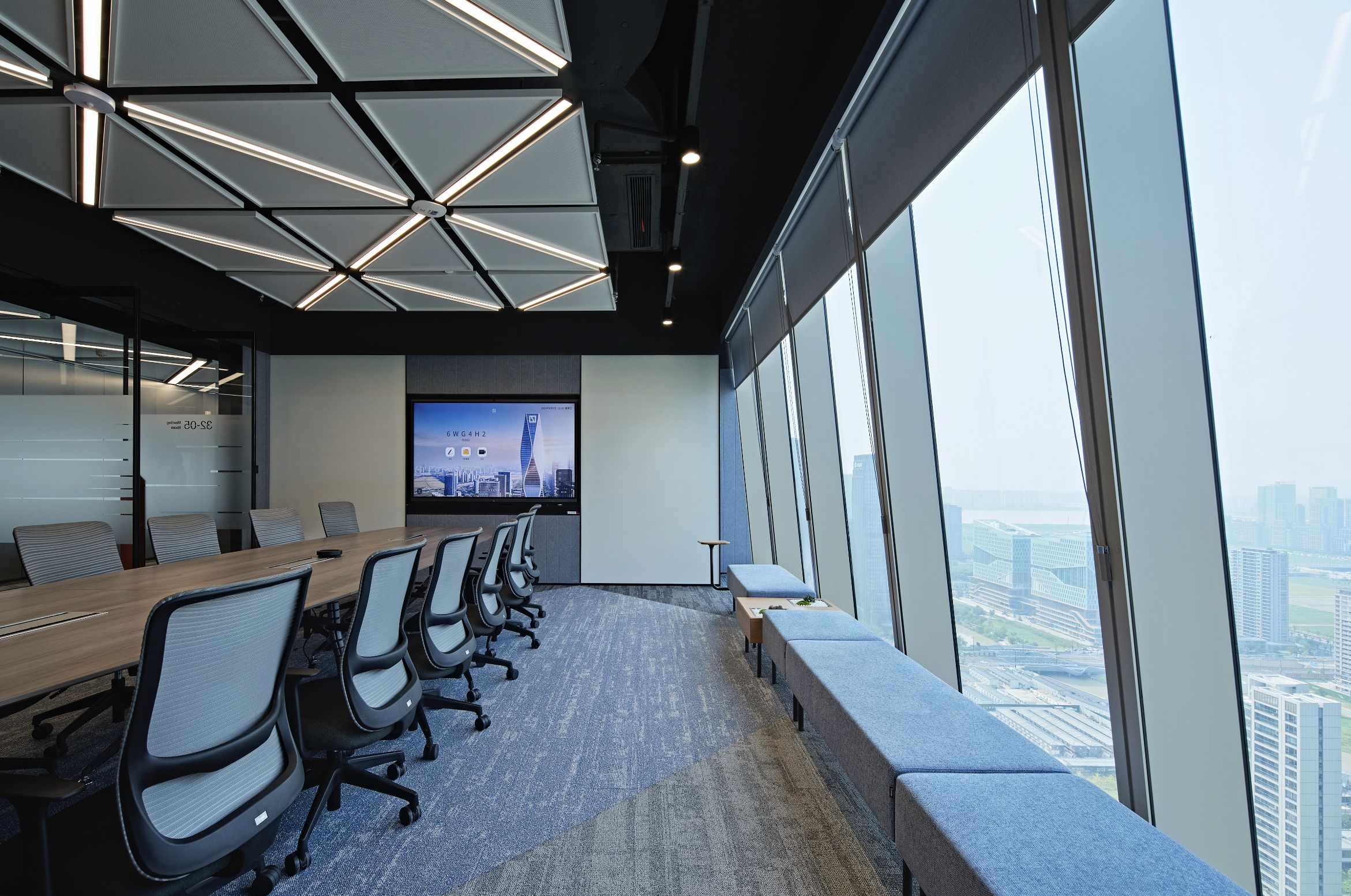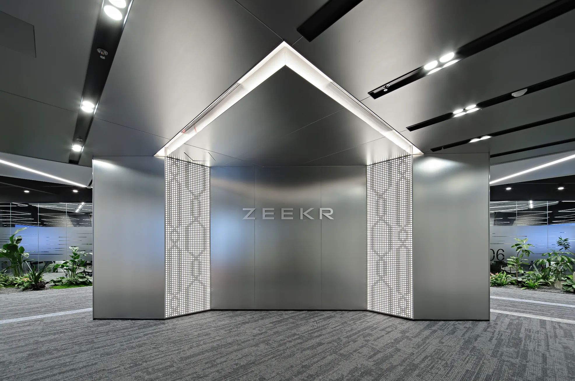 五区高管层设计中则融入了“风”元素,直线造型如顺风般引导视线,倒角和折角元素则体现了无形之风中柔和的力量感。同时,光水风都是产生电能的清洁能源,寓意着极氪的员工也像光水风一样为极氪产生源源不断的电量。