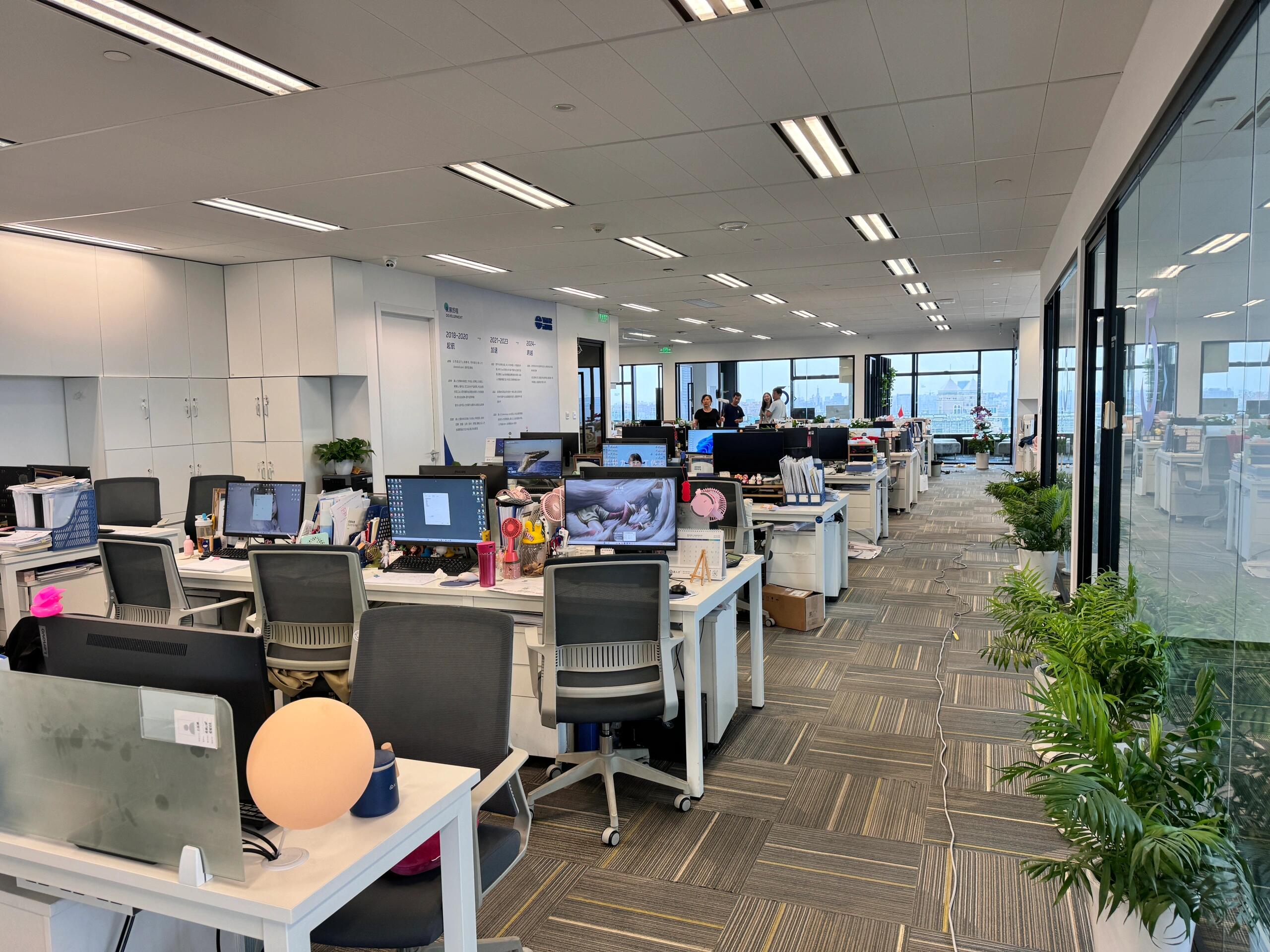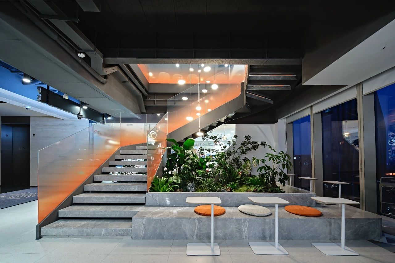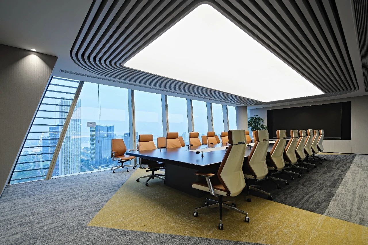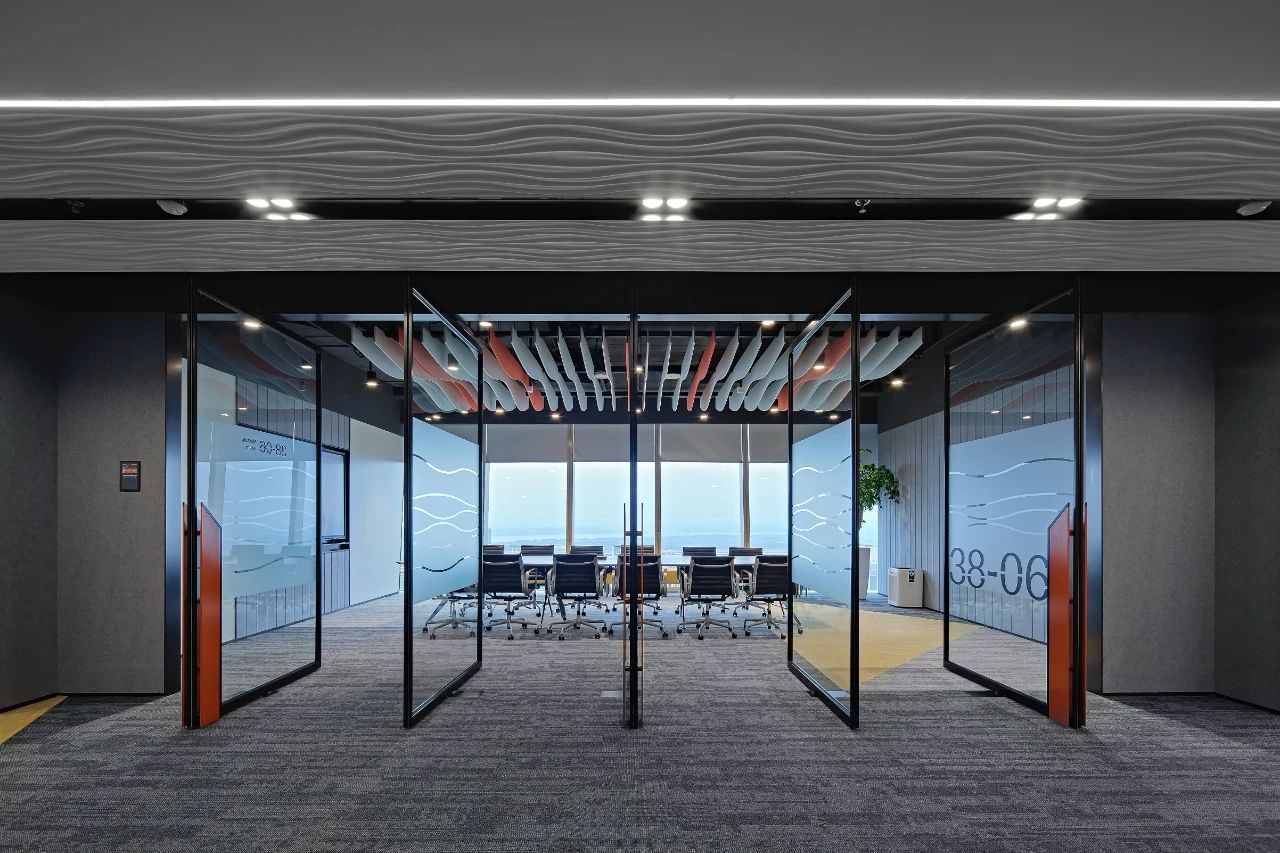 五区高管层设计中则融入了“风”元素,直线造型如顺风般引导视线,倒角和折角元素则体现了无形之风中柔和的力量感。同时,光水风都是产生电能的清洁能源,寓意着极氪的员工也像光水风一样为极氪产生源源不断的电量。