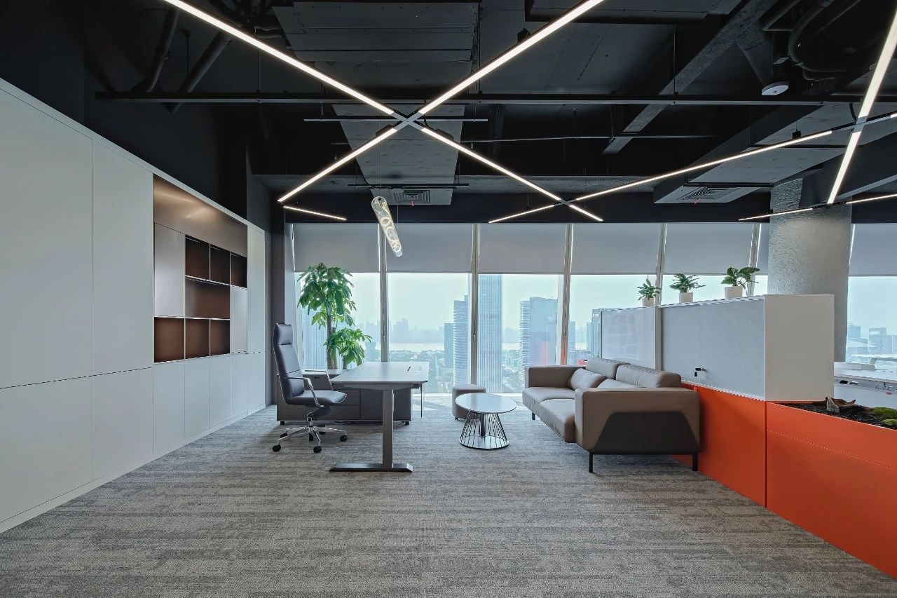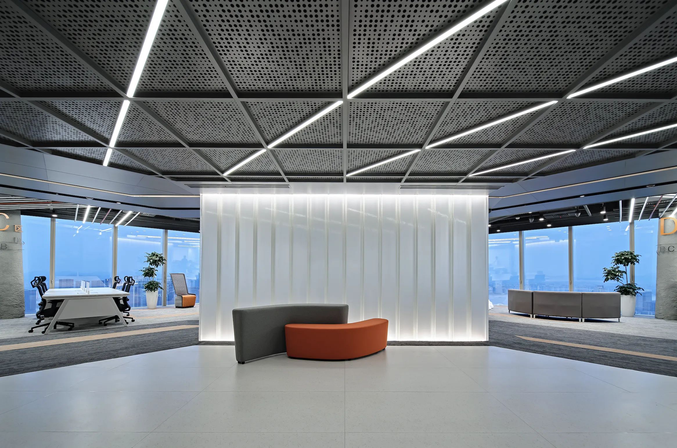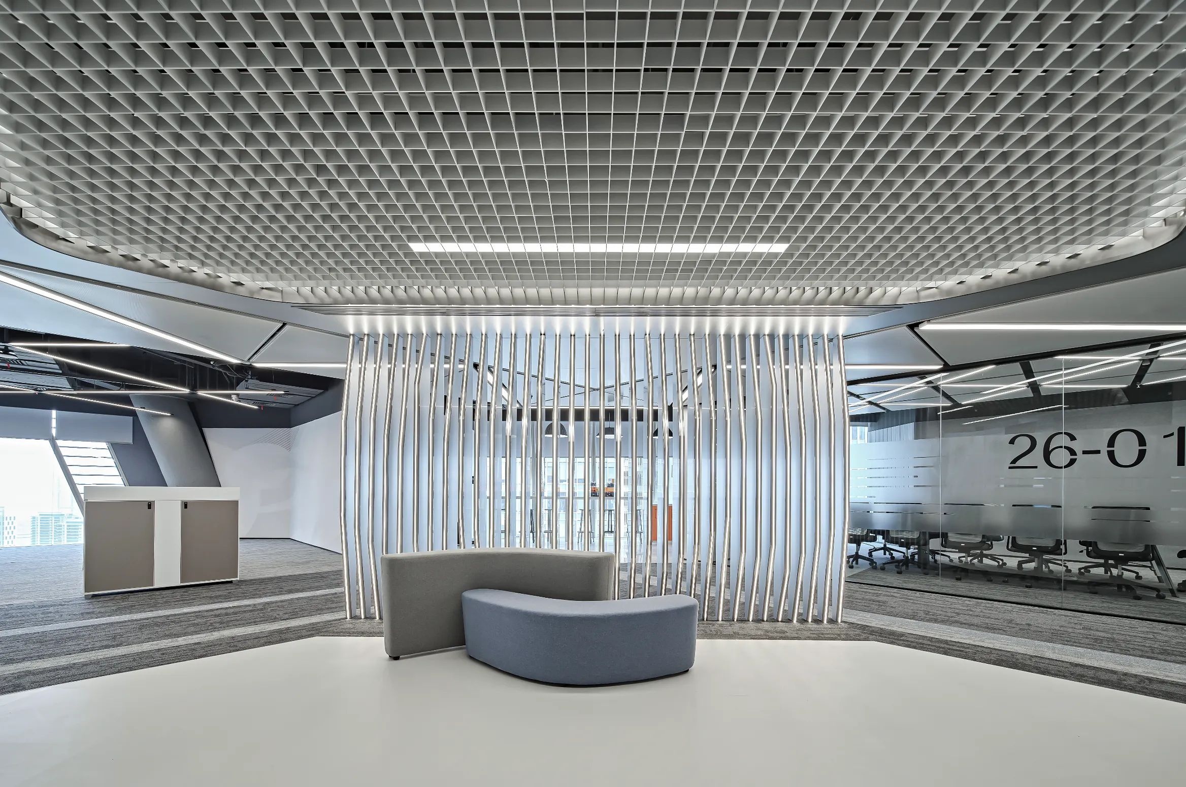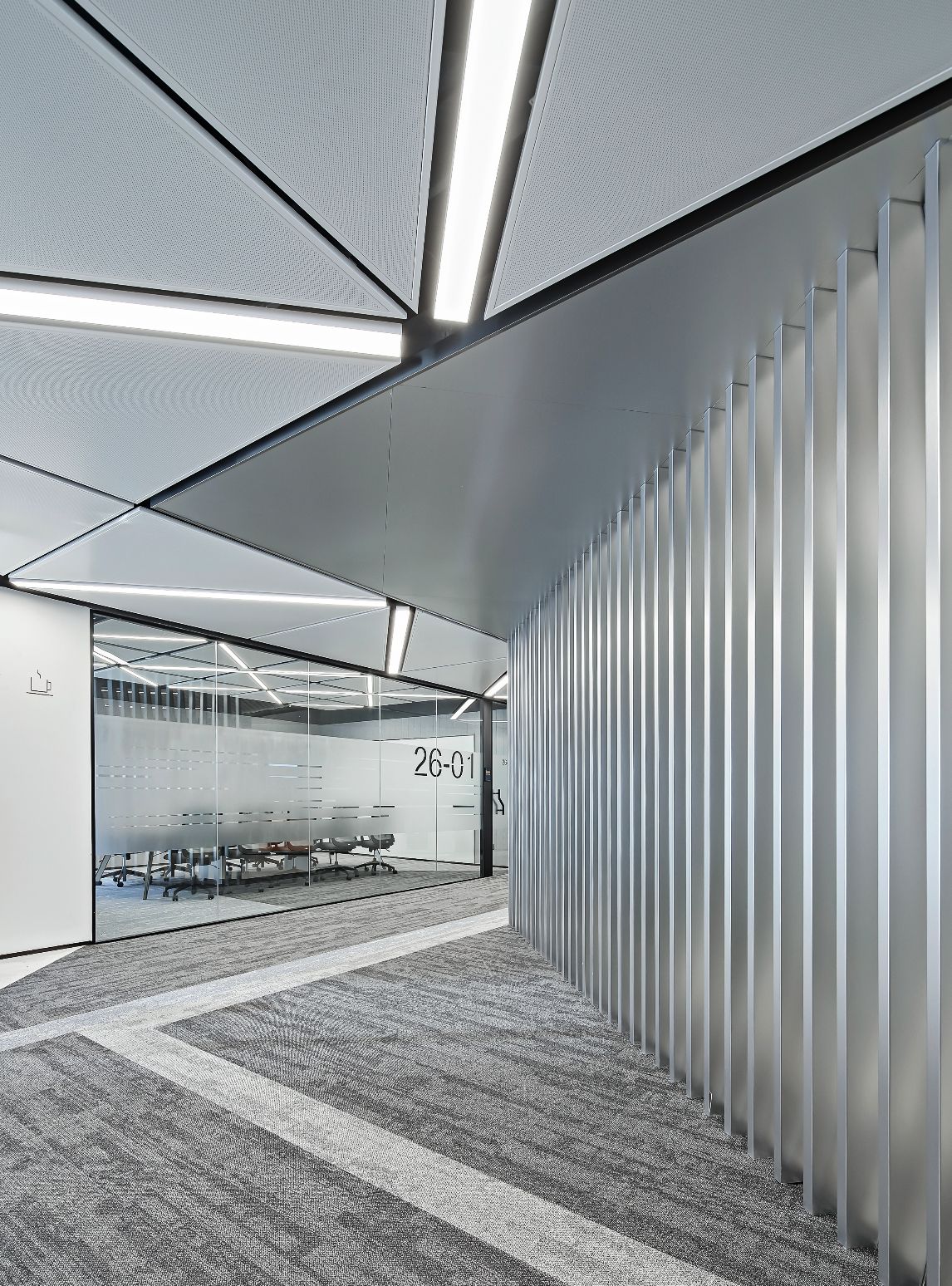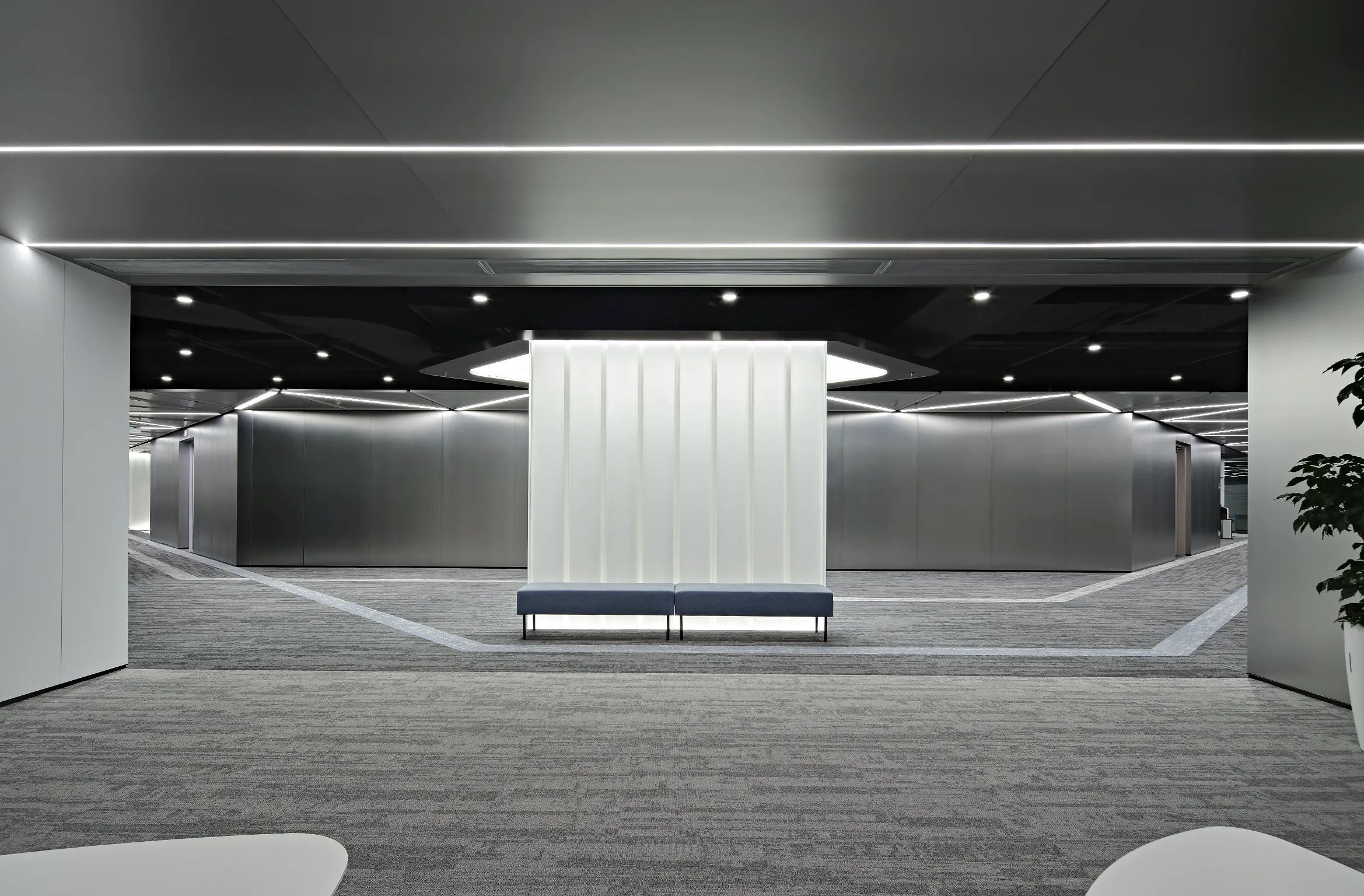 行政中心不仅是一个功能强大且开敞对外的办公空间,还通过室内设计呈现极氪品牌主旨,金属感材料、反光材料、线条光和彩色点缀的应用,让办公室成为具有未来感和个性的总部办公场所,给来访者留下深刻的第一印象,我们将行政中心打造为一个信息中转和存储的空间站。