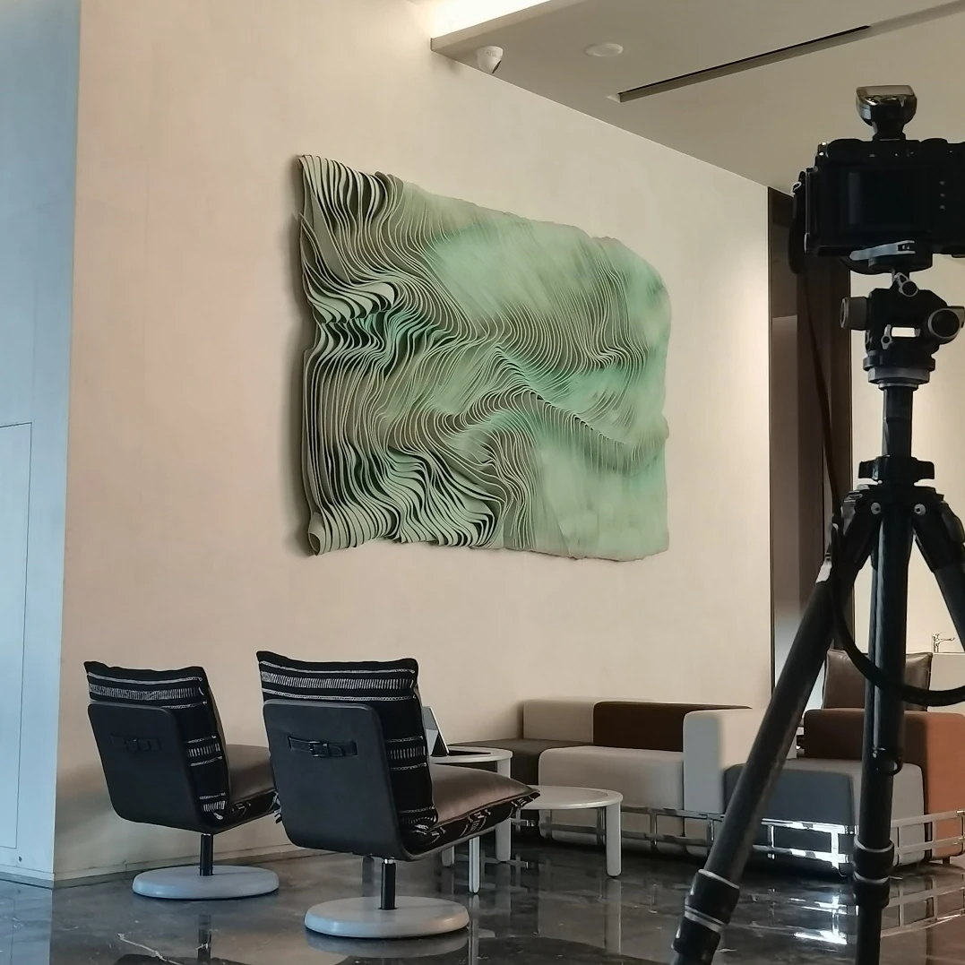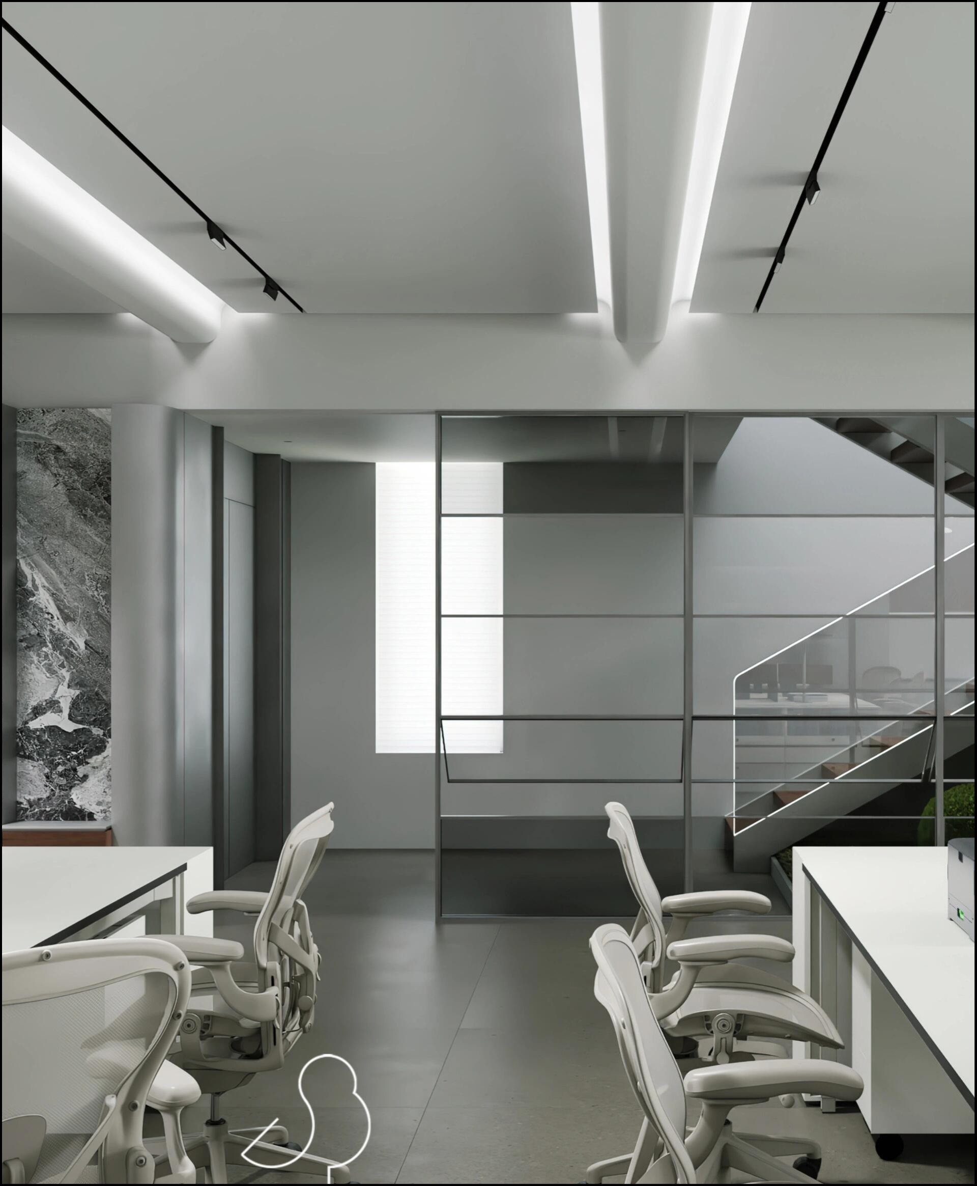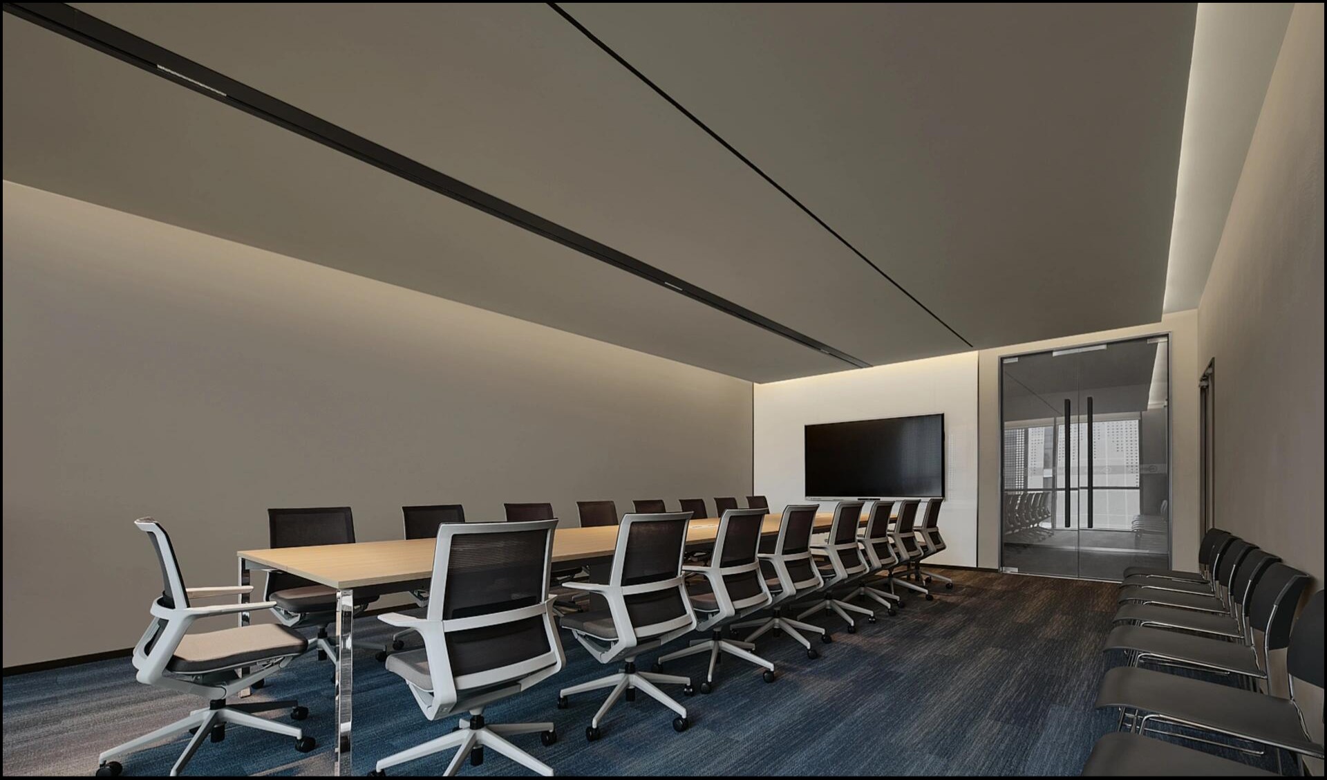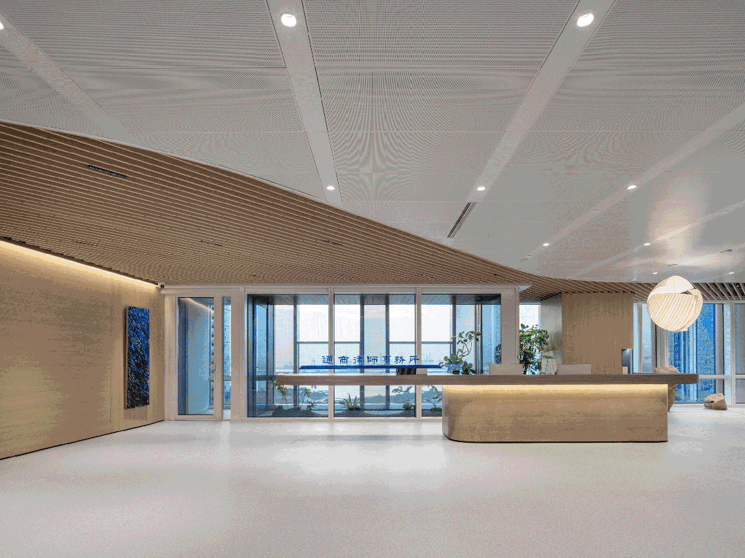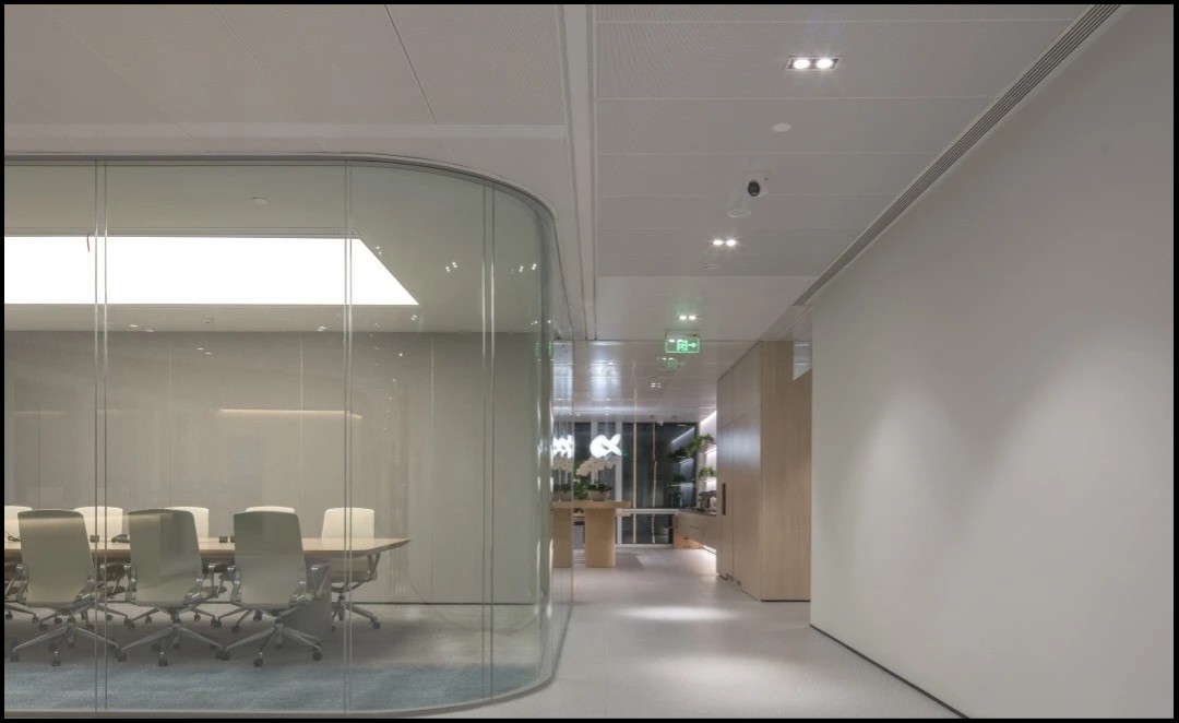 走进前厅大堂,首先映入我们眼帘的就是我们的独特玻璃房子,渐变的地毯如海水一般,映射在玻璃墙,搭配浅色会议家具,犹如在海水中轻盈,自在。