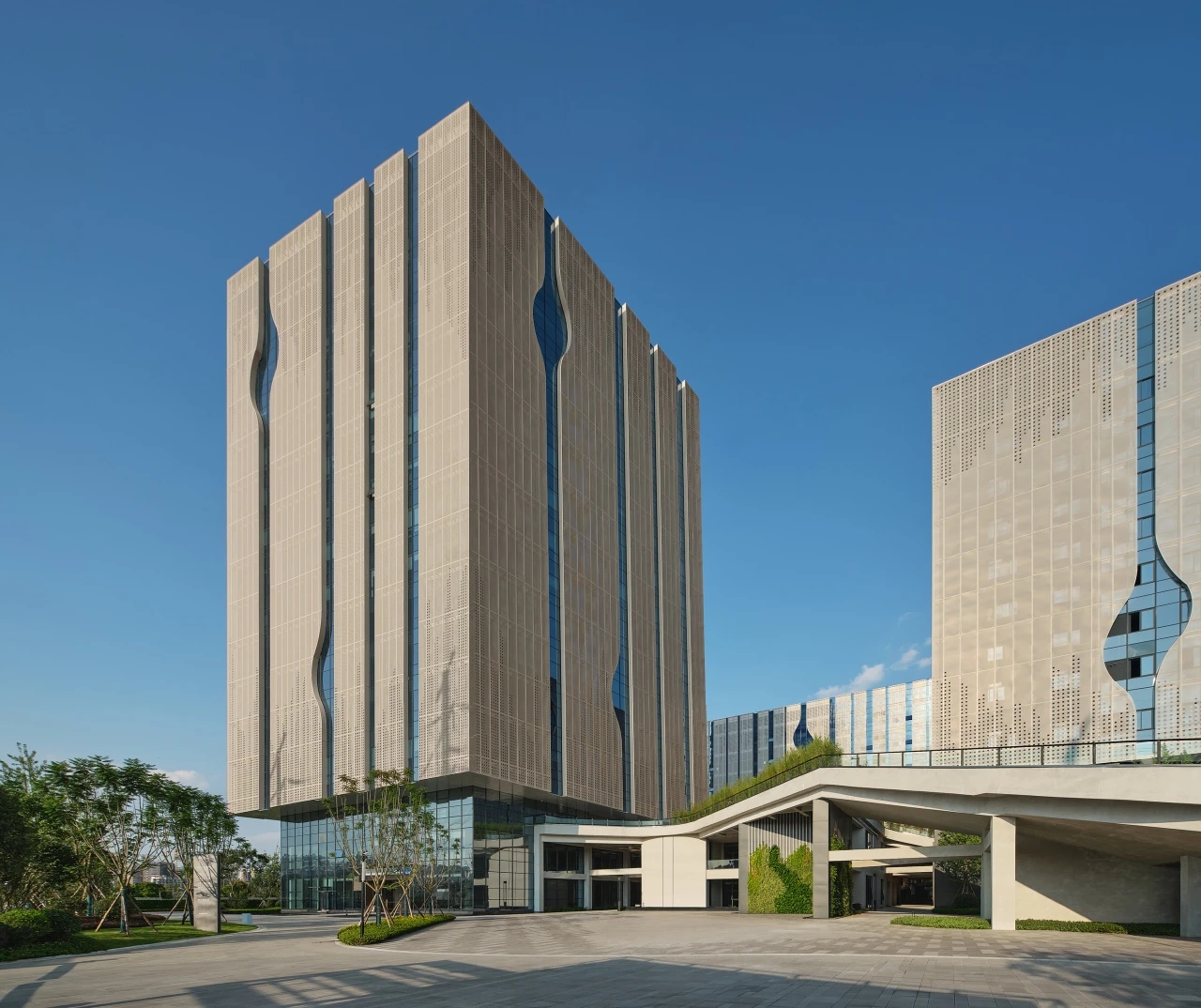 园区的整体外观建筑群设计,上城设计事务所运用不规则的曲直线,有秩序感的加以排列组合。细看穿孔铝板上的不规则“缺口”,既像是无线电波的浮动波形,又如同芯片主板上连通的线路结点,与其专注于信息传播的企业主业形成了完美的呼应。