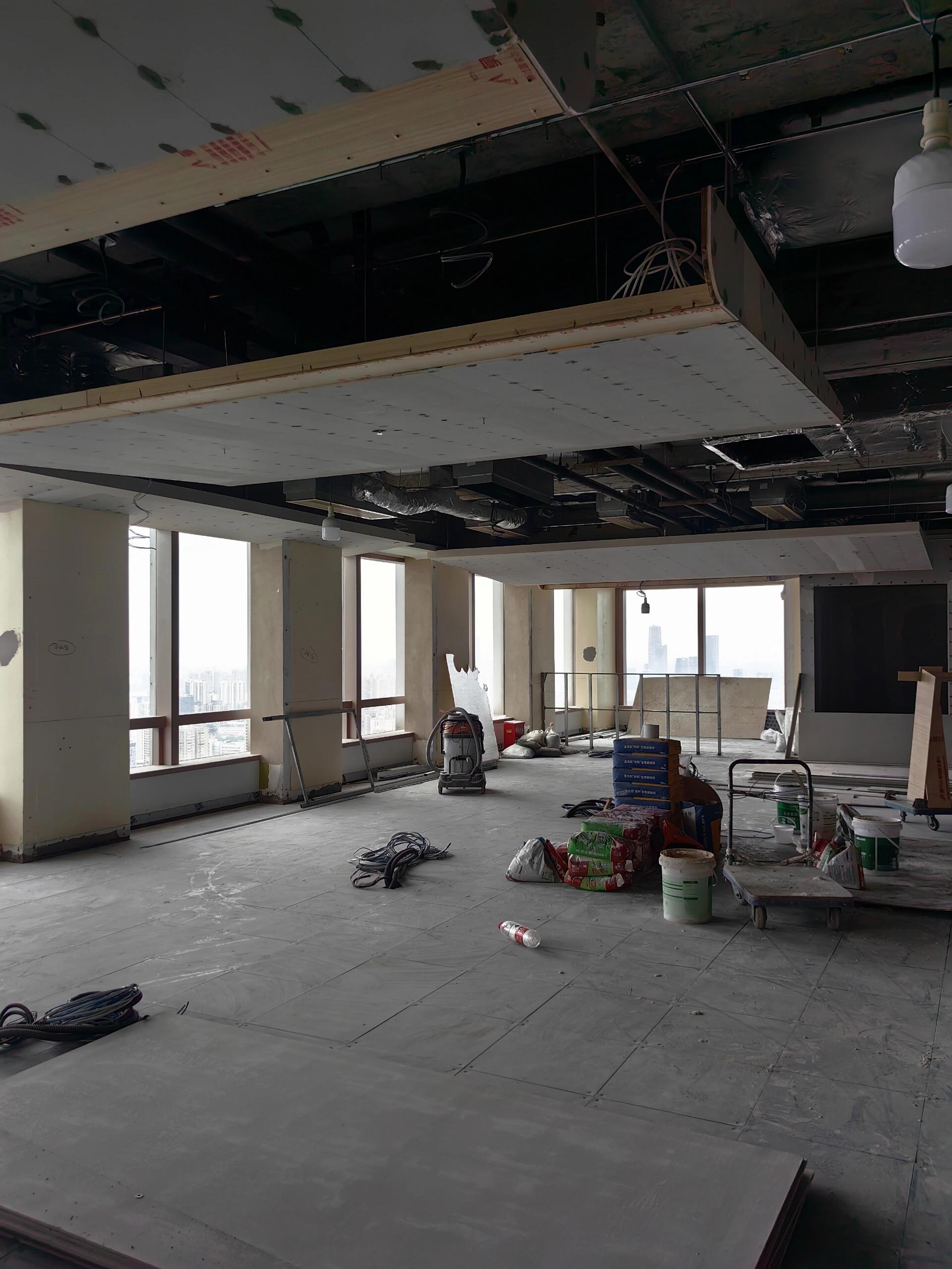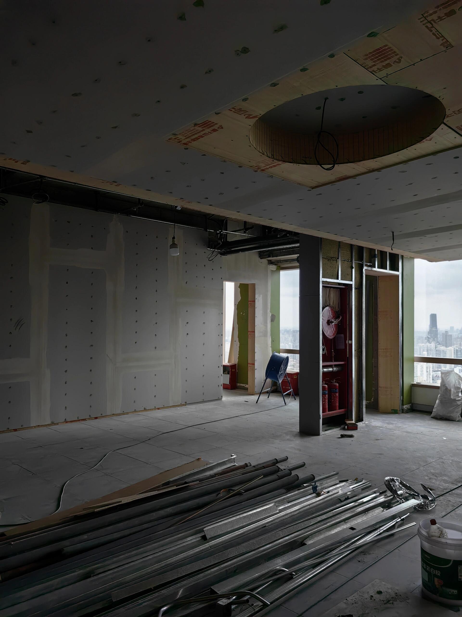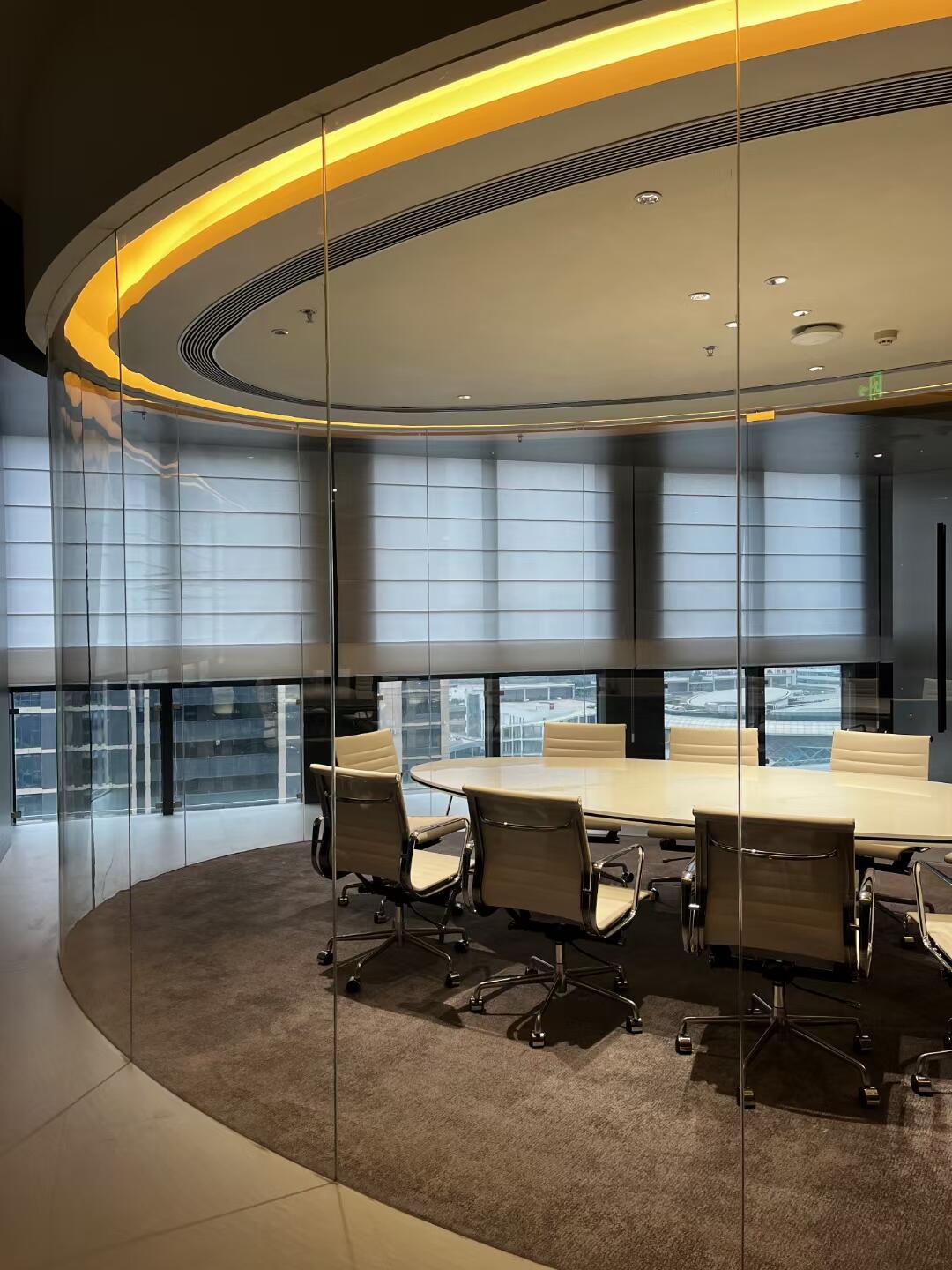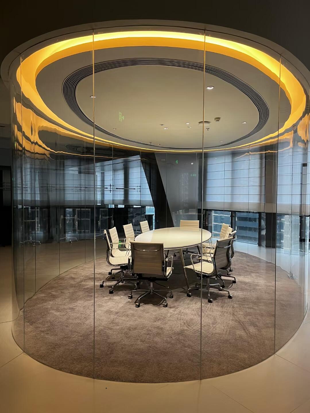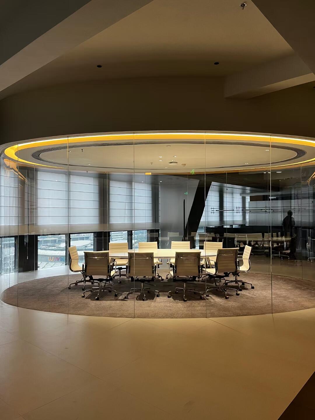 打造互动式会议室,立体圆形吊顶搭载灯光系统顺势垂下,与下方的U形会议桌构成形态呼应,周遭以通透玻璃作为区域隔断,既保证区域互动,又让会议室保持本身的独立。