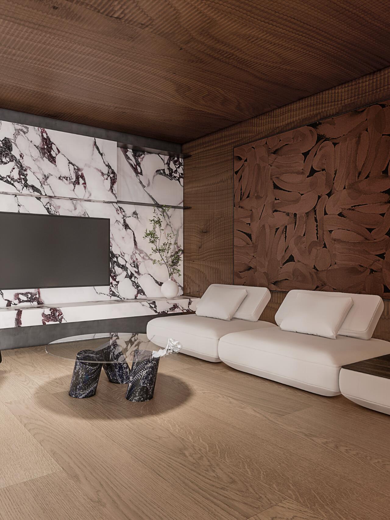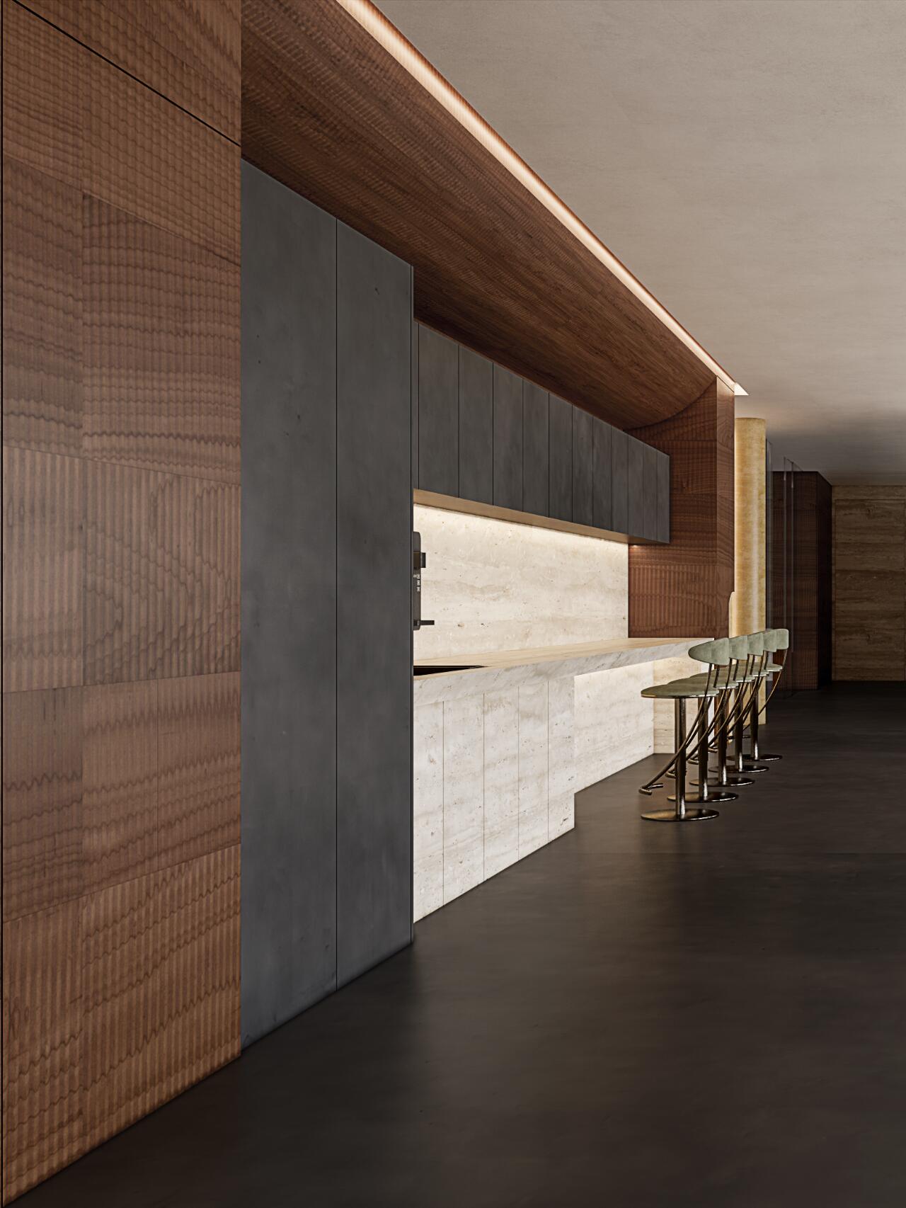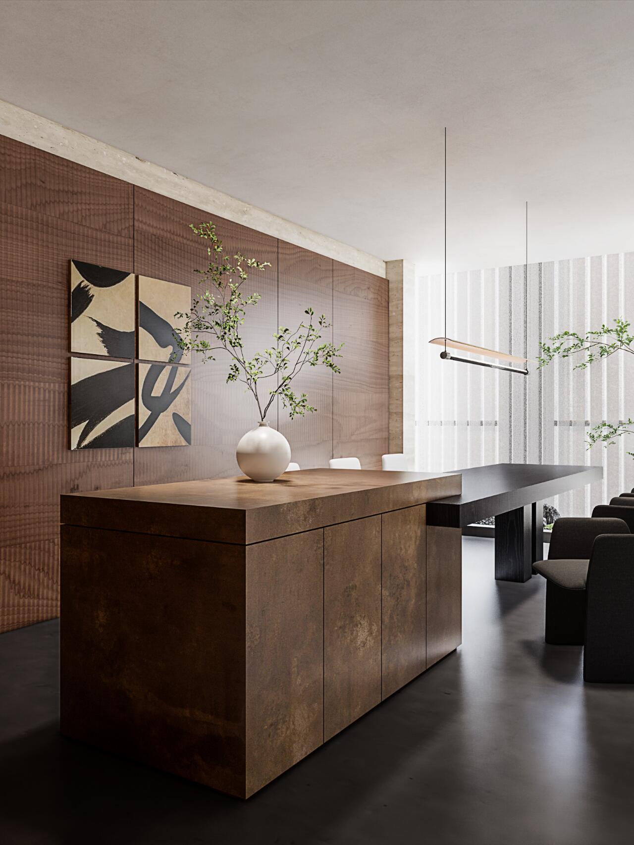 踏入前厅,开阔的空间尺度,自带恢宏气势,干净无痕的前厅岛台,沉稳而不孤冷,与上饰的线条结合,共同构筑一处空且灵净的美学殿堂。