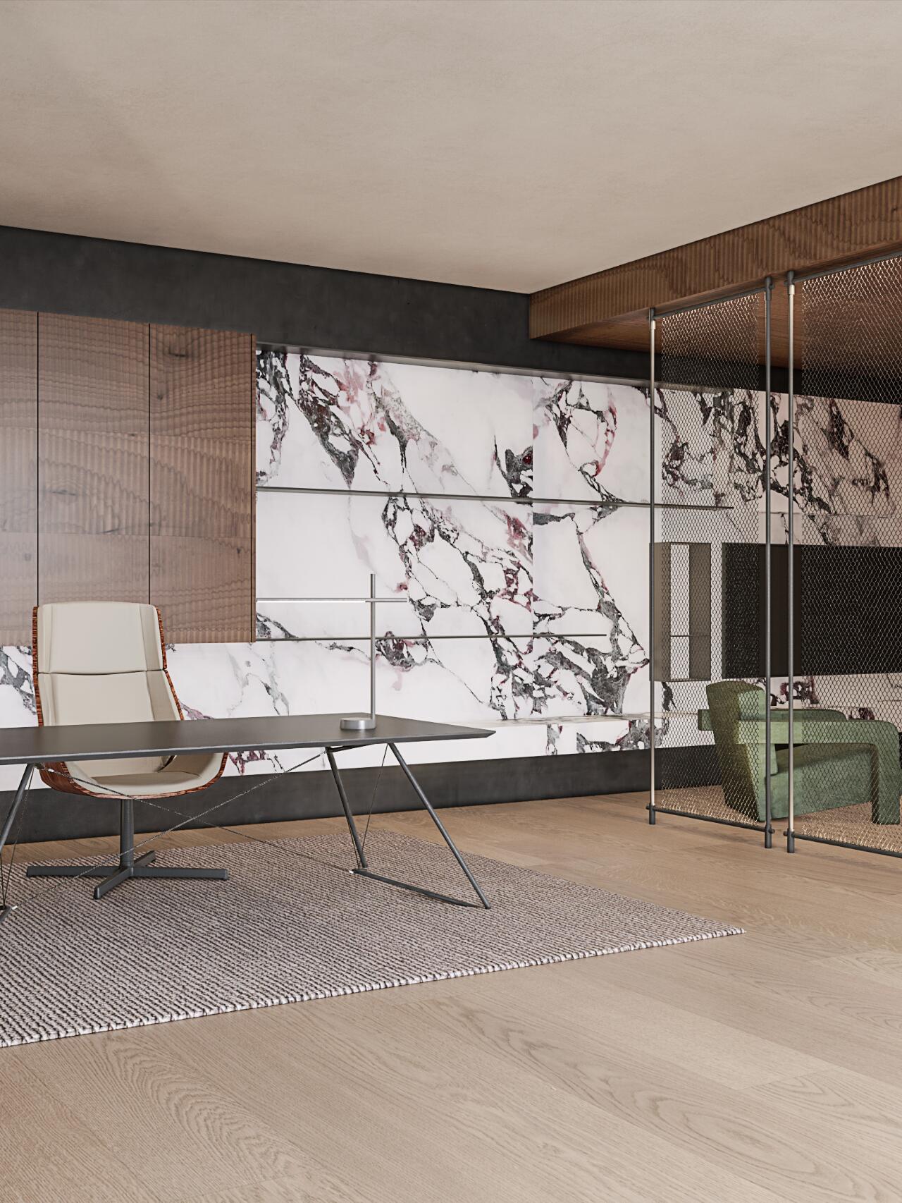 弧线元素的加入,消解了传统会议的拘束感,让与会者不觉间便沉浸至工作当中。弧线还是空间动线的引导者,在会议室形成延续不断的语言符号,人的工作行为也由此展开。