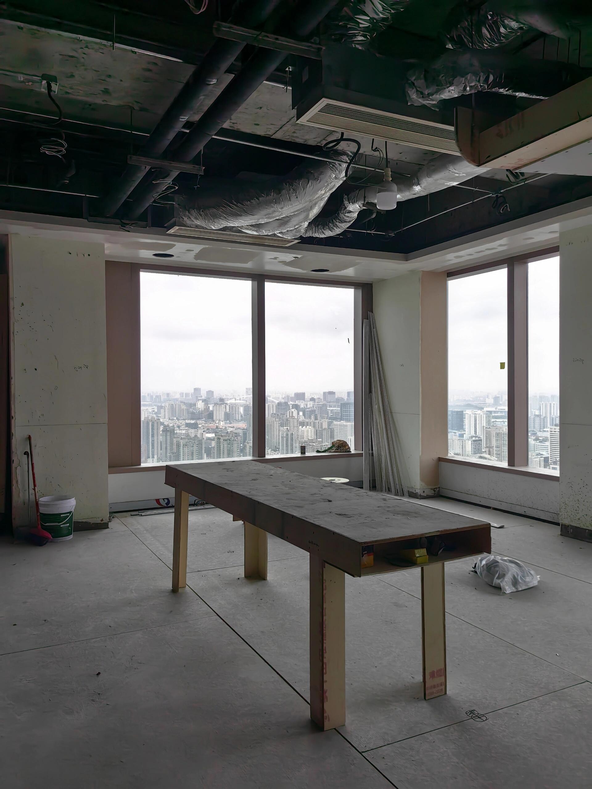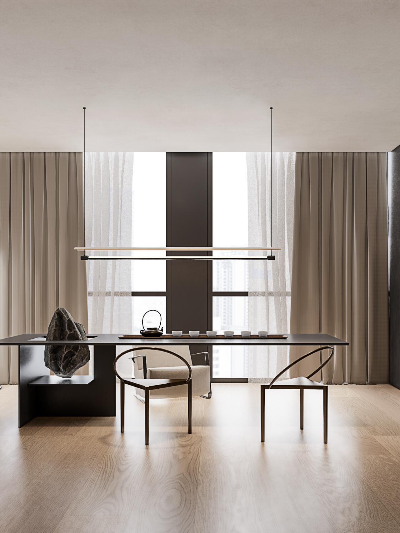 办公空间更注重员工个体的工作需求,黑色办公桌两侧均可布置电脑等办公设备,节约空间,又不会显的过于拥挤。吊灯遵循工位布置,满足工作照明需求。