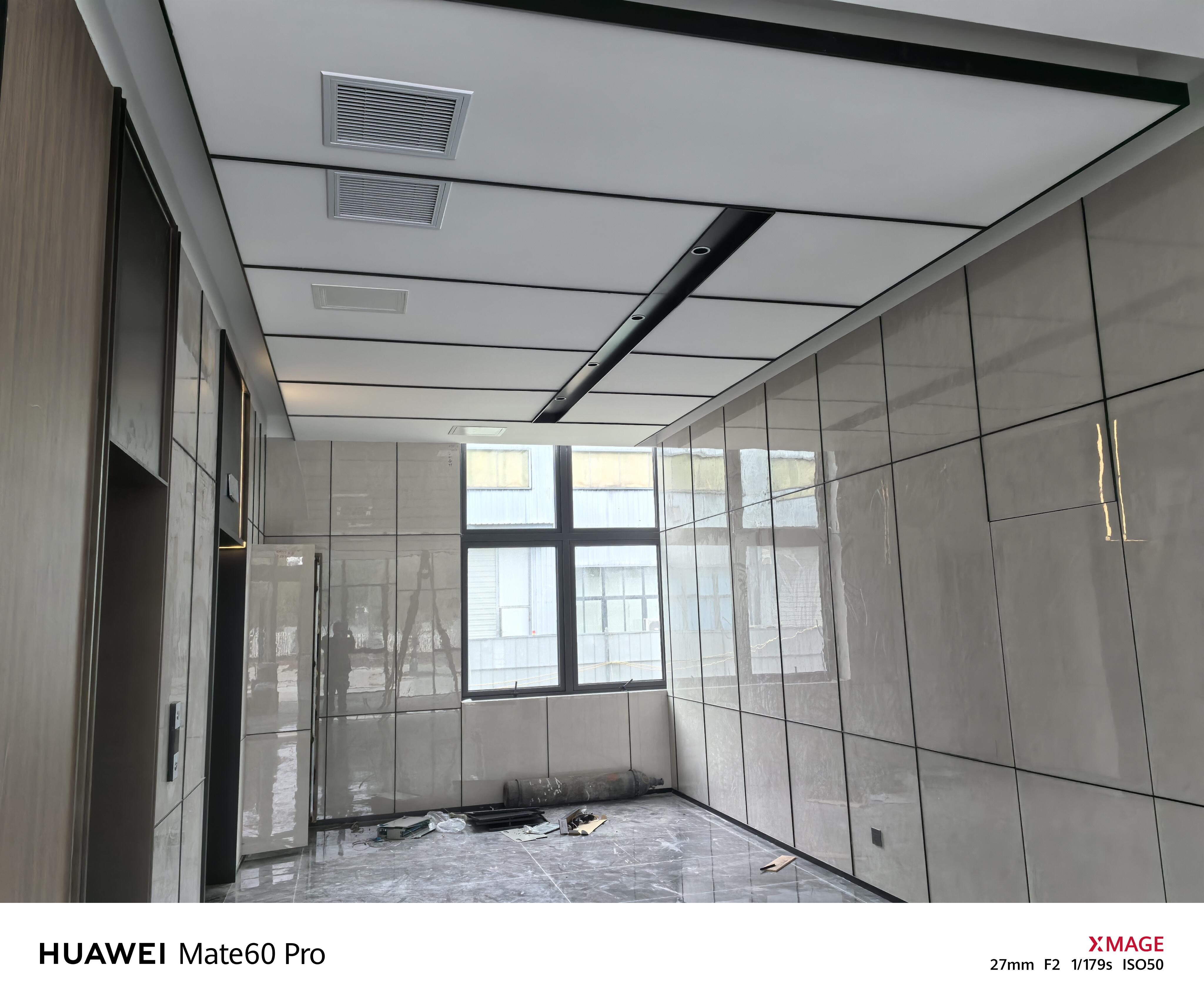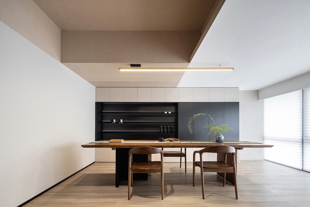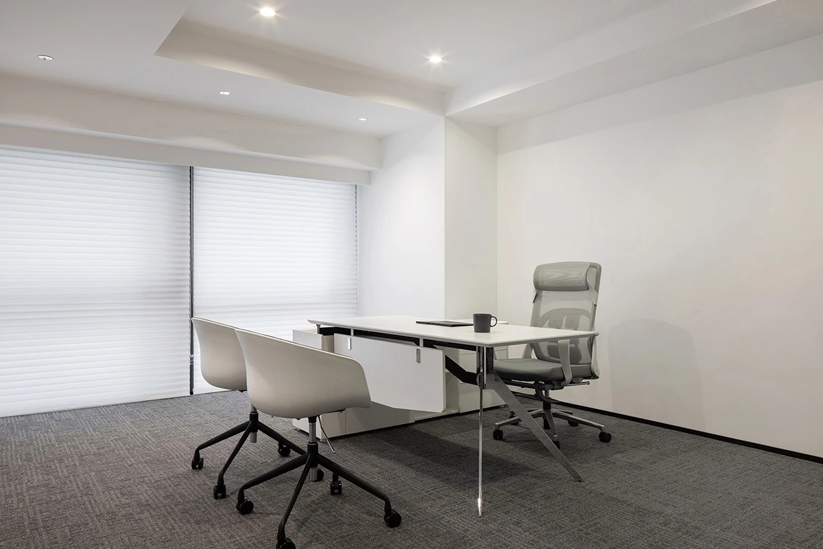会议室 Meeting Room | 冷酷的渐变玻璃隔绝了内部与外部,满足会议的独立私密的需求。特别采用柔和纯净的软膜灯光,既遮住了天花裸露的横梁,又一定程度上削弱了层高只2.2米的压抑感,仿佛天窗的吊顶设计亮点也营造出纯粹整洁的空间调性。烤漆玻璃提供了开会讨论的头脑风暴的介质,而墙面的吸音板则将声音隔绝于会议室内部,不影响周围其它空间。
