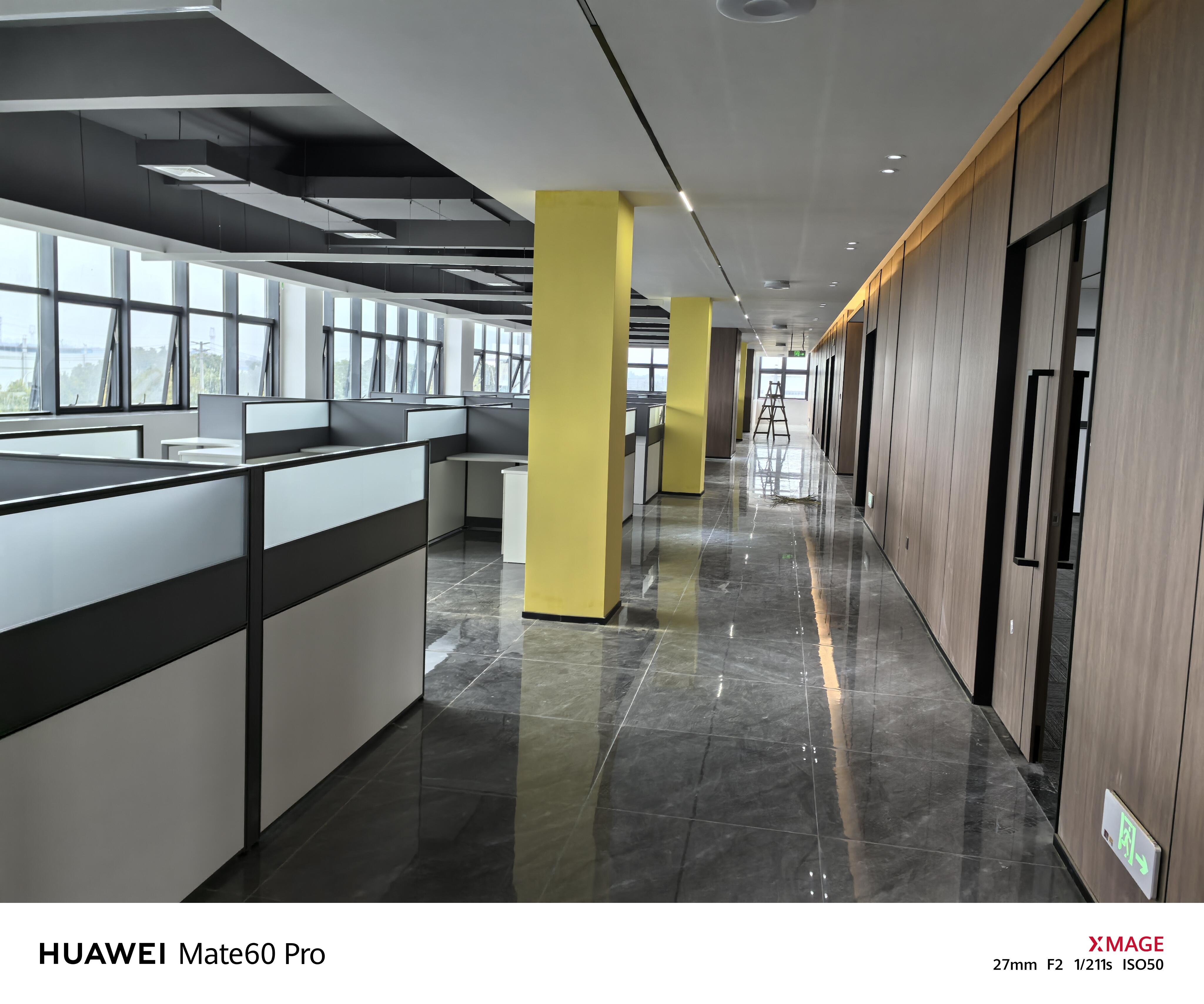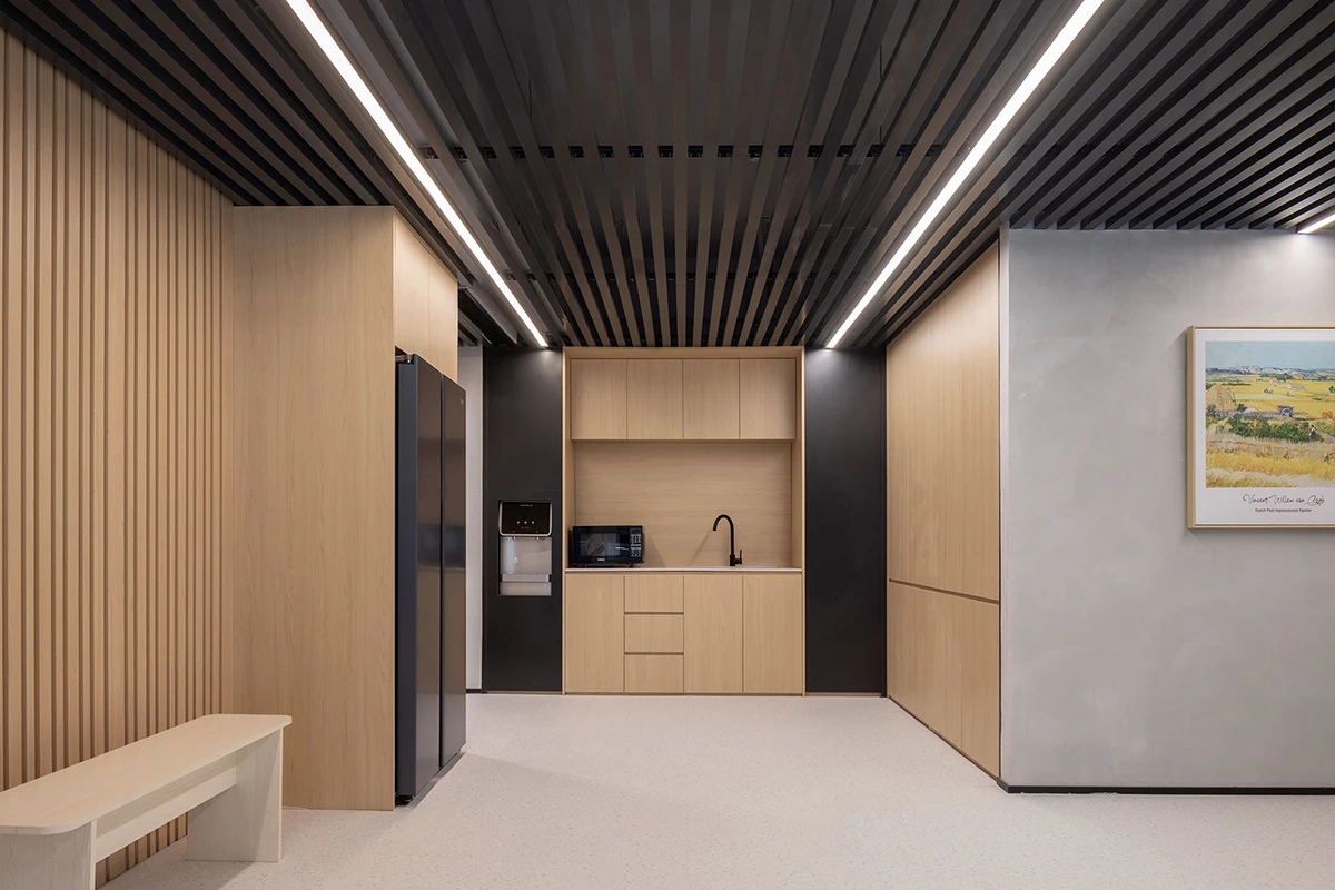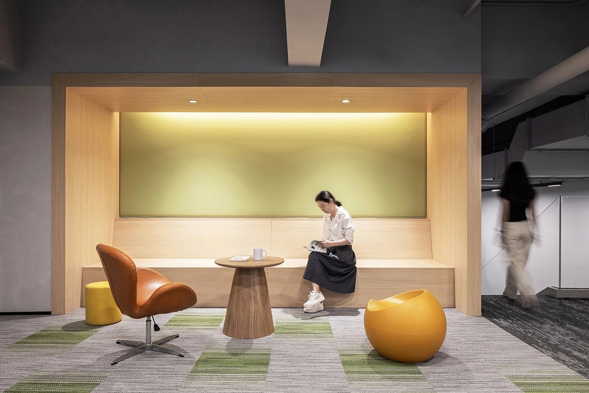 办公区 Office Area | 办公区以开放式布局为主,既鼓励团队间的互动协助,又为专注的个人工作提供舒适的区域。特别设置了开放讨论区,右侧的一整面墙设计为可书写的面板,满足个人或小组间的主题讨论和项目协作。通过温暖的木质柜子、渐变的绿色地毯、窗边的高吧台座位等营造出自然轻松的环境,鼓励专业输出与人际交流。