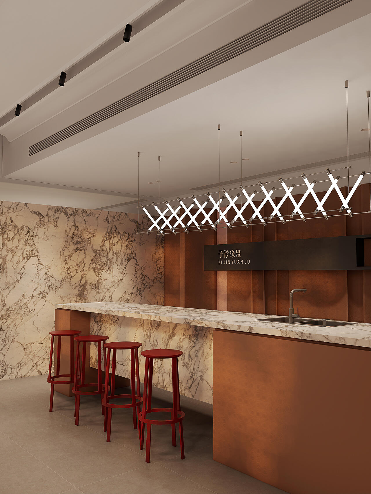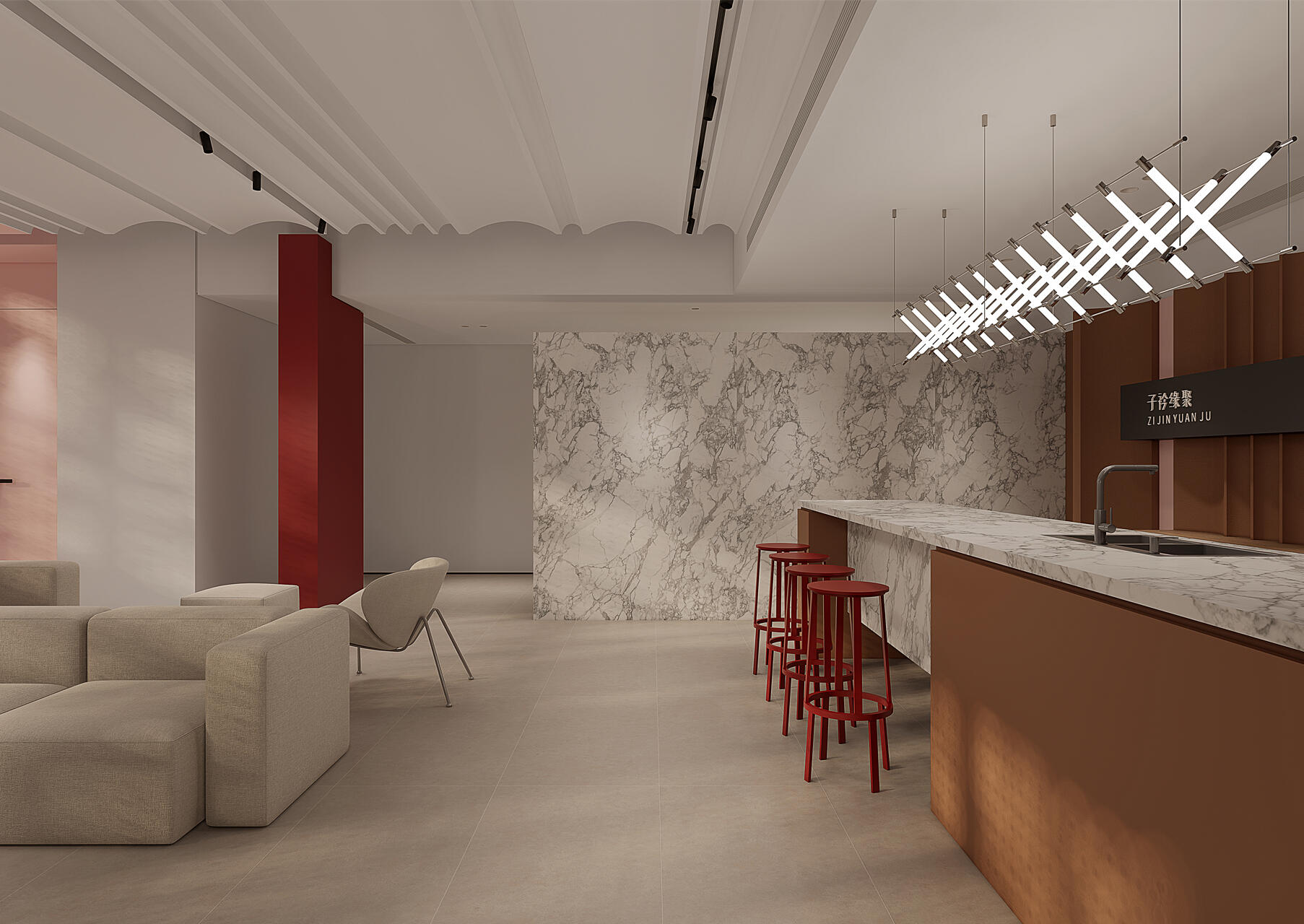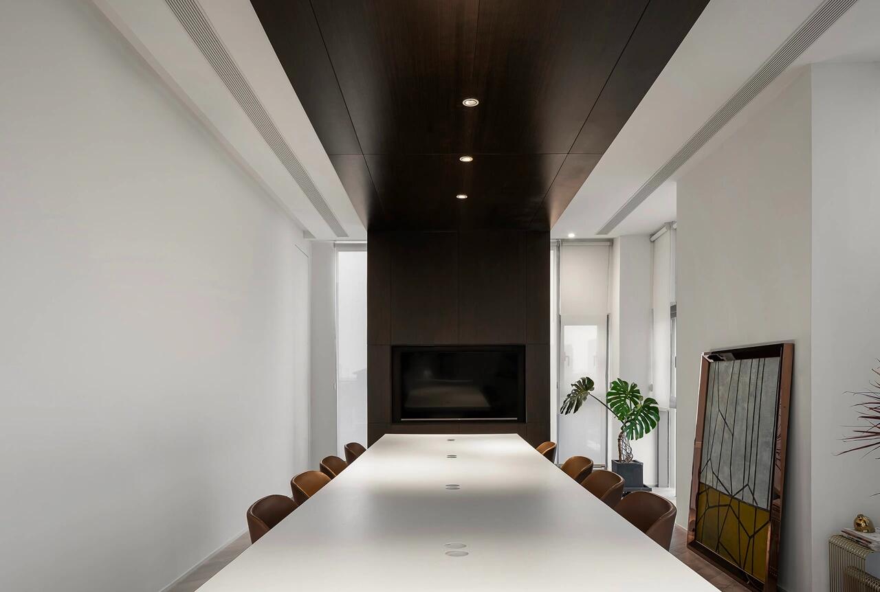 以冷静的黑白纯色来延展空间尺度与艺术张力,红色代表热爱,活力,坚持,灵感,那黑与白则代表着精益求精,一丝不苟,孜孜追求……