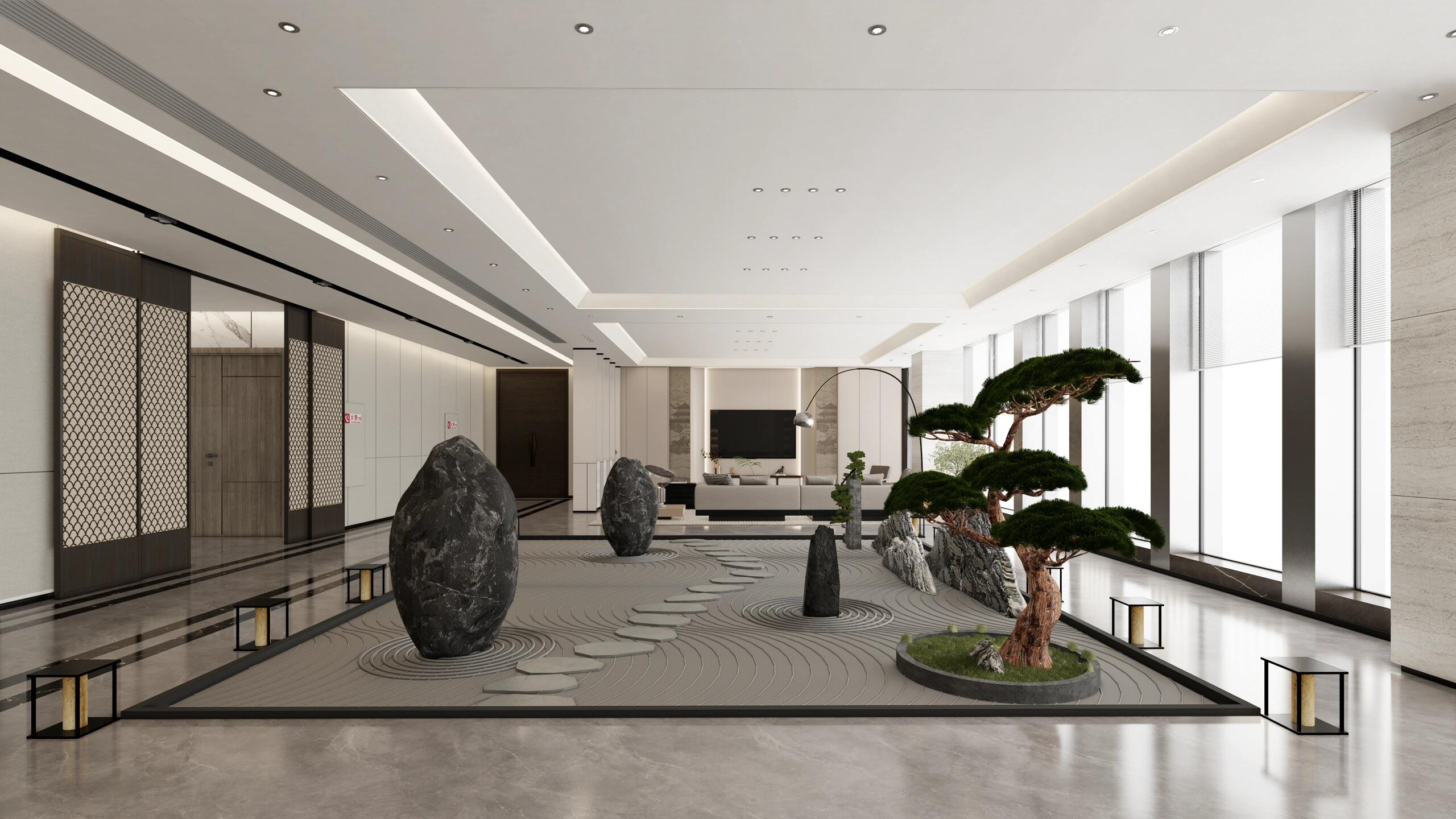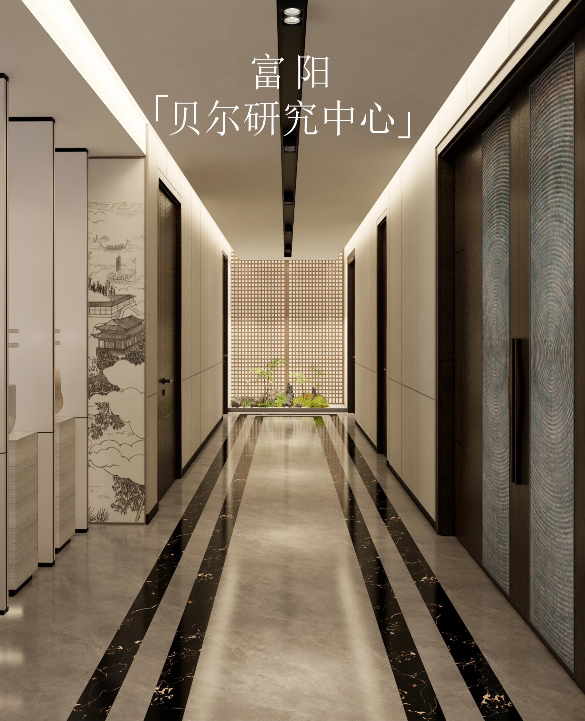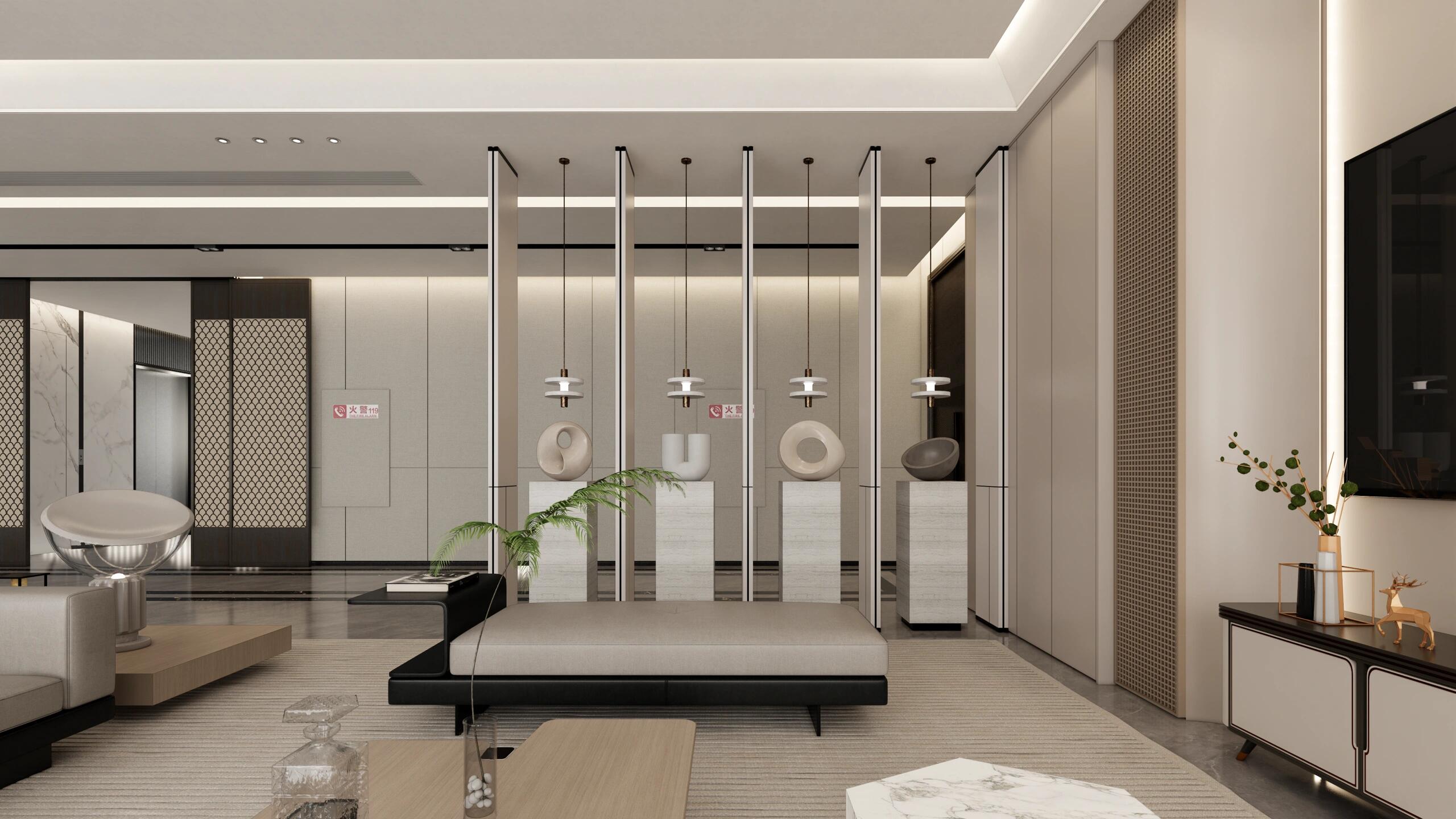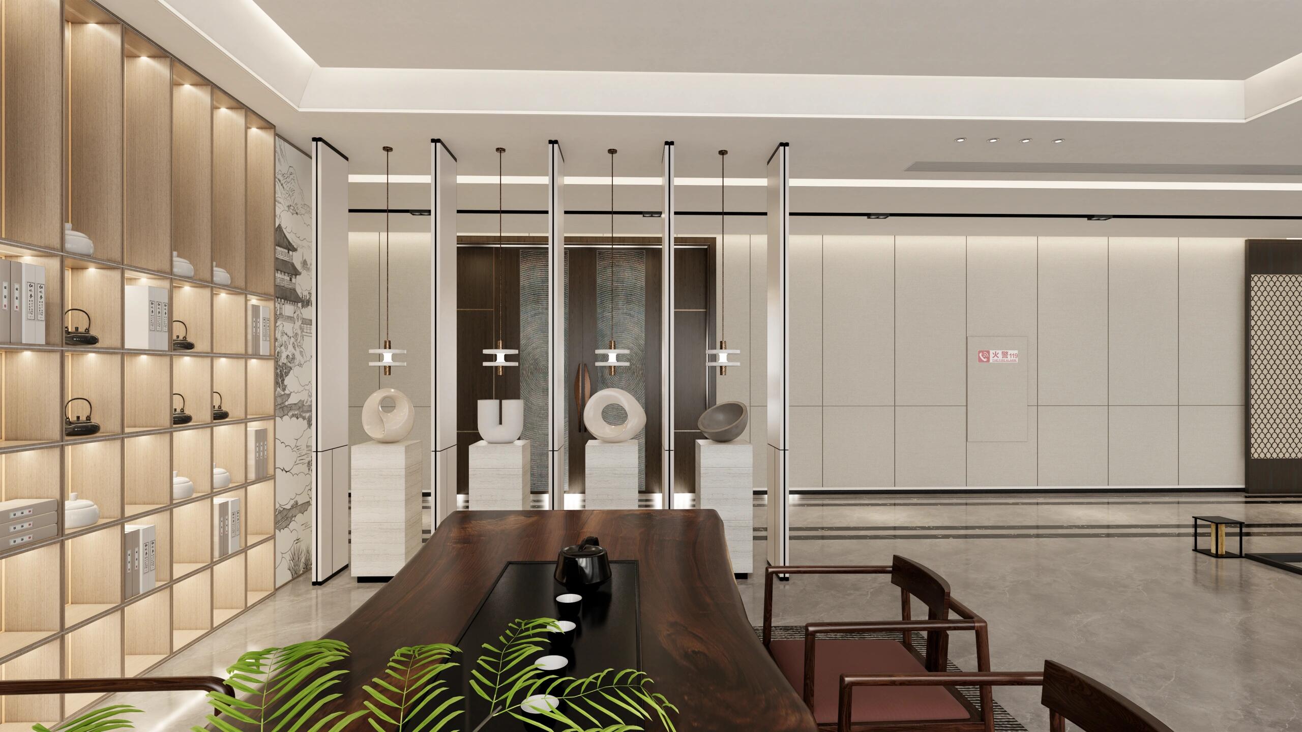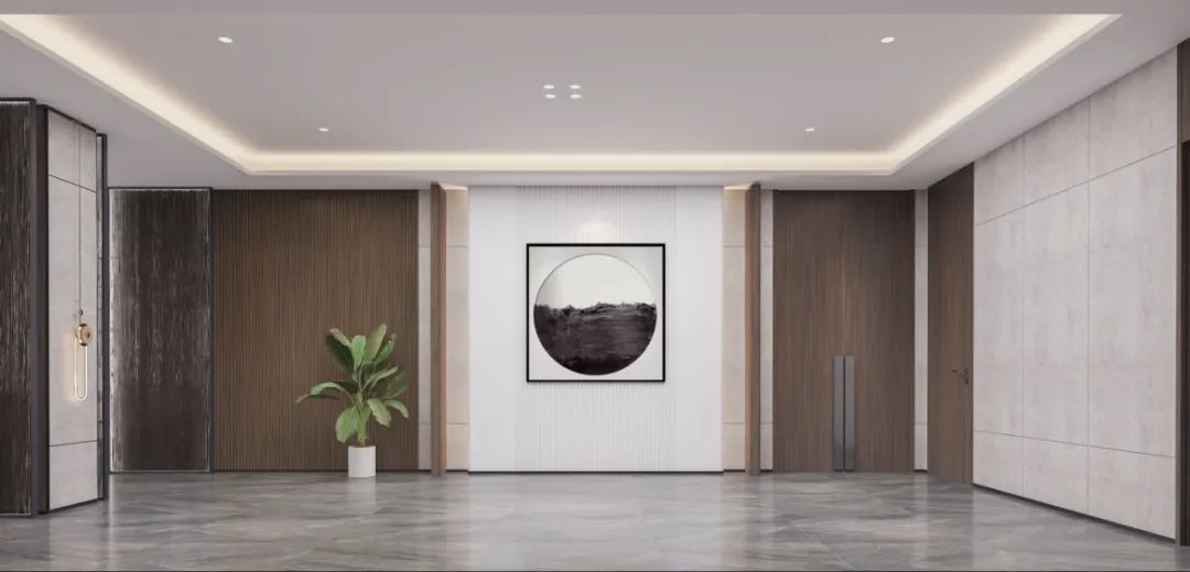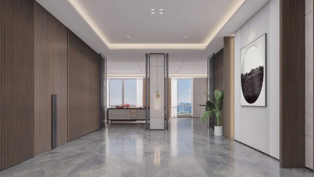 玄关设计以美学为核心,融实用与艺术于一体。正对悬挂一幅艺术画,以当代手法演绎开门见山的东方意境。右侧借结构柱划分茶水台洗手间,门洞两侧长虹玻璃隔断虚实相生,波纹肌理将光线滤作跃动光斑。