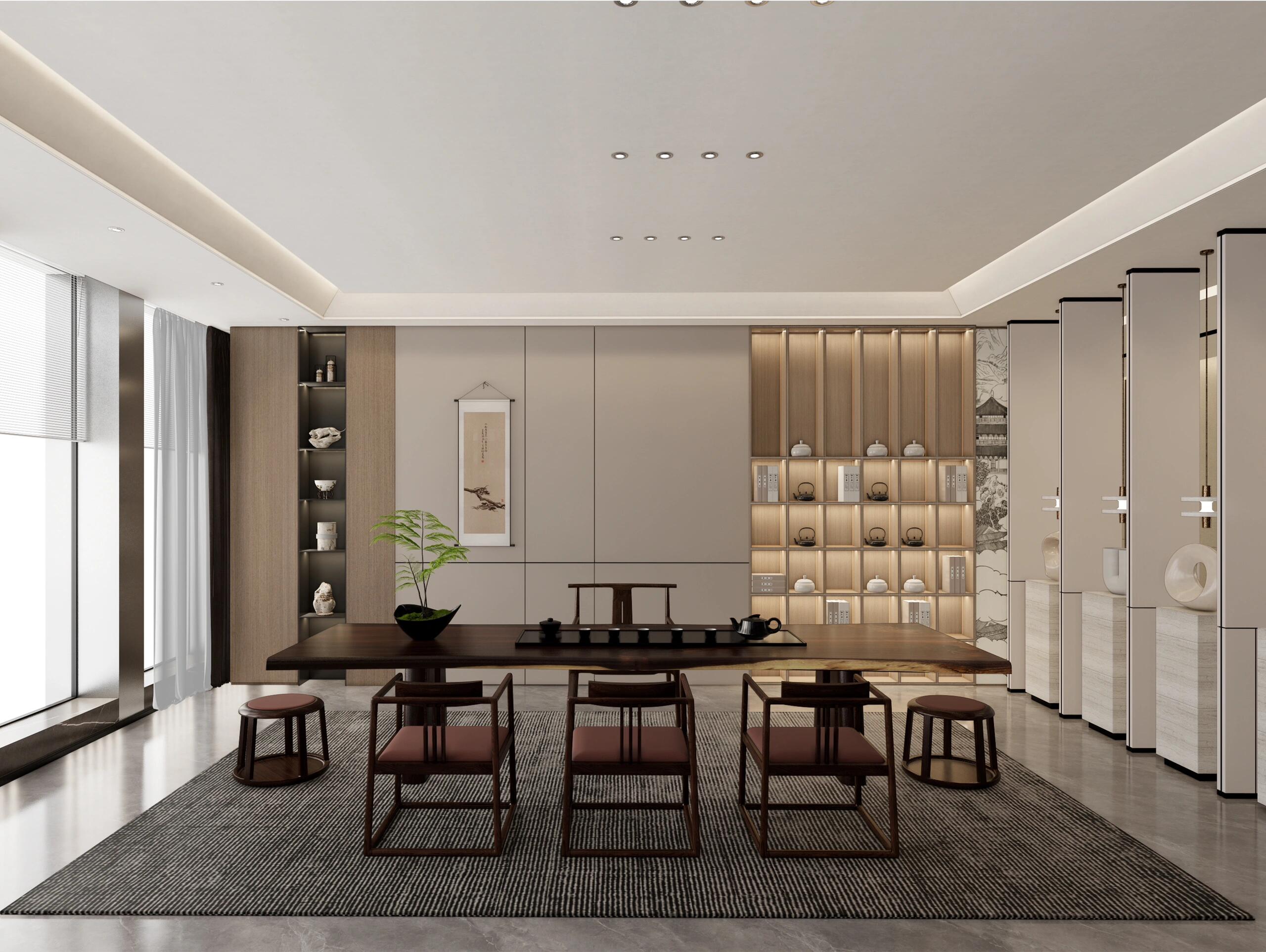 温润的原木饰面晕染出家的温度,大面积的落地玻璃将自然光毫无保留地迎入室内,让空间通透明亮,角落造景以青苔与琴叶榕演绎微型生态,实现人工空间与自然生命的共生叙事。