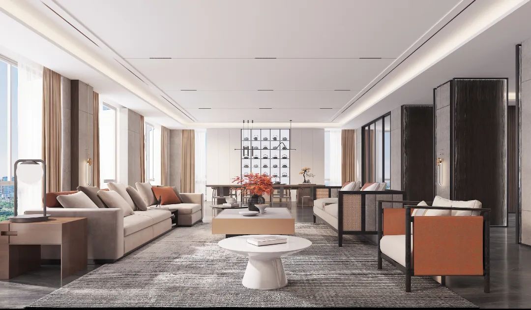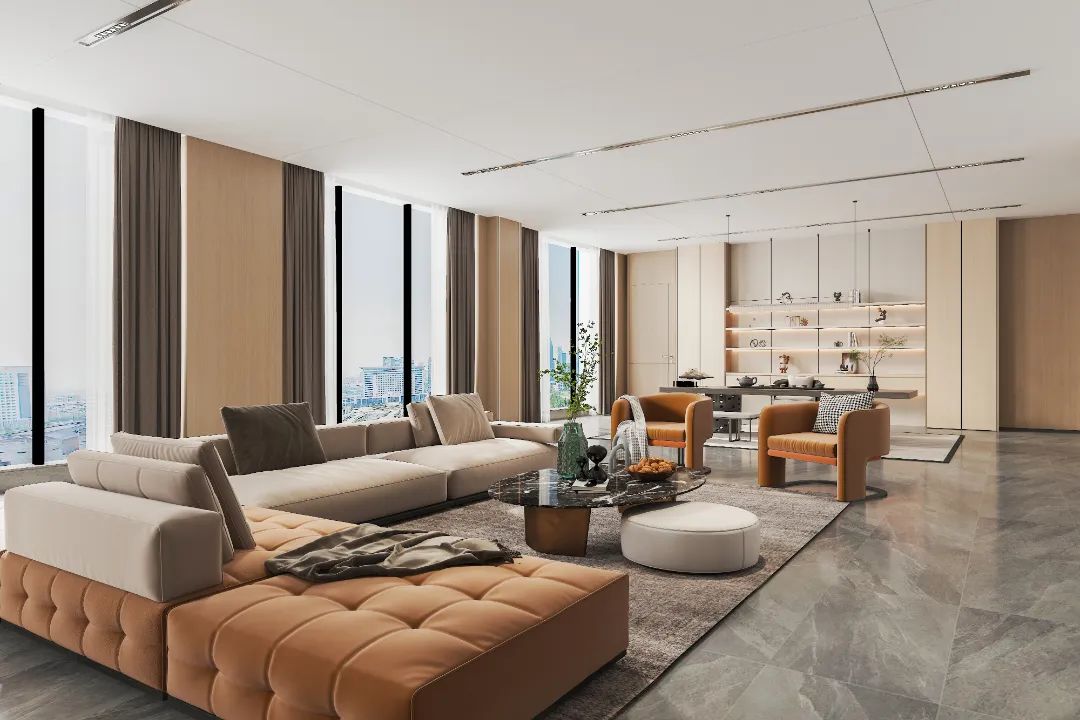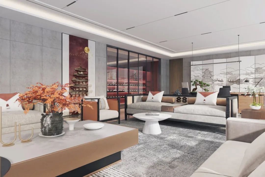铅灰与雅白构筑空间基底,中性色调赋予其庄重之感。柔软布艺铺陈出温馨底色,,而绛红的酒柜则注入温暖灵魂。