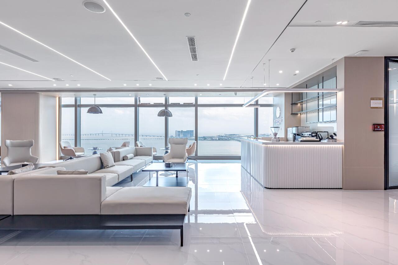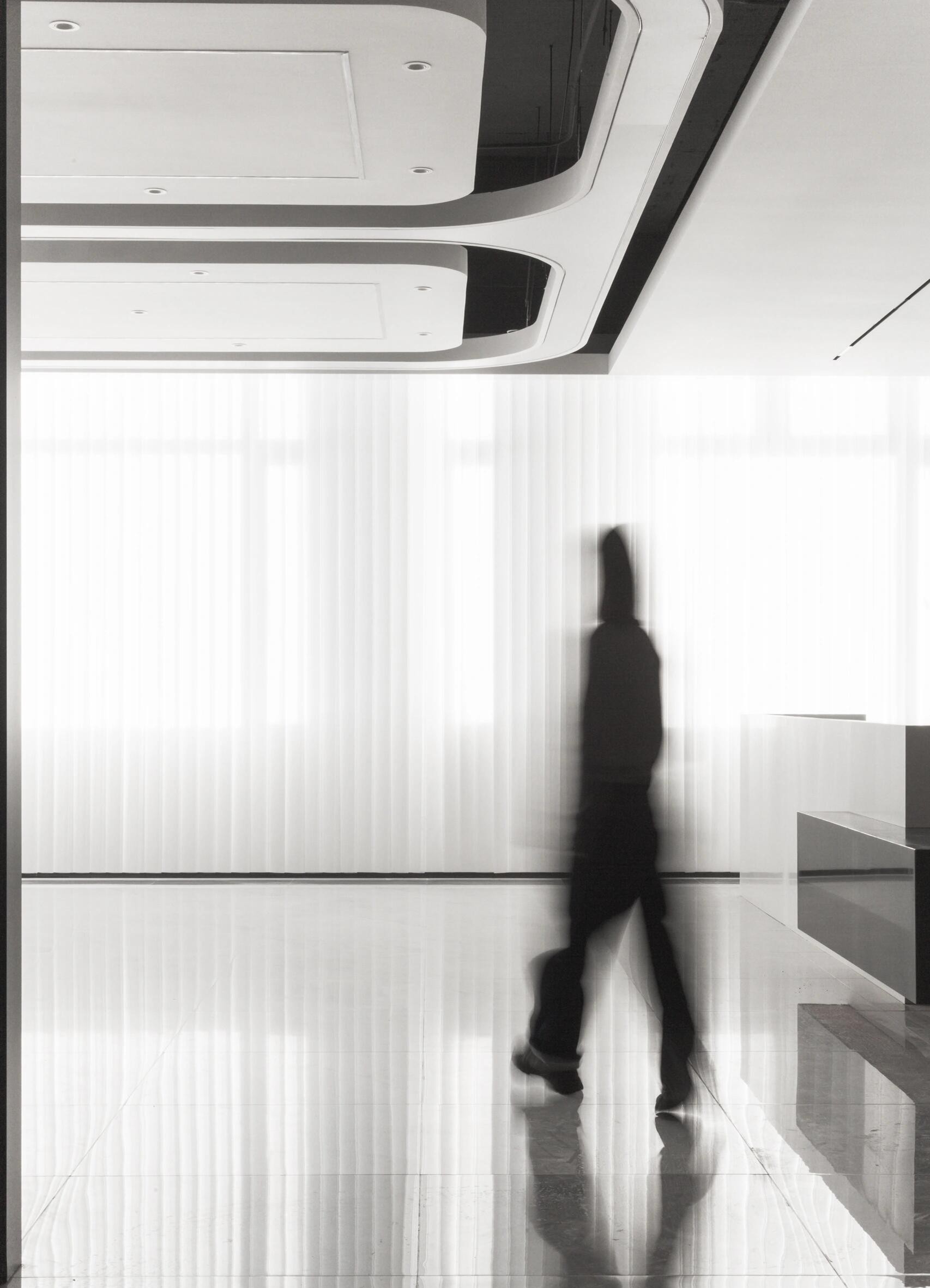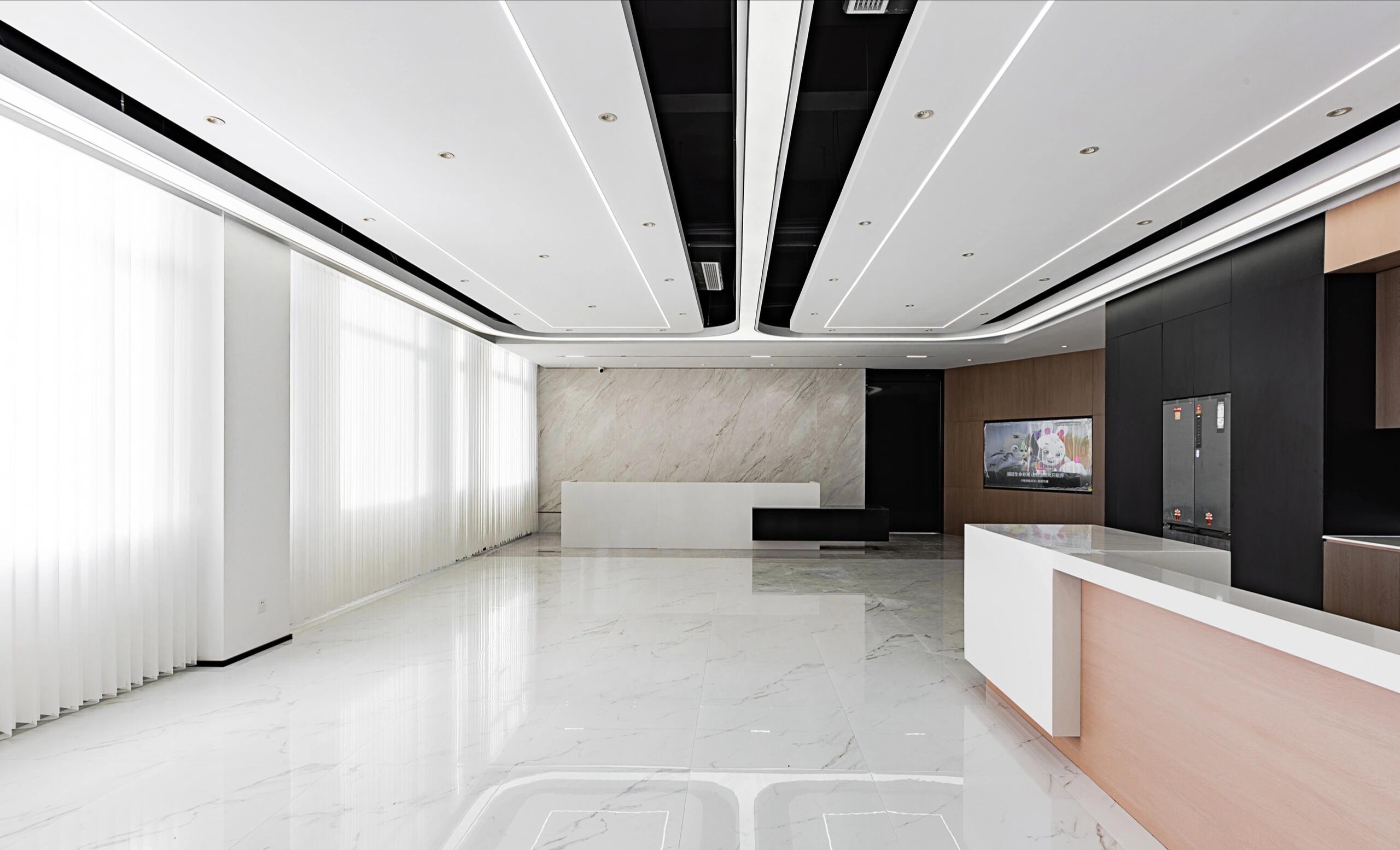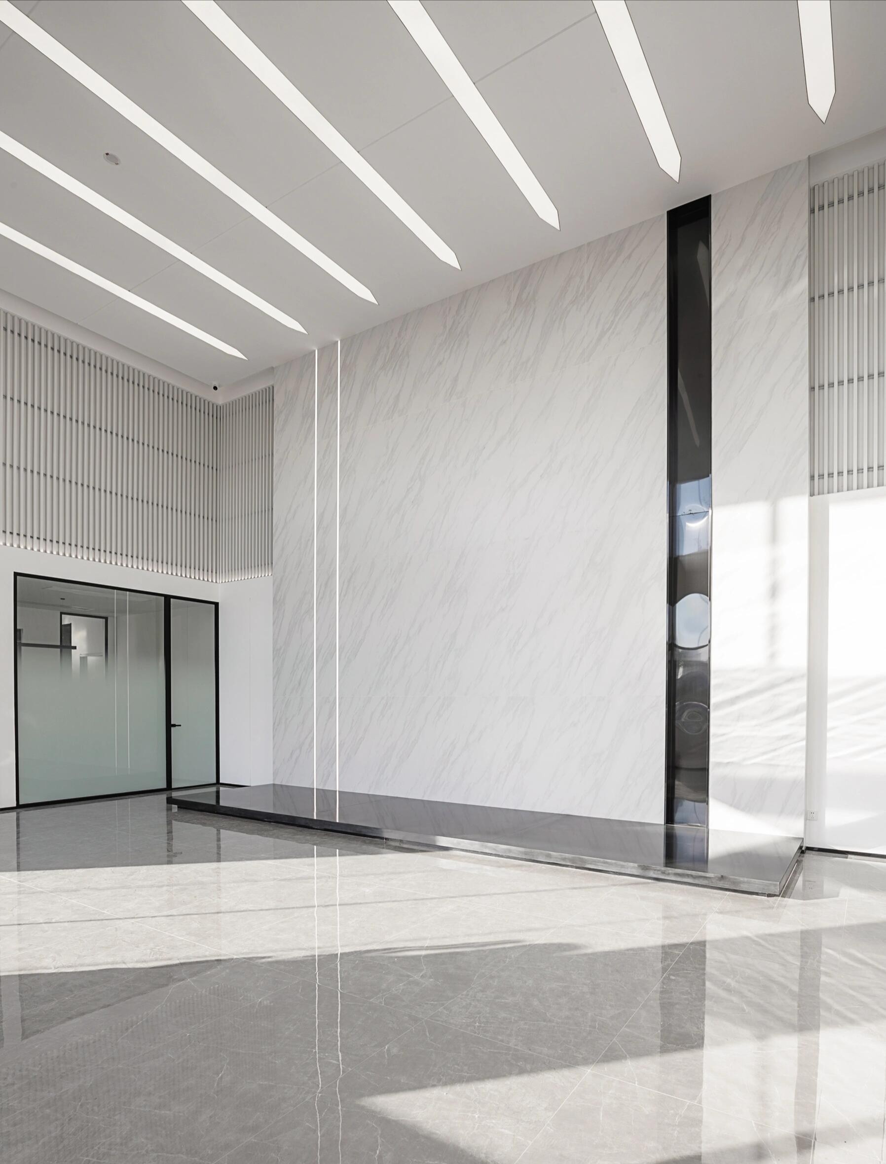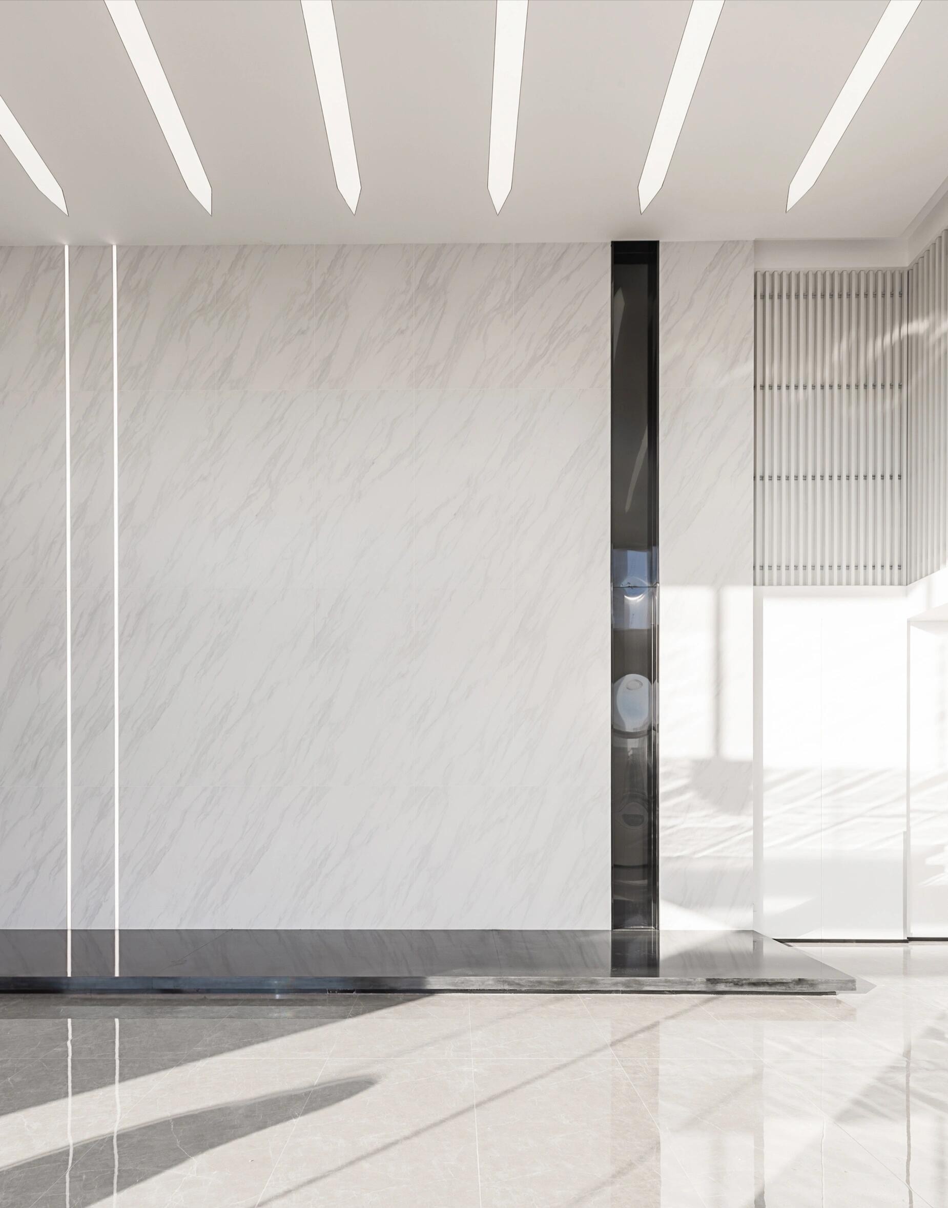 纯净的白色大理石纹理,丝丝生动的斜纹覆盖其上,搭配立体灯光设计,赋予大厅“艺术展厅”般的格调。
