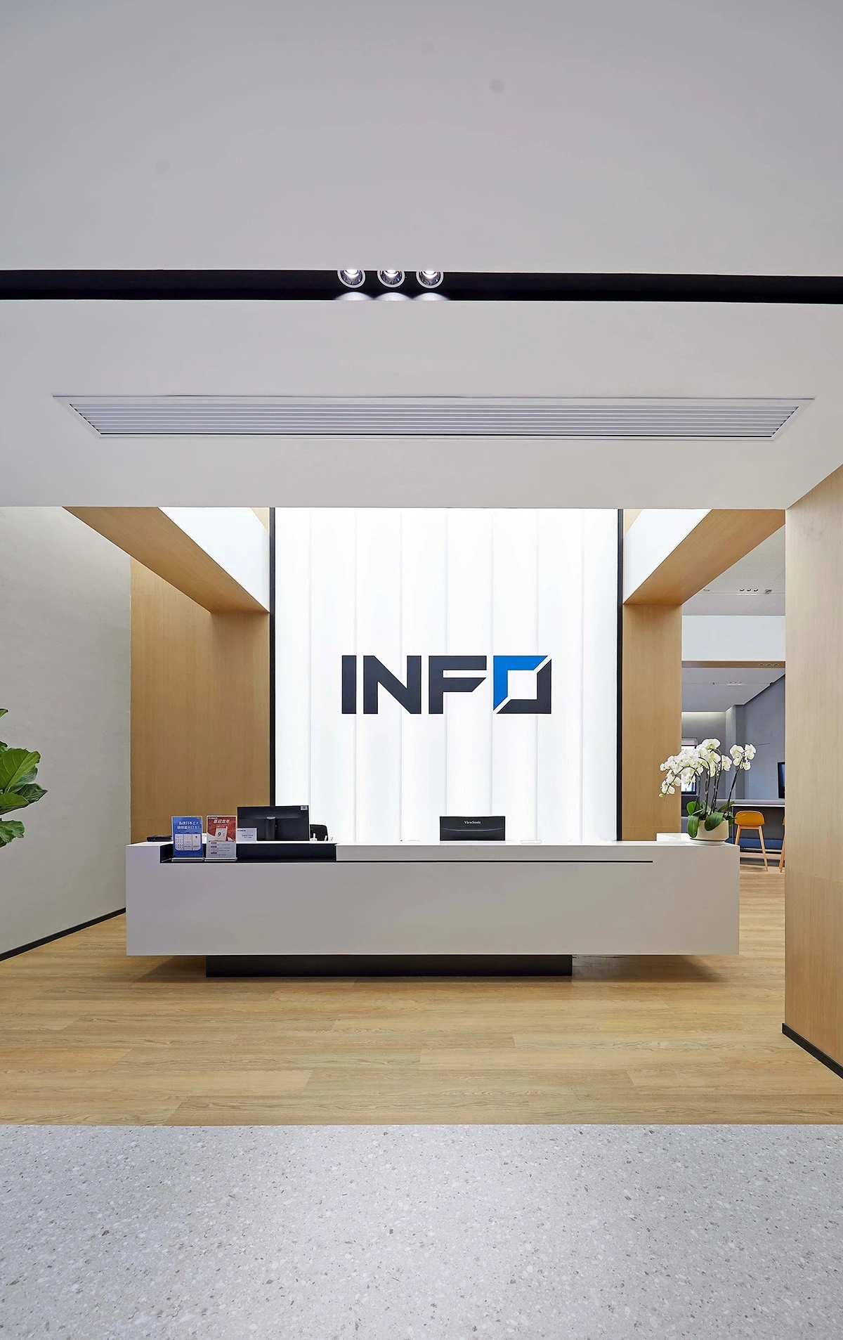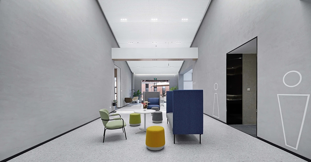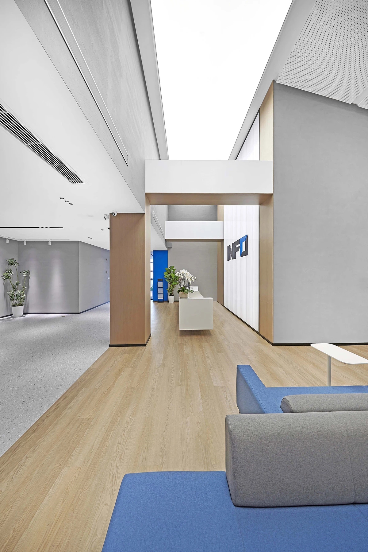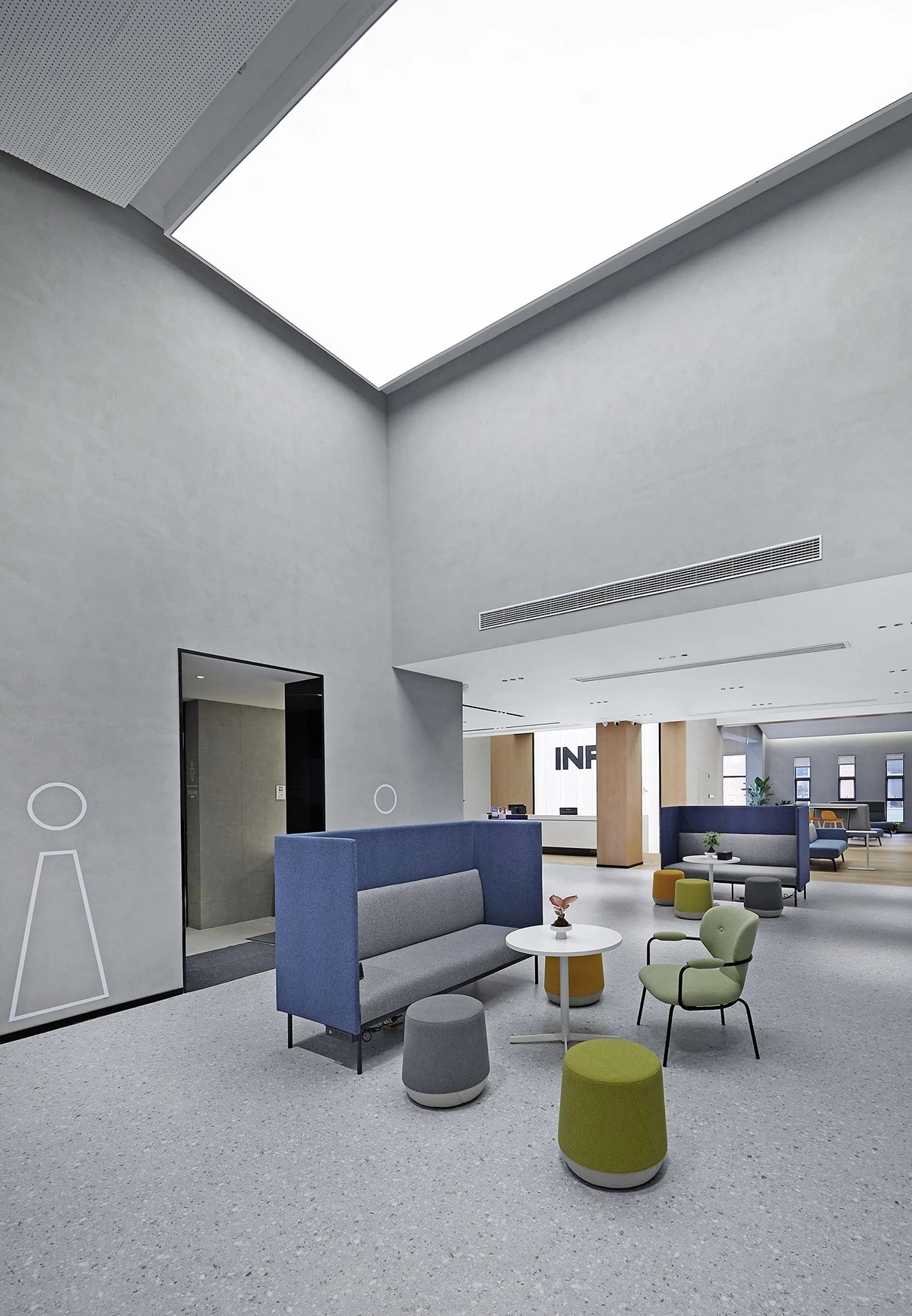 充足的照明形成明快的底色。完全开敞的背景墙消除了原有空间的厚重感,与之替代的是增强空间收放的节奏感。品牌接待区是空间的核心区域,这里有一个多元化的中转区通往工作区和开放区。这里并没有采用传统的走廊式布局,而是创造了一个按路径划分的多样化中转区,增强了不同部门之间的沟通,同时为访客提供了一个临时空间。通过设置休闲家具形成空间过渡,作为洗手间的视线遮挡。留白的墙面则成为了该空间的基底,简约清新。