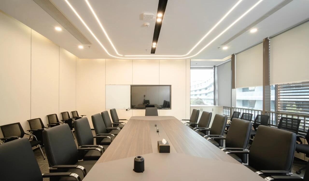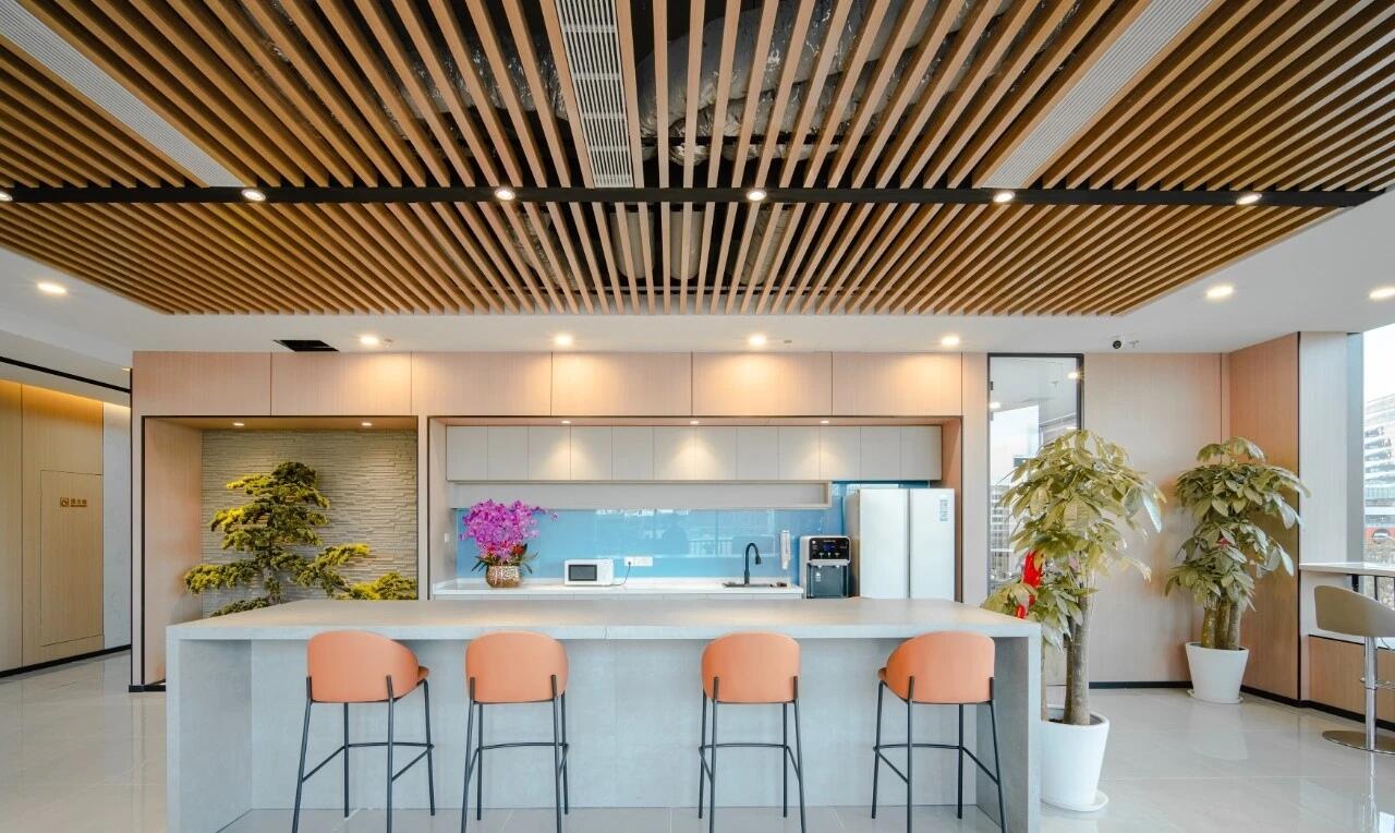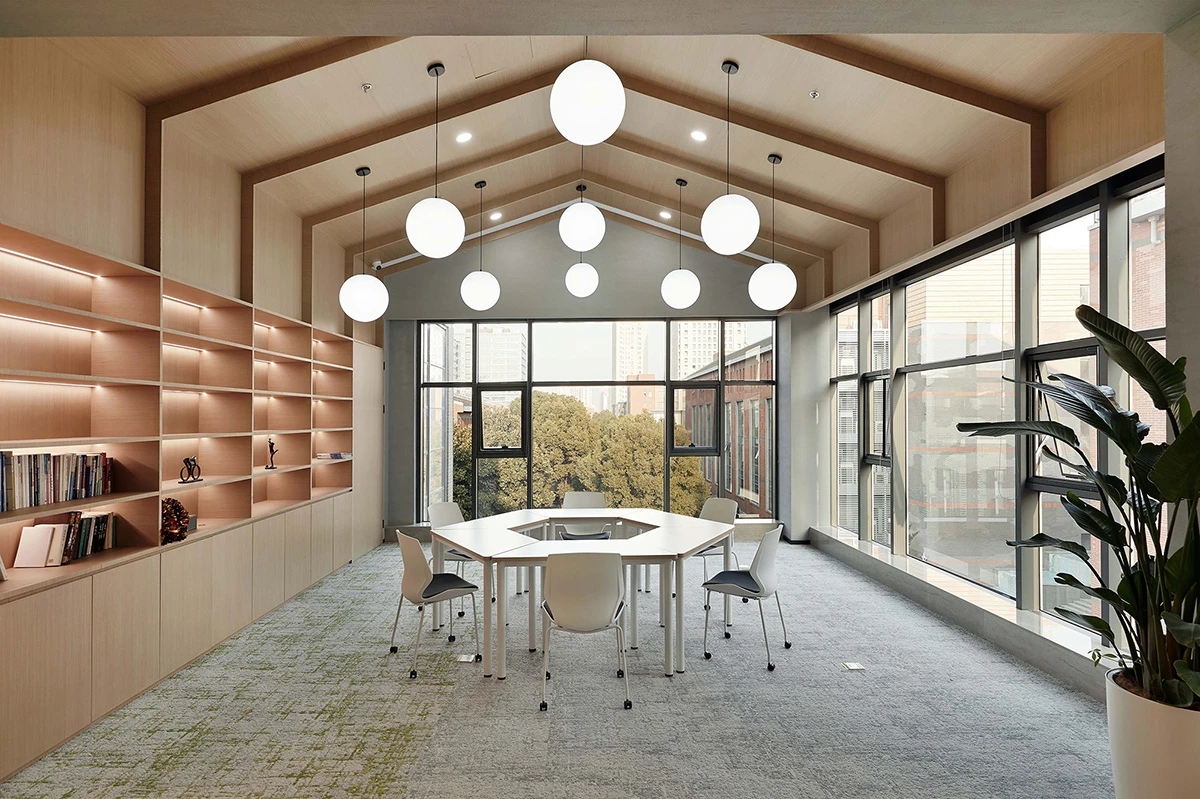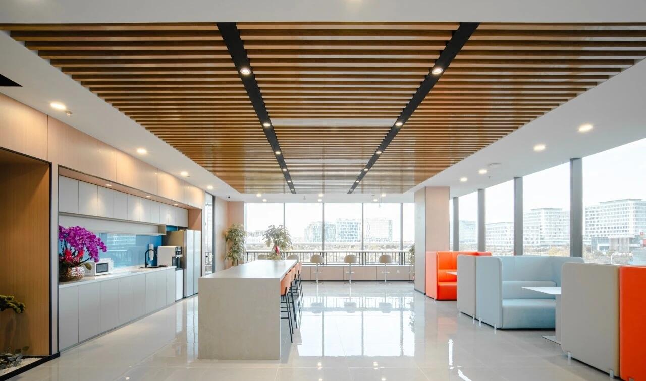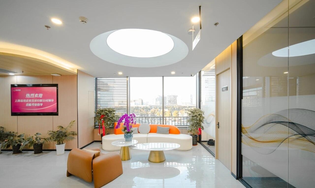 充足的照明形成明快的底色。完全开敞的背景墙消除了原有空间的厚重感,与之替代的是增强空间收放的节奏感。品牌接待区是空间的核心区域,这里有一个多元化的中转区通往工作区和开放区。这里并没有采用传统的走廊式布局,而是创造了一个按路径划分的多样化中转区,增强了不同部门之间的沟通,同时为访客提供了一个临时空间。通过设置休闲家具形成空间过渡,作为洗手间的视线遮挡。留白的墙面则成为了该空间的基底,简约清新。