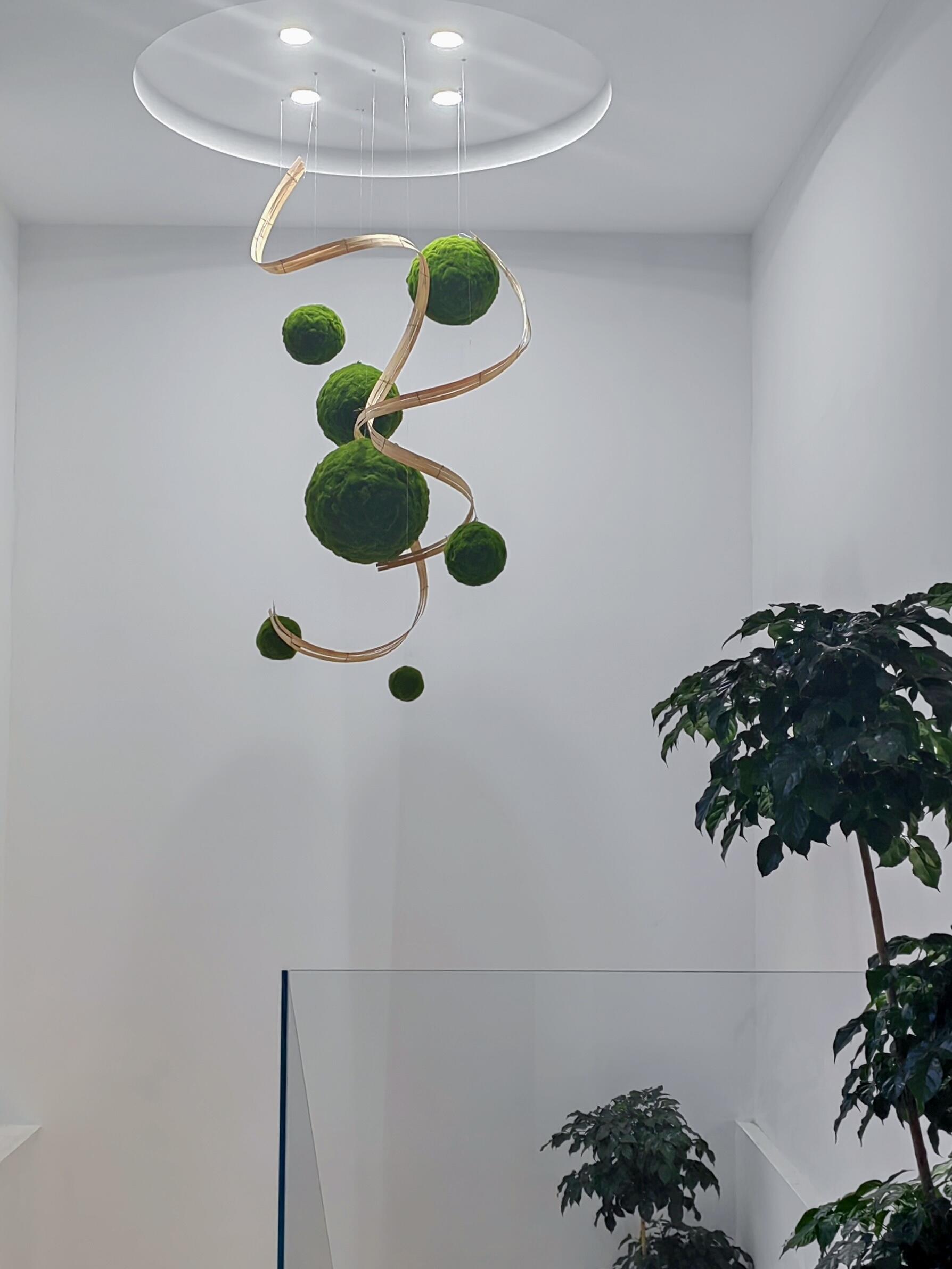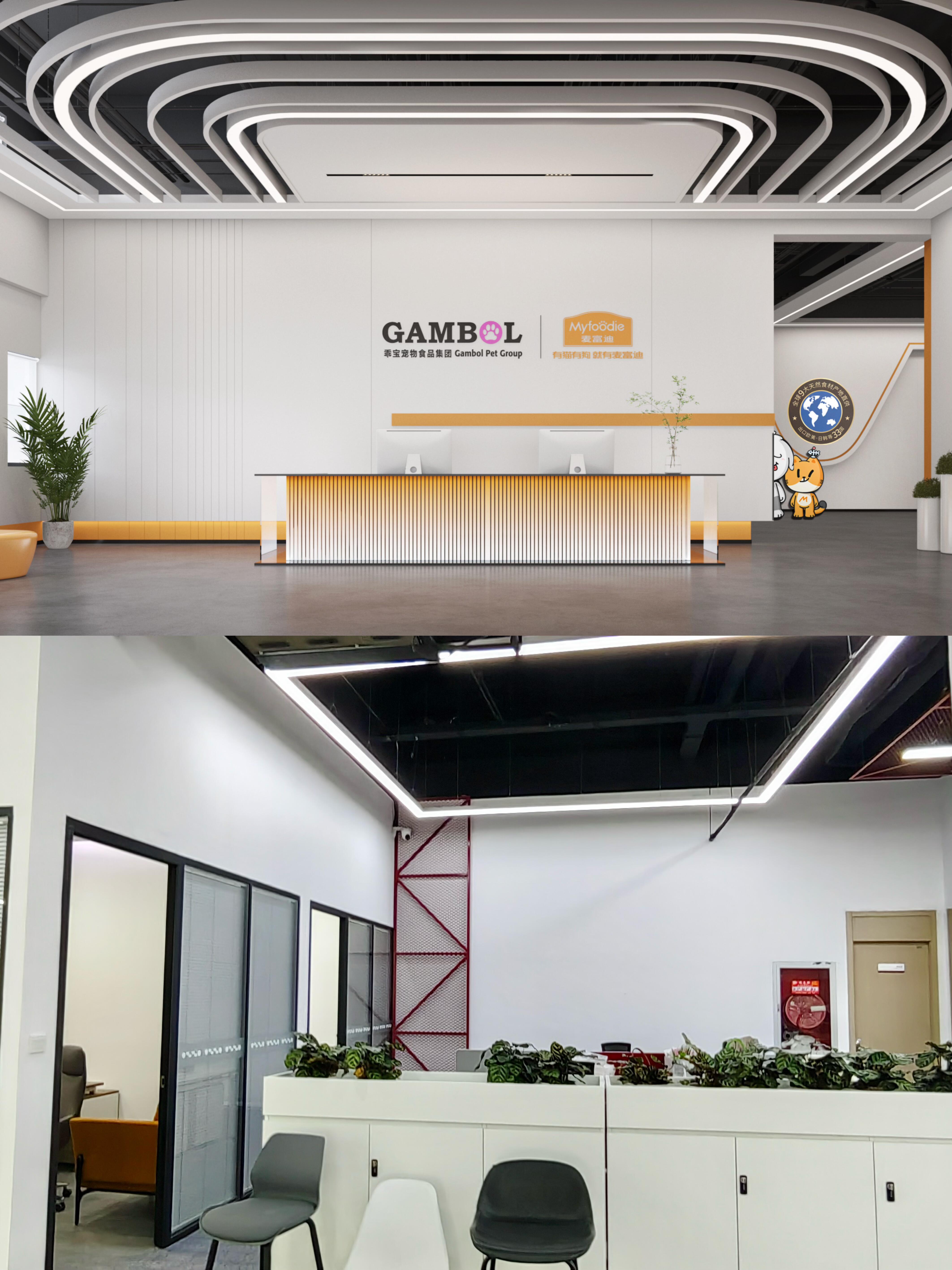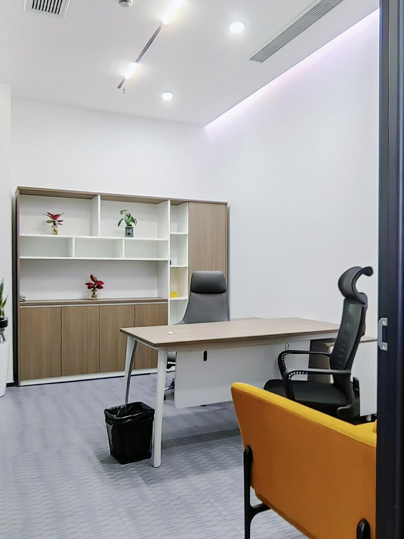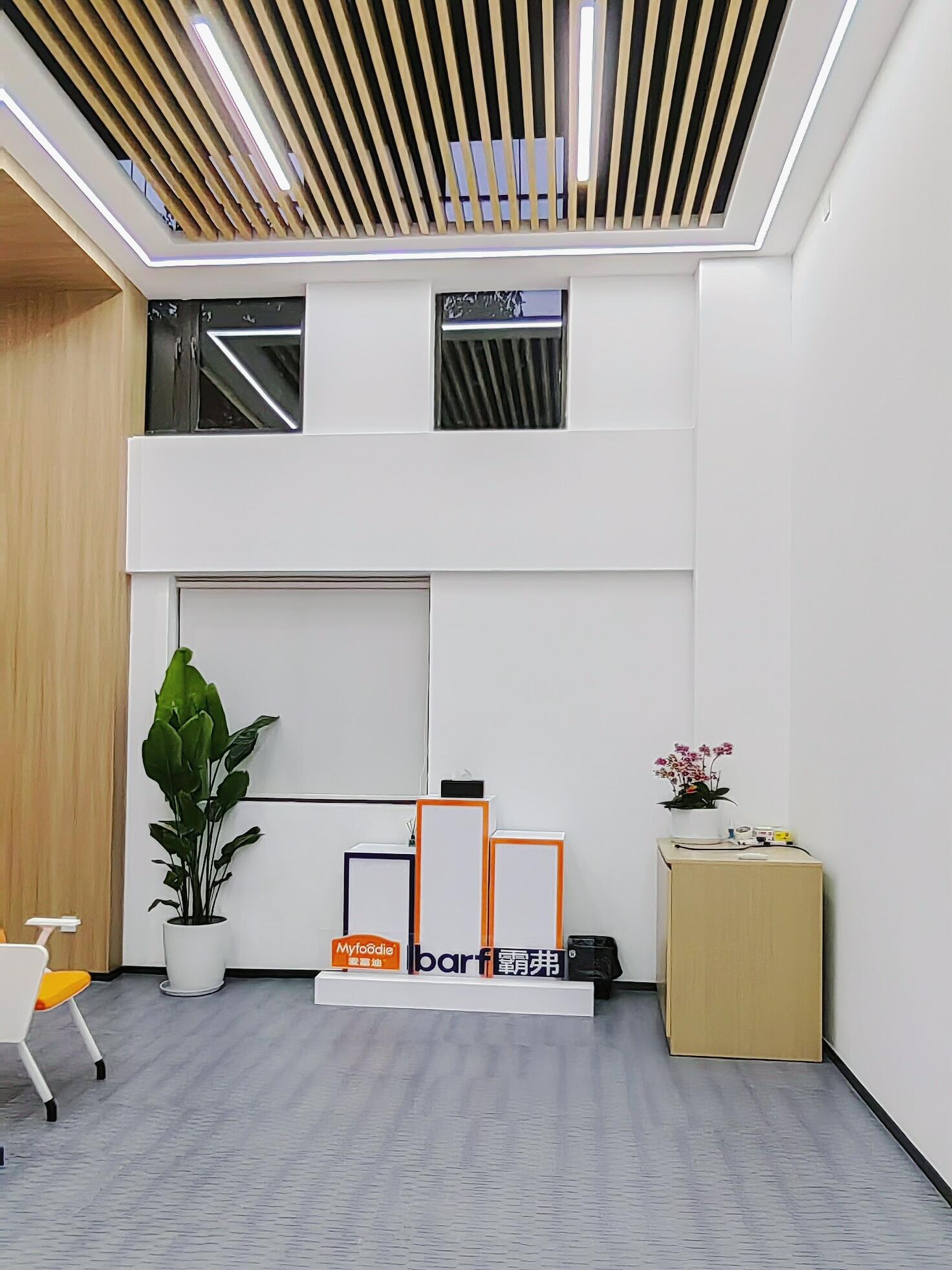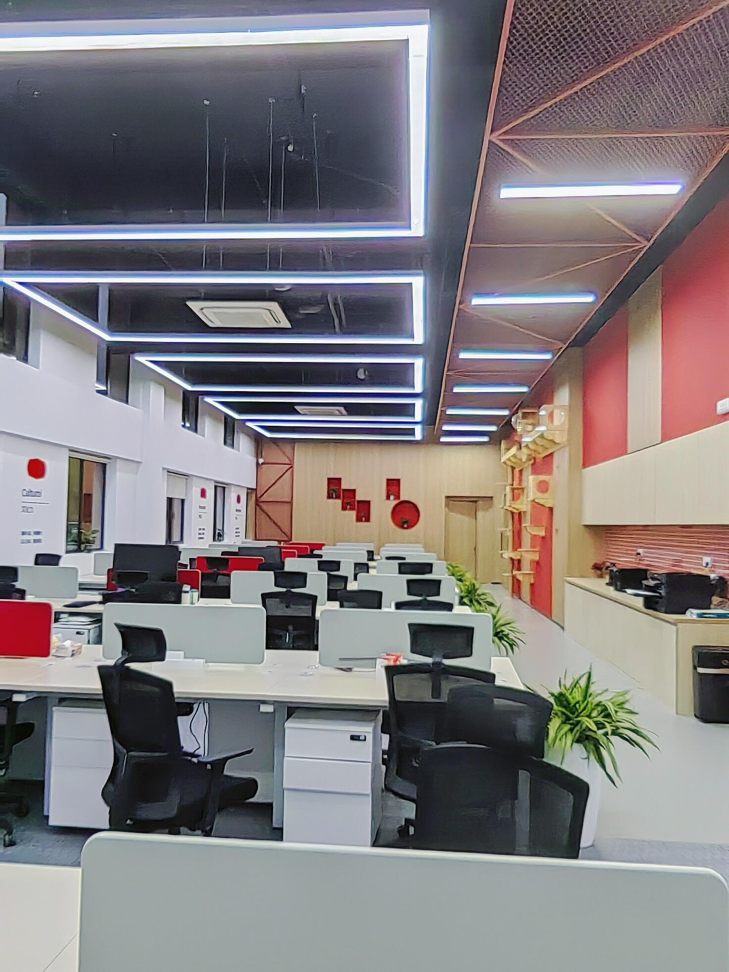 前台位于办公室入口的中心位置,采用白色为主色调,配以绿色的线条装饰,显得非常干净整洁。前台上方有一个大型的圆形灯具,为整个空间增添了现代感。前台旁边摆放了一盆绿植,增加了自然的元素。