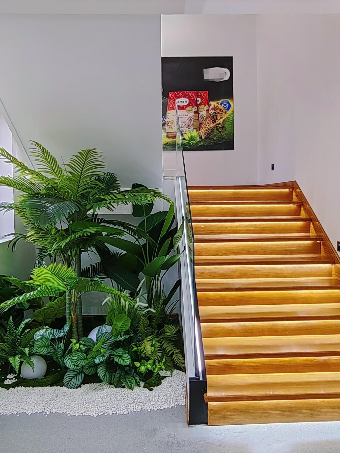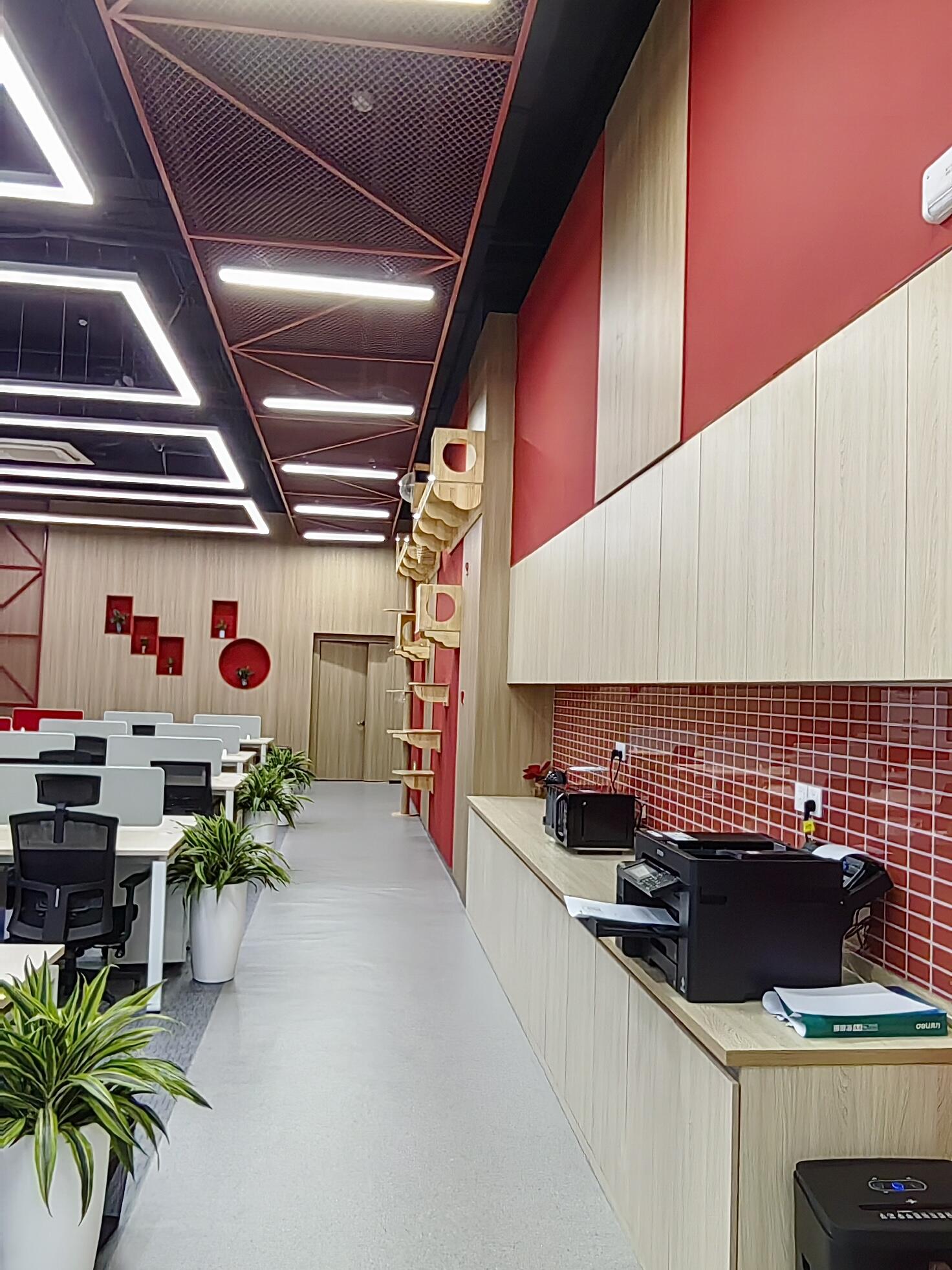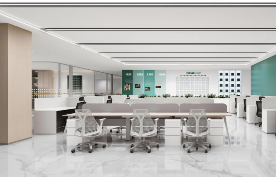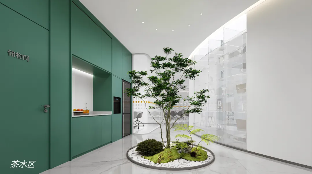 左侧墙面采用了木质材料,右侧墙面则使用了浅绿色调,营造出一种温馨且富有活力的氛围。茶水间采用绿色为主色调,配以白色的吊柜,显得非常干净整洁。茶水间内配备了冰箱、微波炉、咖啡机等设备,方便员工随时享用热饮和小吃。
