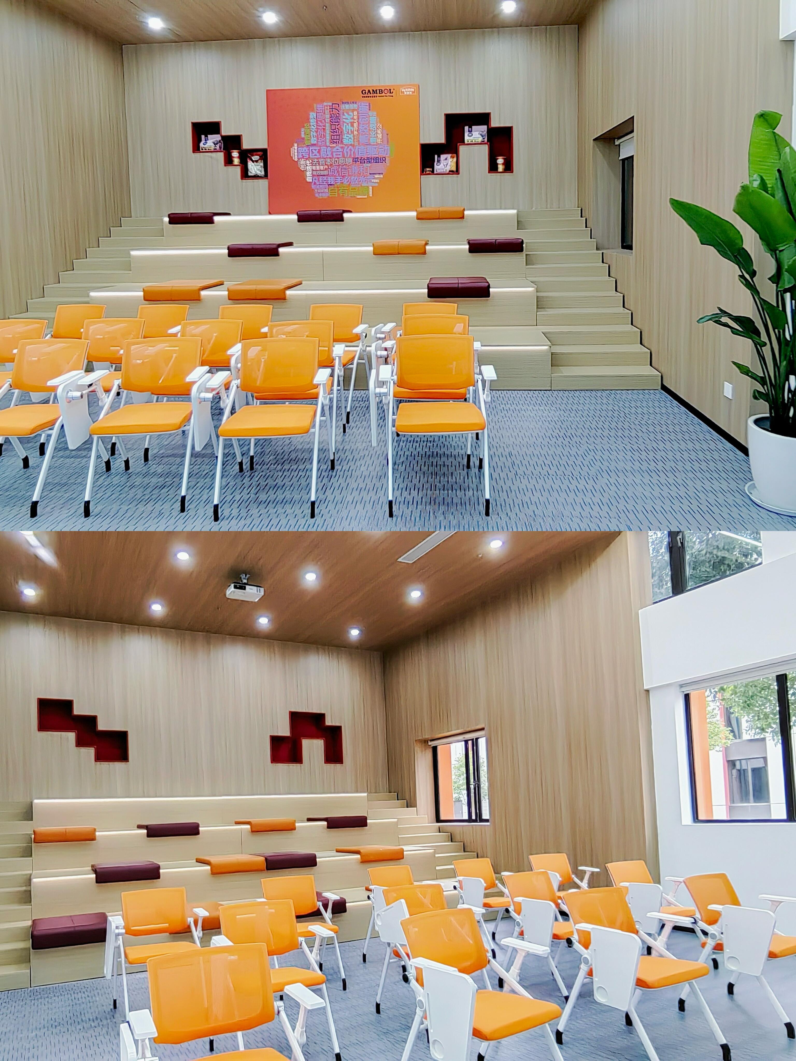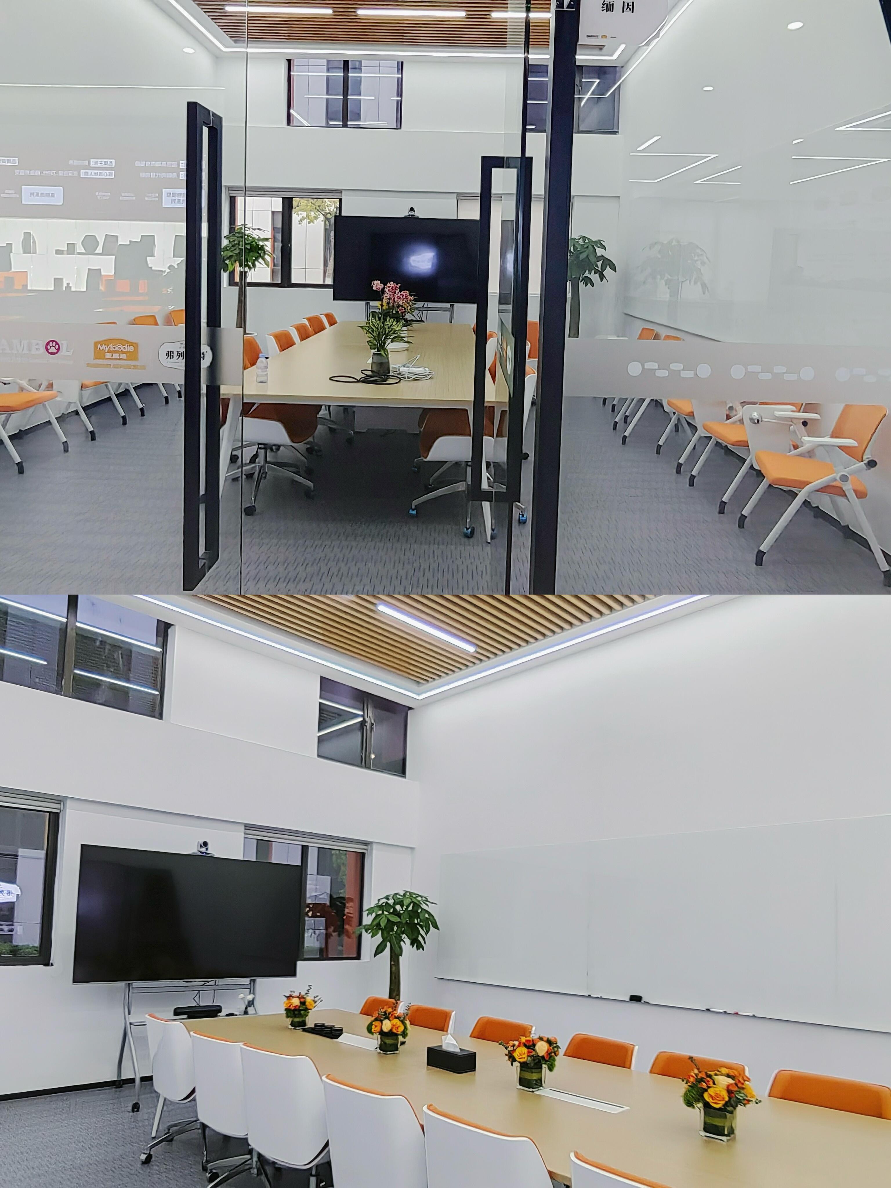 会议室整个空间采用了简洁而时尚的设计元素,给人一种清新和专业的感觉。会议室的一面墙壁被涂成了绿色,上面挂着一个大屏幕,这种设计不仅具有视觉冲击力,还能提醒参会者注意时间管理。