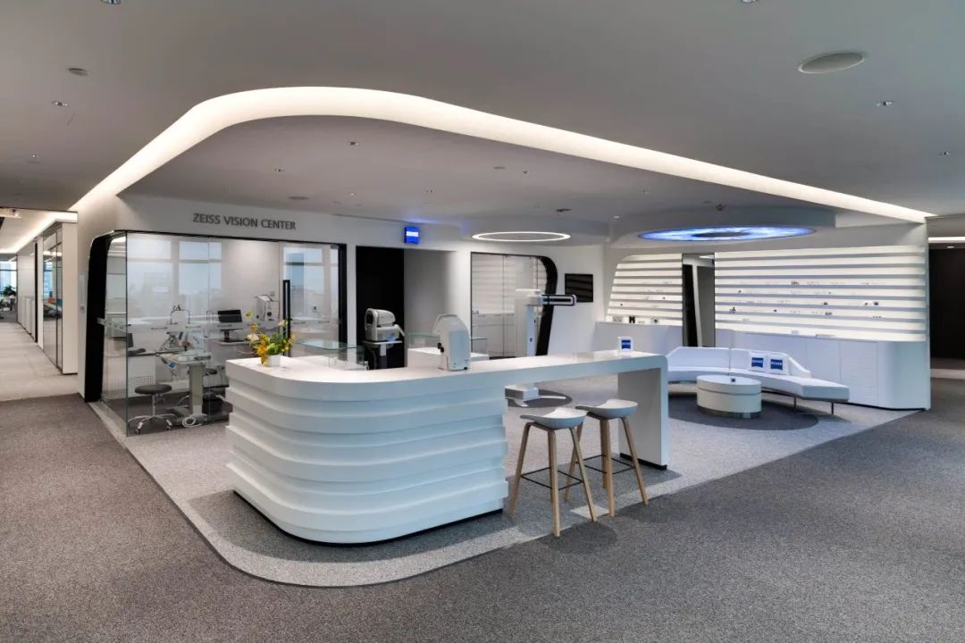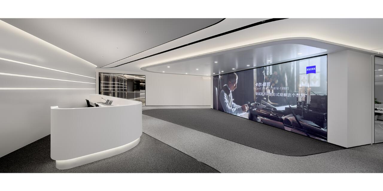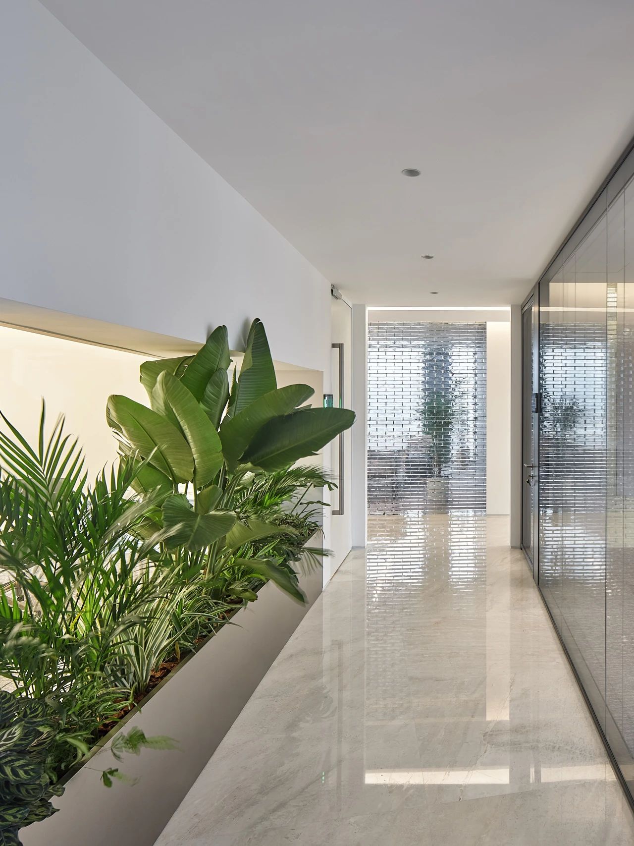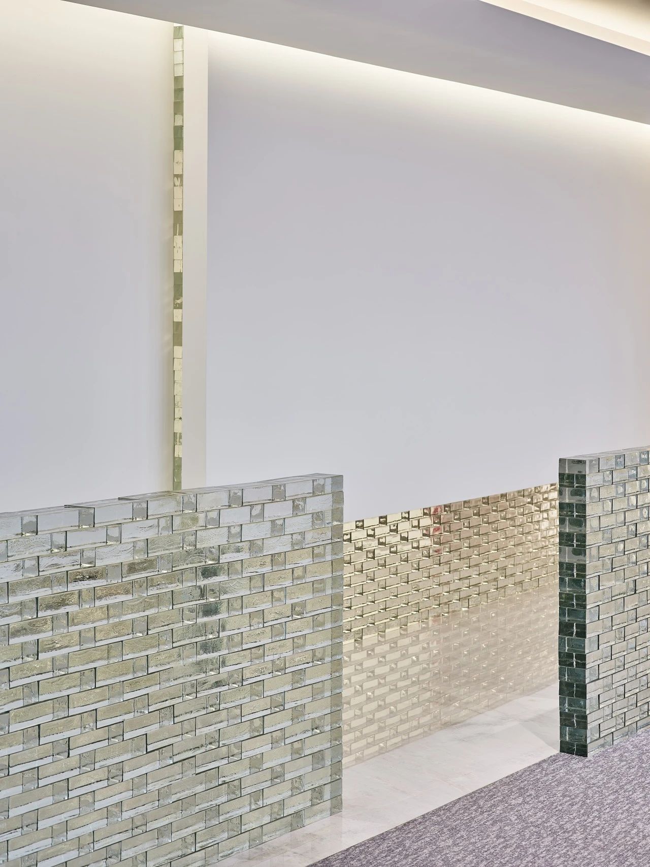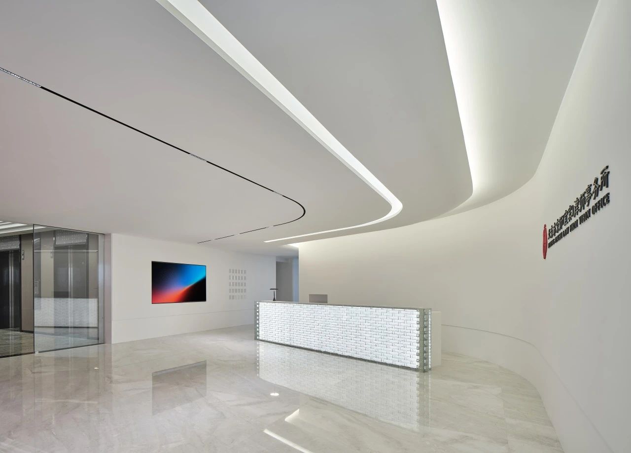 空间整体平面布局融合了原建筑的弧线形设计,形成包容、和谐、自洽具有生命流动感的空间——孕育了一个新生命体的诞生。流线形的天花设计推动了空间流动感,同时引导了空间的动势与流向。穿插在走道两侧透明玻璃砖砌筑的墙体是京师历史文脉的引申、再现与重生。剔透的砖墙与地面抛光流水纹的大理石再次反射了空间中漫反射的光源,构成了充沛、丰盈、灵动的自然氛围,蕴含着生命光晕与律动。