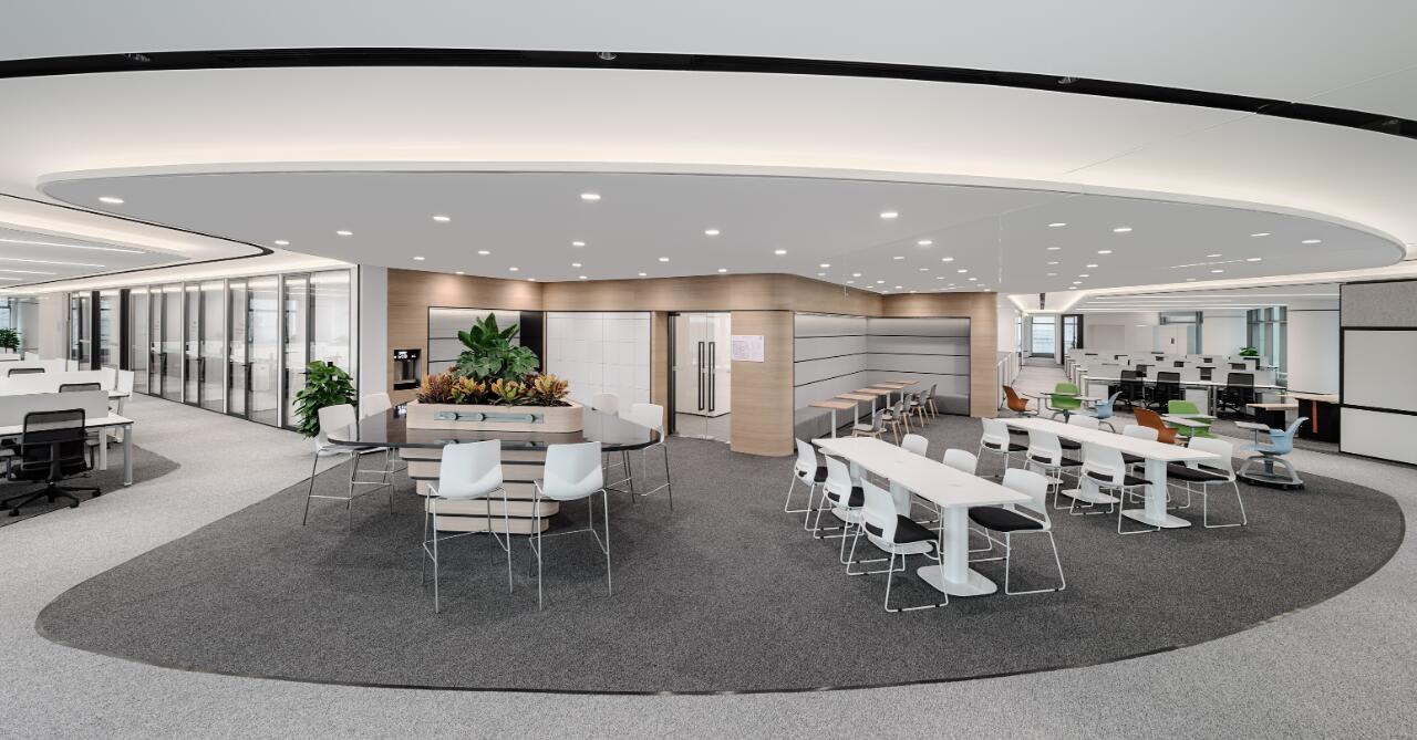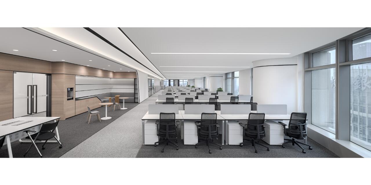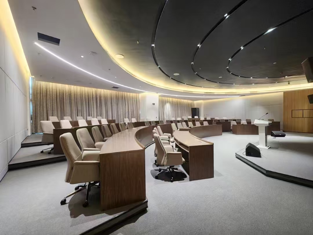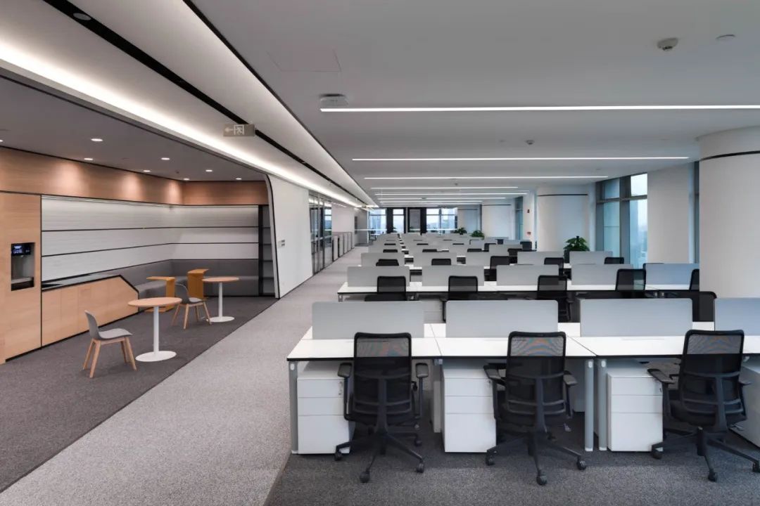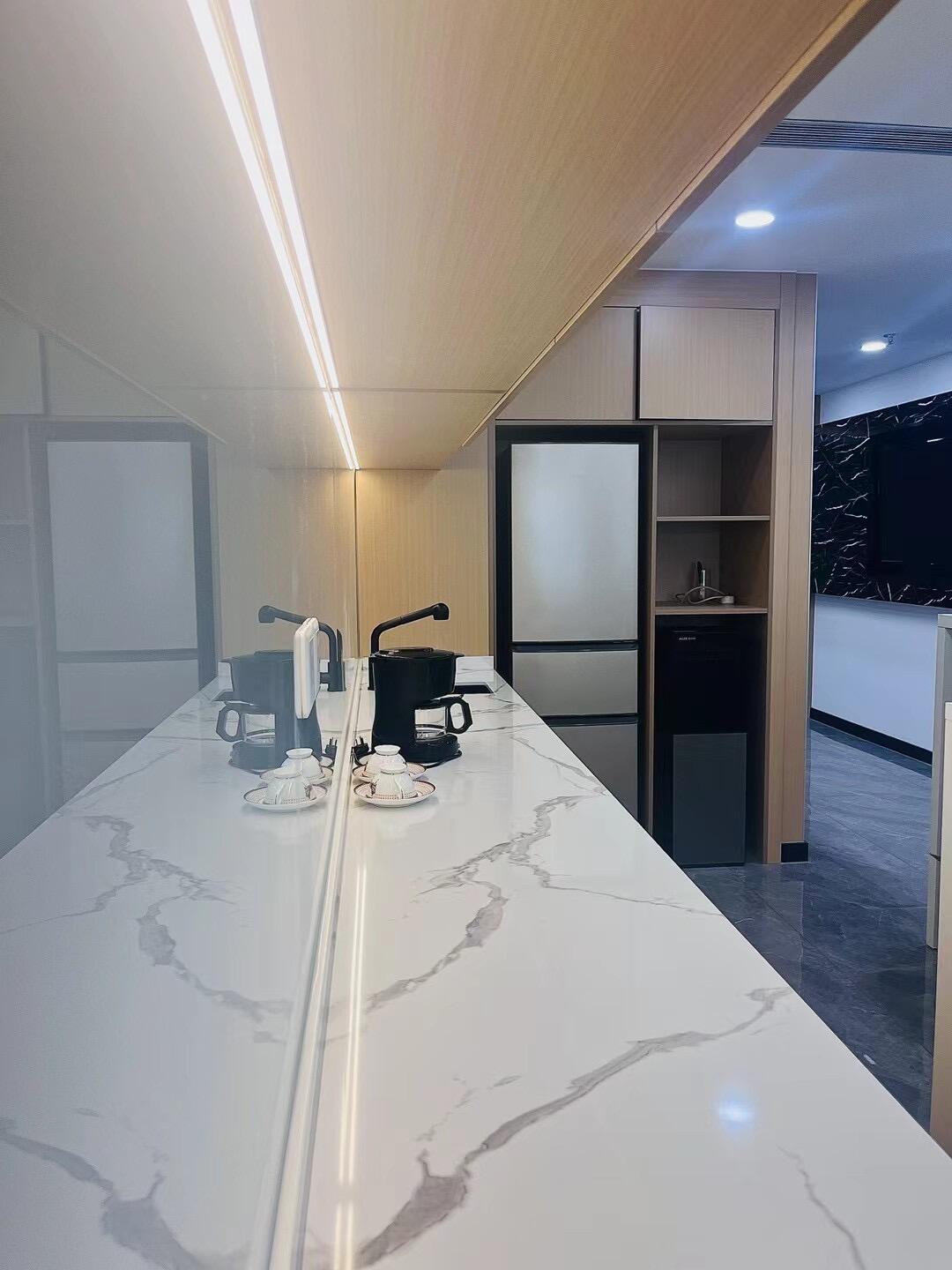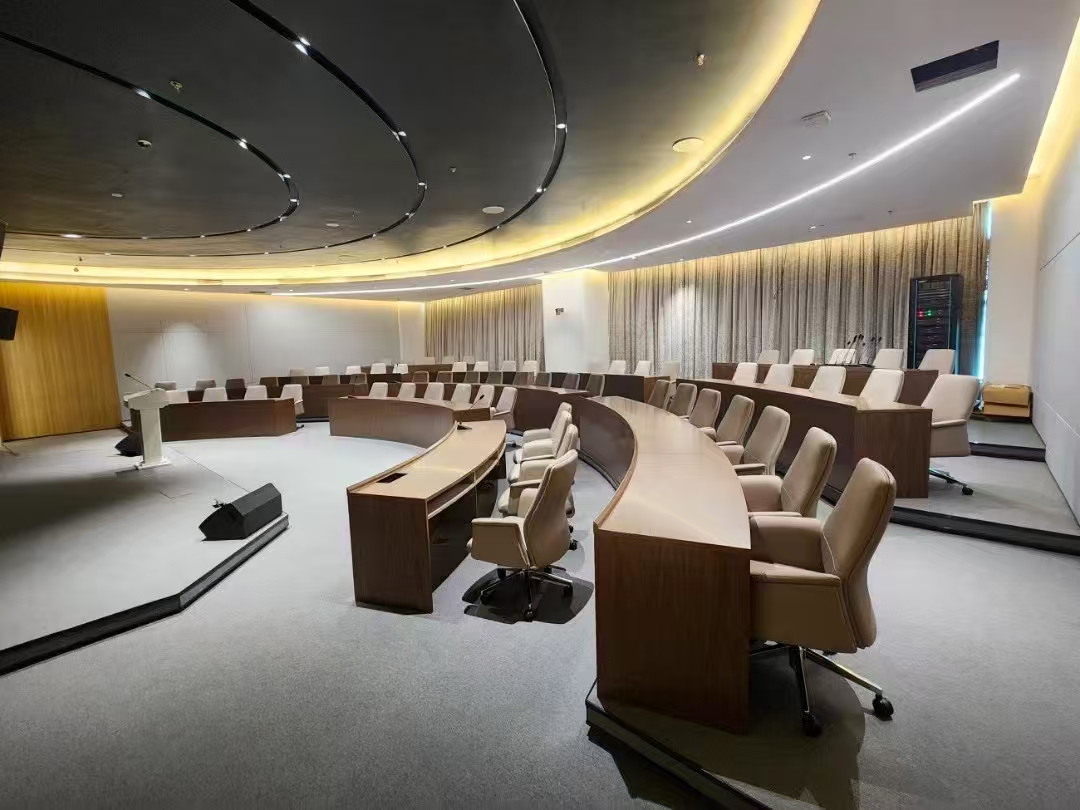空间整体平面布局融合了原建筑的弧线形设计,形成包容、和谐、自洽具有生命流动感的空间——孕育了一个新生命体的诞生。流线形的天花设计推动了空间流动感,同时引导了空间的动势与流向。穿插在走道两侧透明玻璃砖砌筑的墙体是京师历史文脉的引申、再现与重生。剔透的砖墙与地面抛光流水纹的大理石再次反射了空间中漫反射的光源,构成了充沛、丰盈、灵动的自然氛围,蕴含着生命光晕与律动。