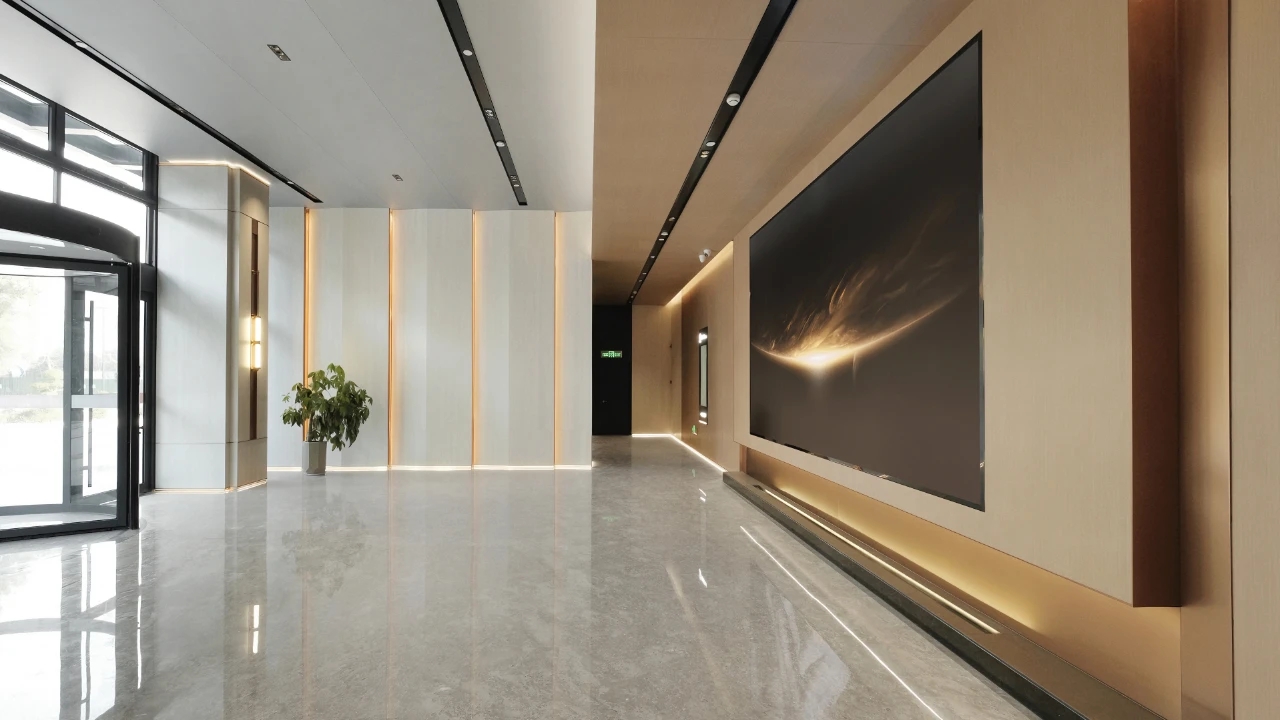 RECEPTION AREA接待区-选用天然岩板纹理,模拟山峦叠嶂的视觉效果,搭配竖向密拼工艺,强化空间纵向延伸感,隐喻“坚韧沉稳”的企业精神。通过热转印工艺还原木纹质感,与岩板形成冷暖对比,中和工业材料的冷硬感,传递自然亲和力。技术细节上,通过材料复合工艺与智能系统的深度整合,实现视觉表现与实用功能的双重突破。
