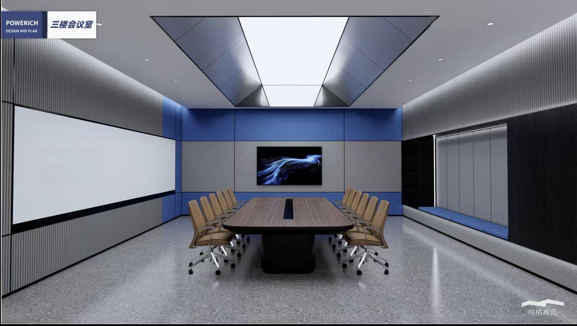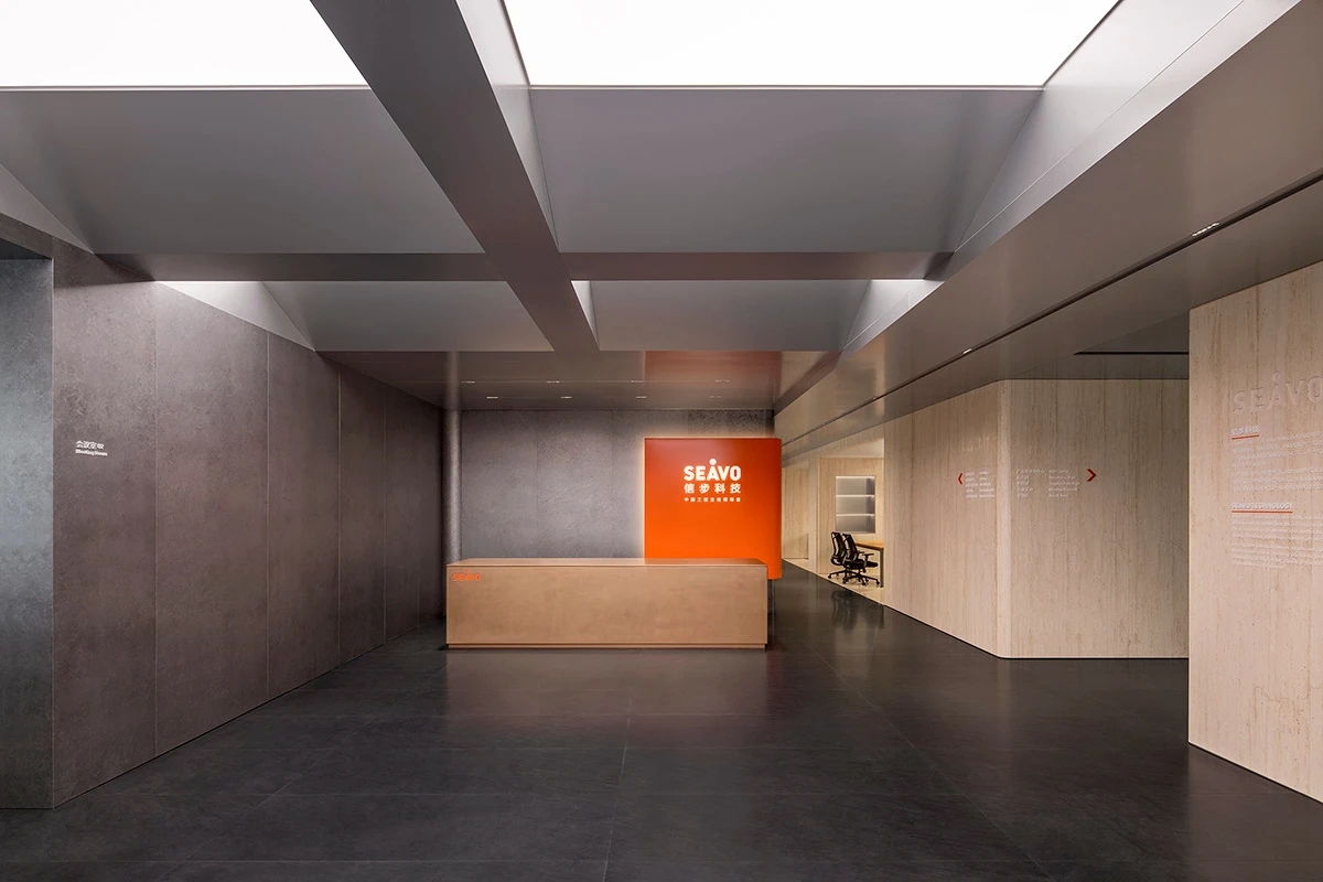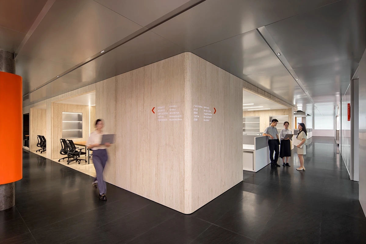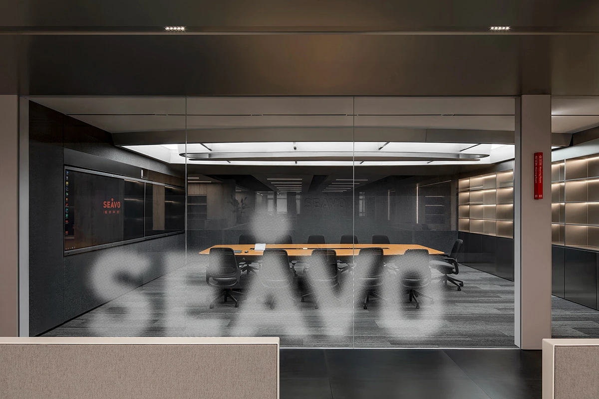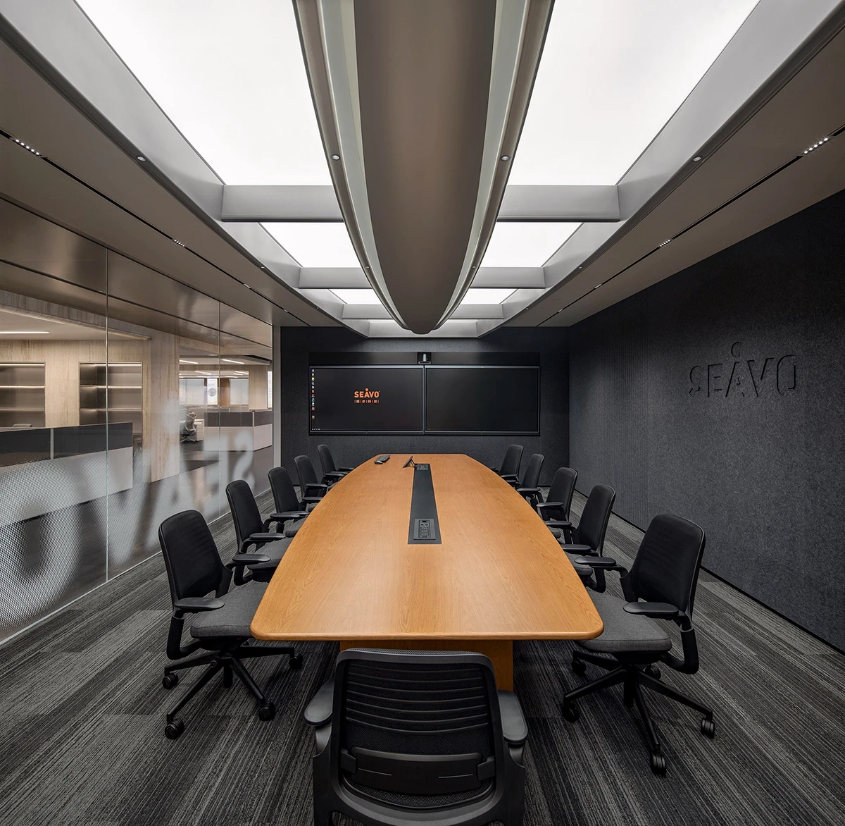 办公空间借鉴包豪斯的设计理念,以“形式追随功能”为核心,结合科技感的元素,营造出简洁、高效且富有未来感的氛围。设计师通过挑高吊顶、软膜顶灯和橙色背景墙的巧妙搭配,创造出视觉上的延伸感与层次感,使空间既开放又富有张力。大尺度走廊与橡木转角隔断构筑半围合空间,在赋予工位独立性的同时,借由全透明会议室与开放办公区的错落分布,形成‘对景’视觉轴线——从人资部穿透ABW区域延伸至商务、产品部门,设计师通过建筑布局和空间规划塑造出南北贯通的空气流动通道,即南北“风道”,利用自然风力实现温度调节和空气循环,构建人与空间共生的动态图景。临窗区域通过开放式工位与玻璃房间的进退组合,营造出虚实相生的光影层次,将中国传统建筑美学的光影智慧转译为现代语言。主会议室以未来主义美学为基调,顶部连续软膜光源与舰艇造型铝制吊顶构建动态光影界面,其形态逻辑与下方橡木会议桌形成拓扑学对话,隐喻“刚柔辩证”的空间叙事。智能光控系统将功能性照明升维为空间交互界面,满足高效会议、能耗管控与人性化体验的多重需求。墙面高性能聚酯纤维吸声模块,在保障会议私密性的同时,通过材质肌理的温度差,消解了工业美学的视觉压迫。