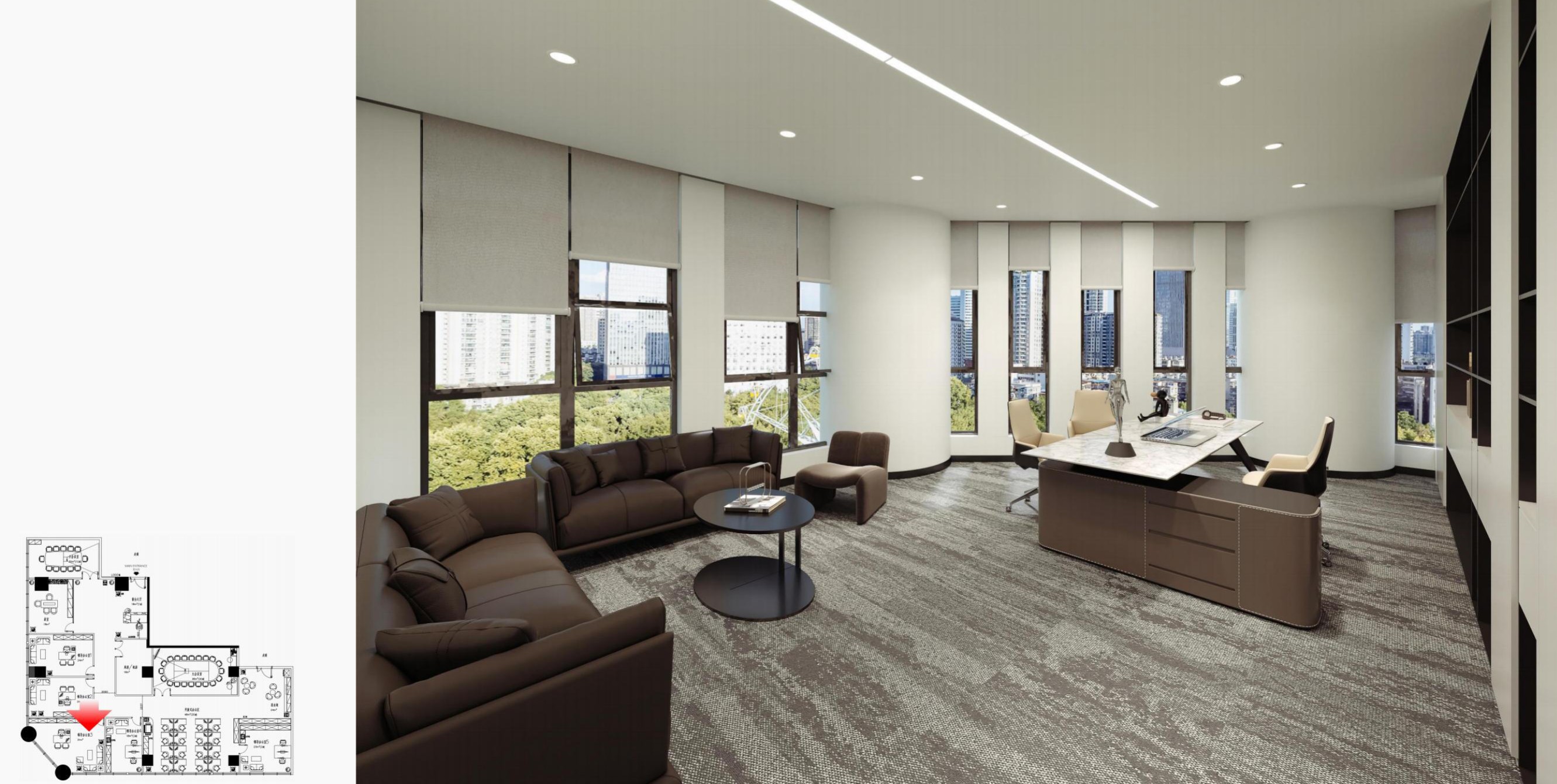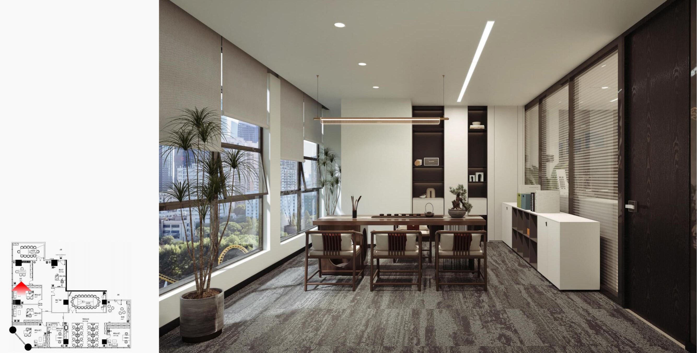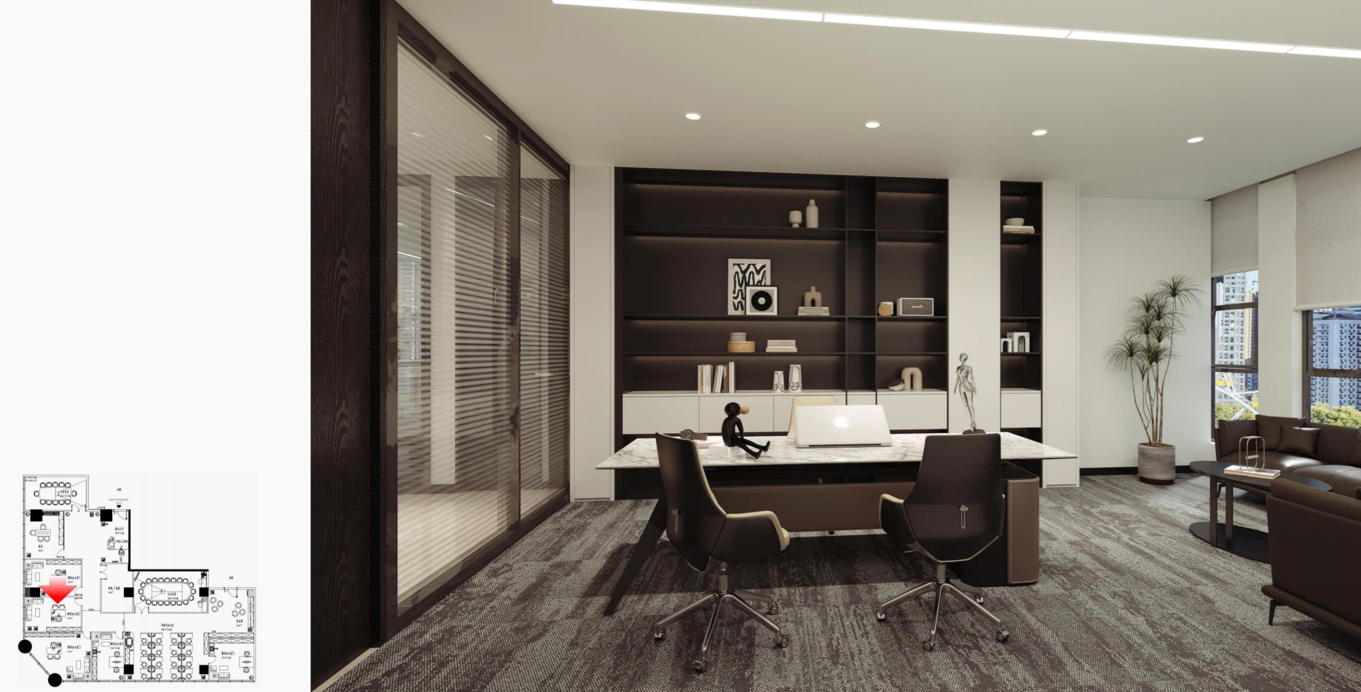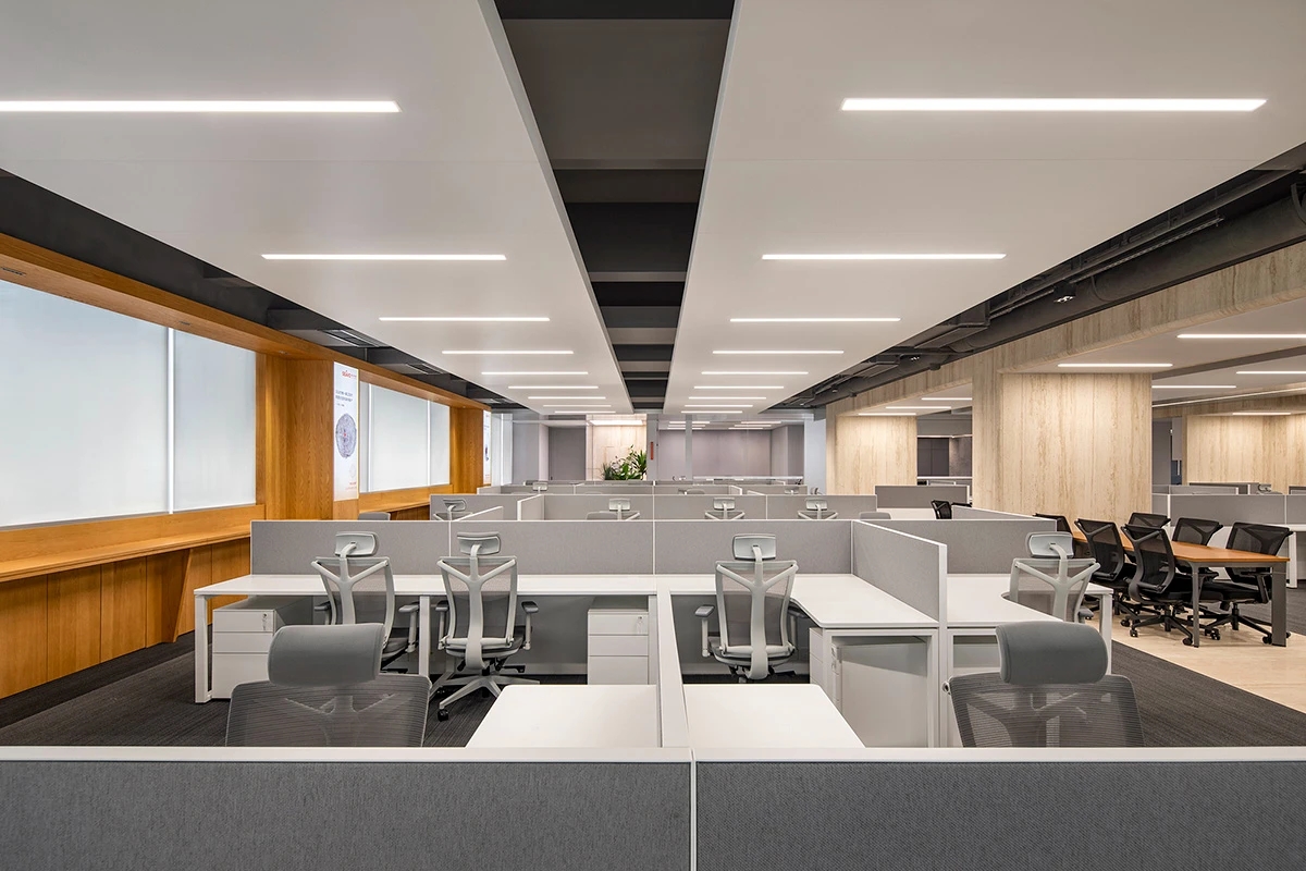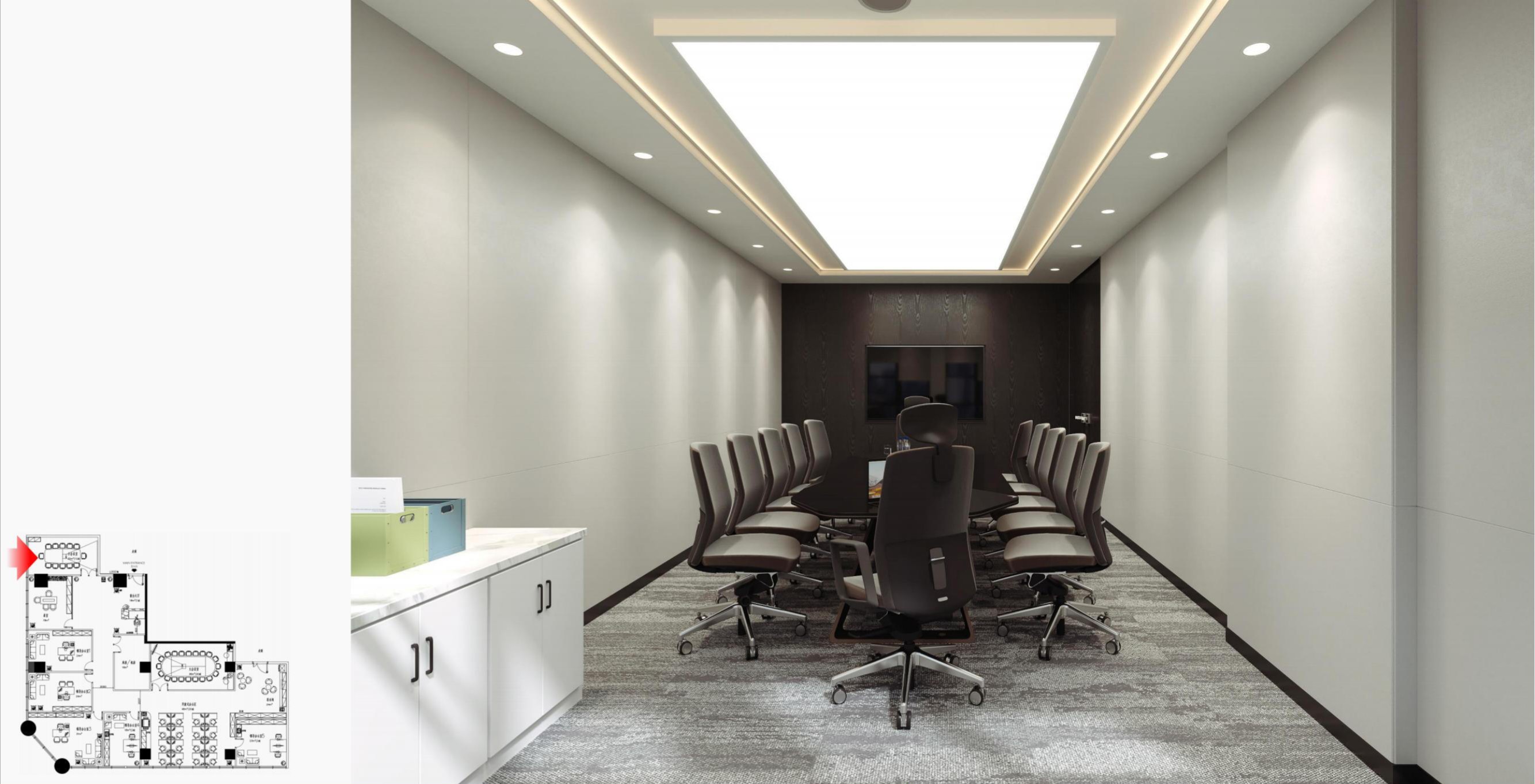办公空间借鉴包豪斯的设计理念,以“形式追随功能”为核心,结合科技感的元素,营造出简洁、高效且富有未来感的氛围。设计师通过挑高吊顶、软膜顶灯和橙色背景墙的巧妙搭配,创造出视觉上的延伸感与层次感,使空间既开放又富有张力。大尺度走廊与橡木转角隔断构筑半围合空间,在赋予工位独立性的同时,借由全透明会议室与开放办公区的错落分布,形成‘对景’视觉轴线——从人资部穿透ABW区域延伸至商务、产品部门,设计师通过建筑布局和空间规划塑造出南北贯通的空气流动通道,即南北“风道”,利用自然风力实现温度调节和空气循环,构建人与空间共生的动态图景。临窗区域通过开放式工位与玻璃房间的进退组合,营造出虚实相生的光影层次,将中国传统建筑美学的光影智慧转译为现代语言。主会议室以未来主义美学为基调,顶部连续软膜光源与舰艇造型铝制吊顶构建动态光影界面,其形态逻辑与下方橡木会议桌形成拓扑学对话,隐喻“刚柔辩证”的空间叙事。智能光控系统将功能性照明升维为空间交互界面,满足高效会议、能耗管控与人性化体验的多重需求。墙面高性能聚酯纤维吸声模块,在保障会议私密性的同时,通过材质肌理的温度差,消解了工业美学的视觉压迫。