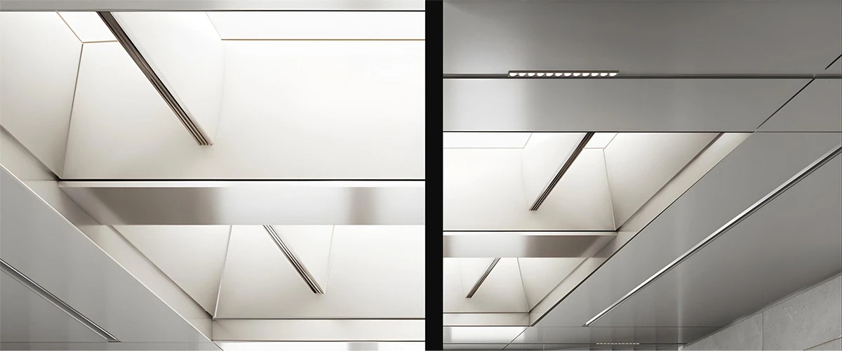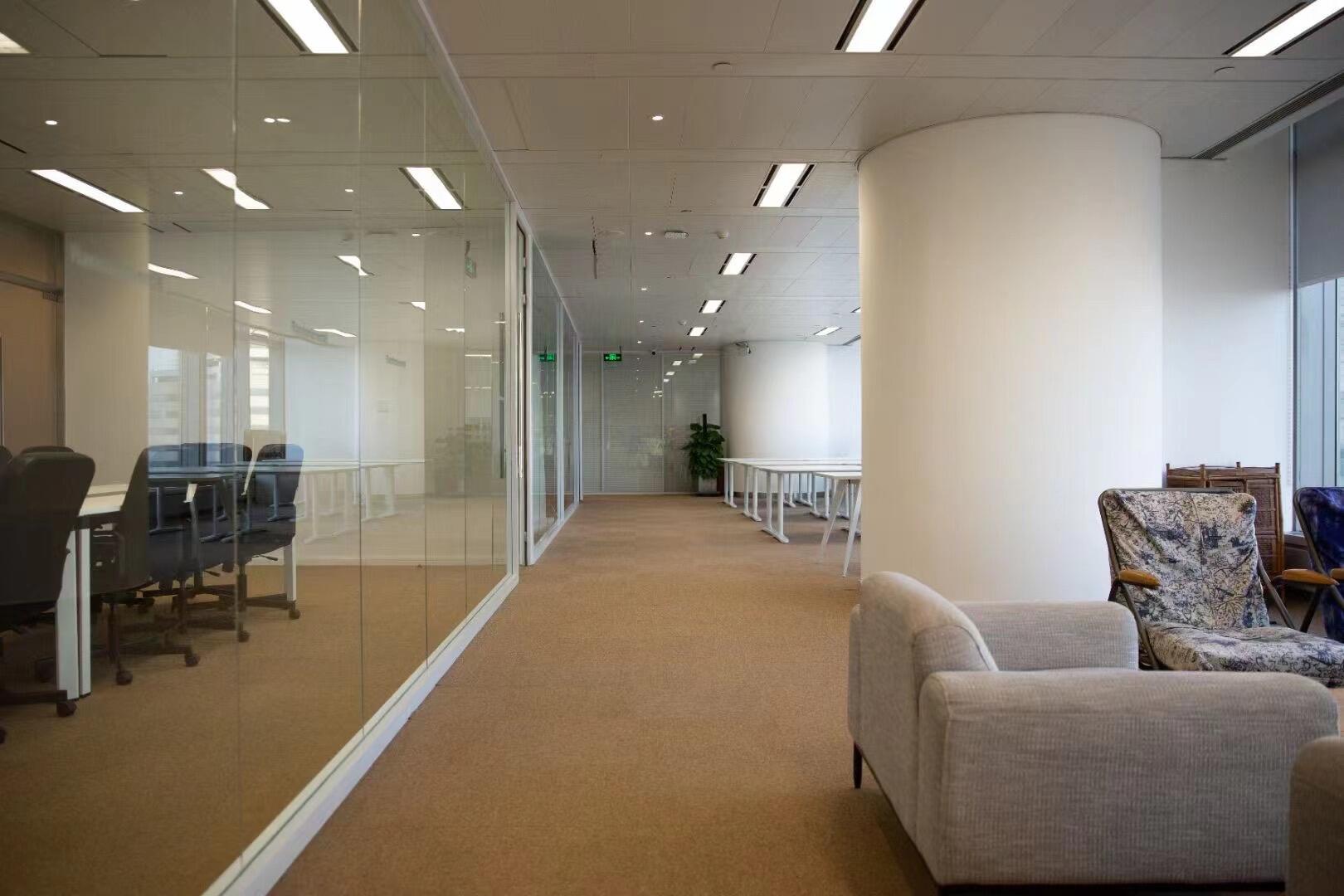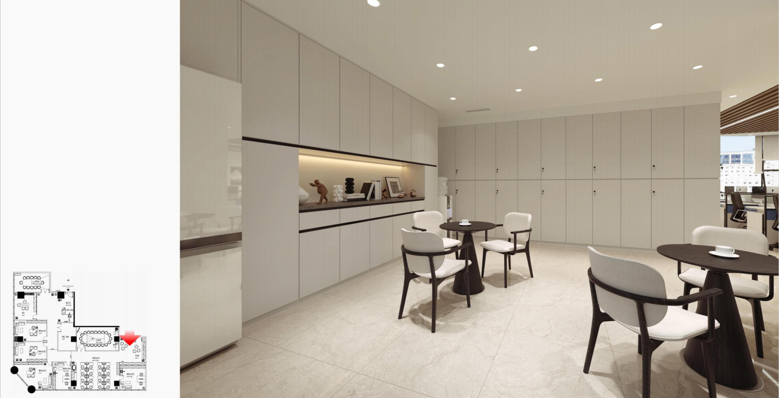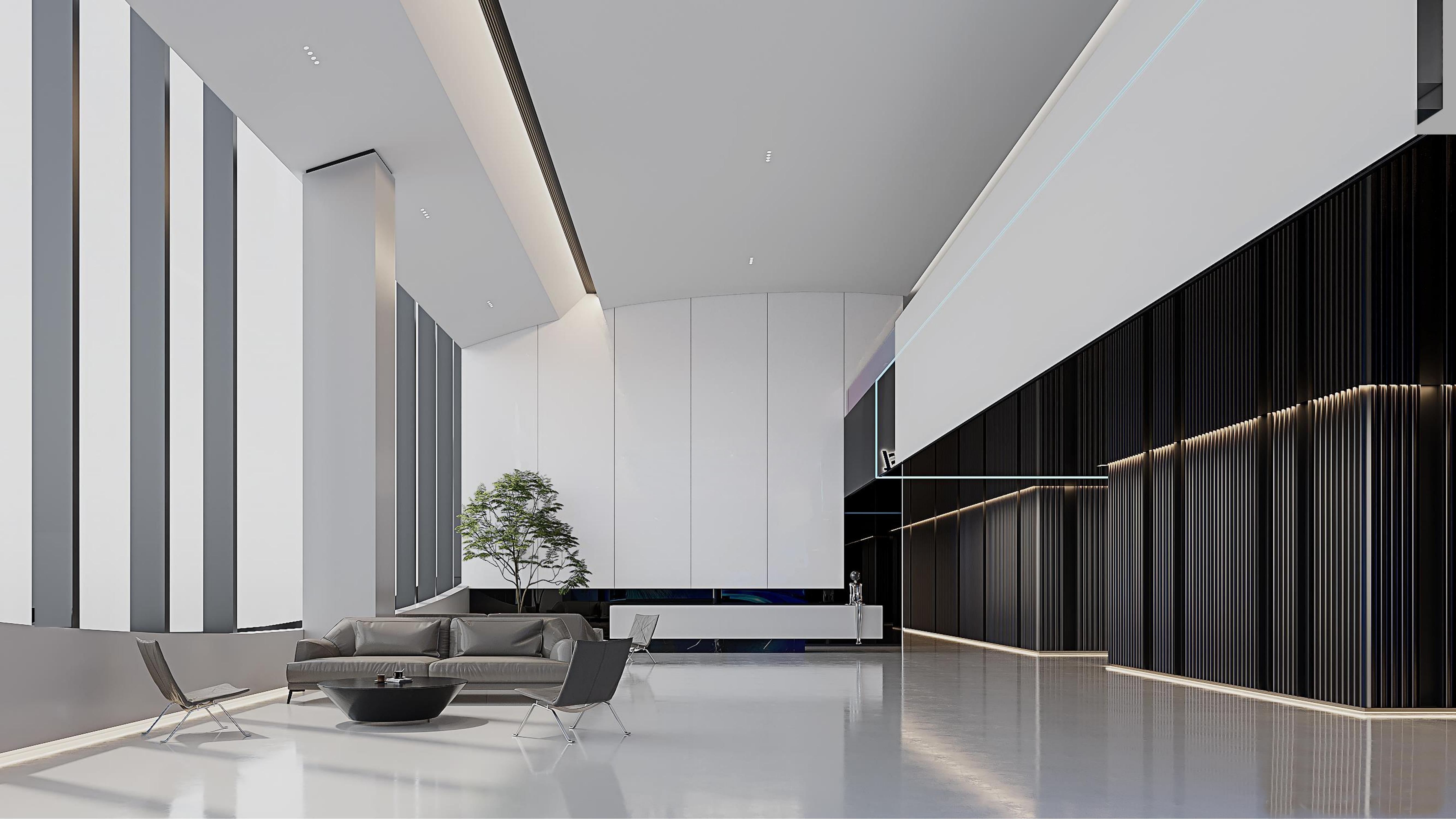 入口电梯前厅,作为空间的第一触点,被赋予“微型剧场”般的仪式感。在保留原始外立面样式的基础上,设计团队以中式横梁为灵感,结合工业风格重构传统建筑语言,通过形态整合消解原有横梁的杂乱感,达成空间调性的统一性。挑高的吊顶以极简的几何语言勾勒出空间的垂直维度,空间单元如诗般展开,摒弃冗余的软装介入,仅通过材质、比例与光线的精确控制构建“留白”的意境,创造出一个可供思绪流动的“负空间”(Negative Space)。访客置身其中,既能感受到工业美学的理性张力,又能在无物的纯粹中捕捉到时间的痕迹与空间的呼吸,从而获得一种超越物质层面的精神共鸣。“在相对老旧的工业建筑中,我们面临的最大挑战是如何合理规划功能区,故而摒弃了传统的隔墙划分方式,利用现有结构和中央体量之间的空间,创造出一种非线性的循环布局,这样避免了空间的拥挤并且最大化地利用了每一寸空间。”设计师如是说。