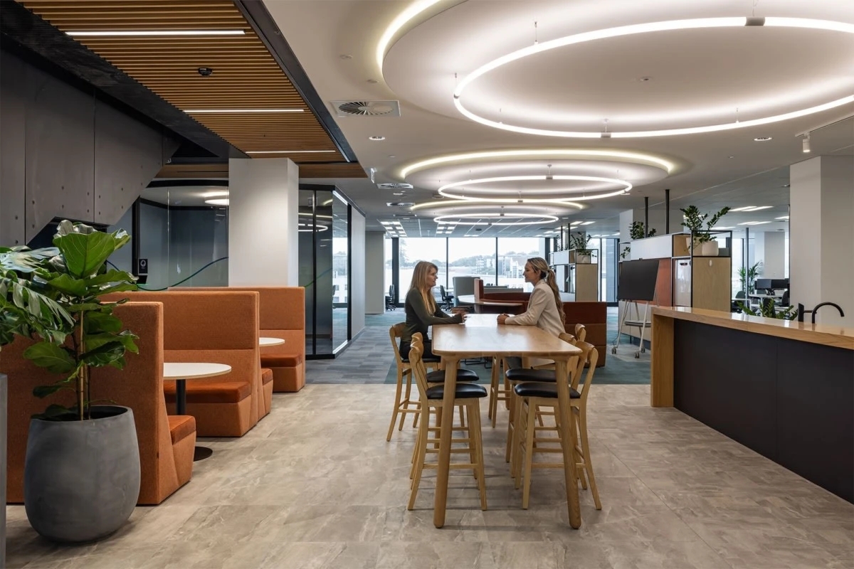 从设计的初期阶段起,Vector就将可持续性作为空间布局和功能的核心原则。整个办公环境采用绿色网格系统,促进了建筑内部的能源效率和资源利用的最大化。这种绿色网格系统不仅有助于降低能耗,还通过高效的空间布局提升了工作场所的整体效率。宽敞的办公区域支持灵活的工作方式,包括灵活工作站和可预订的办公桌。这种空间设计鼓励了团队协作与创新,并通过不同类型的工作站为员工提供了个性化的选择,满足他们在不同工作情境下的需求。办公空间的咖啡馆和阳台设计同样体现了对员工福祉的高度关注。宽敞的咖啡馆提供了一个让员工可以休息、放松并与同事交流的环境。而阳台的可操作屋顶更是加强了与周围自然景观的连接,让员工能够在舒适的空间中享受奥克兰的美丽景色。