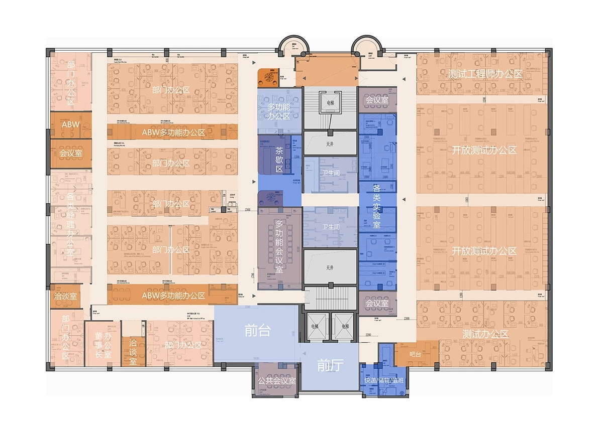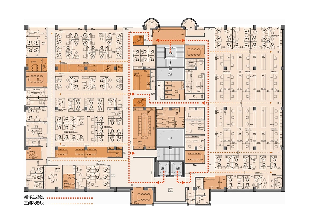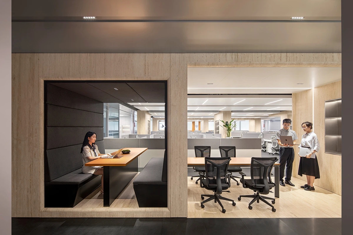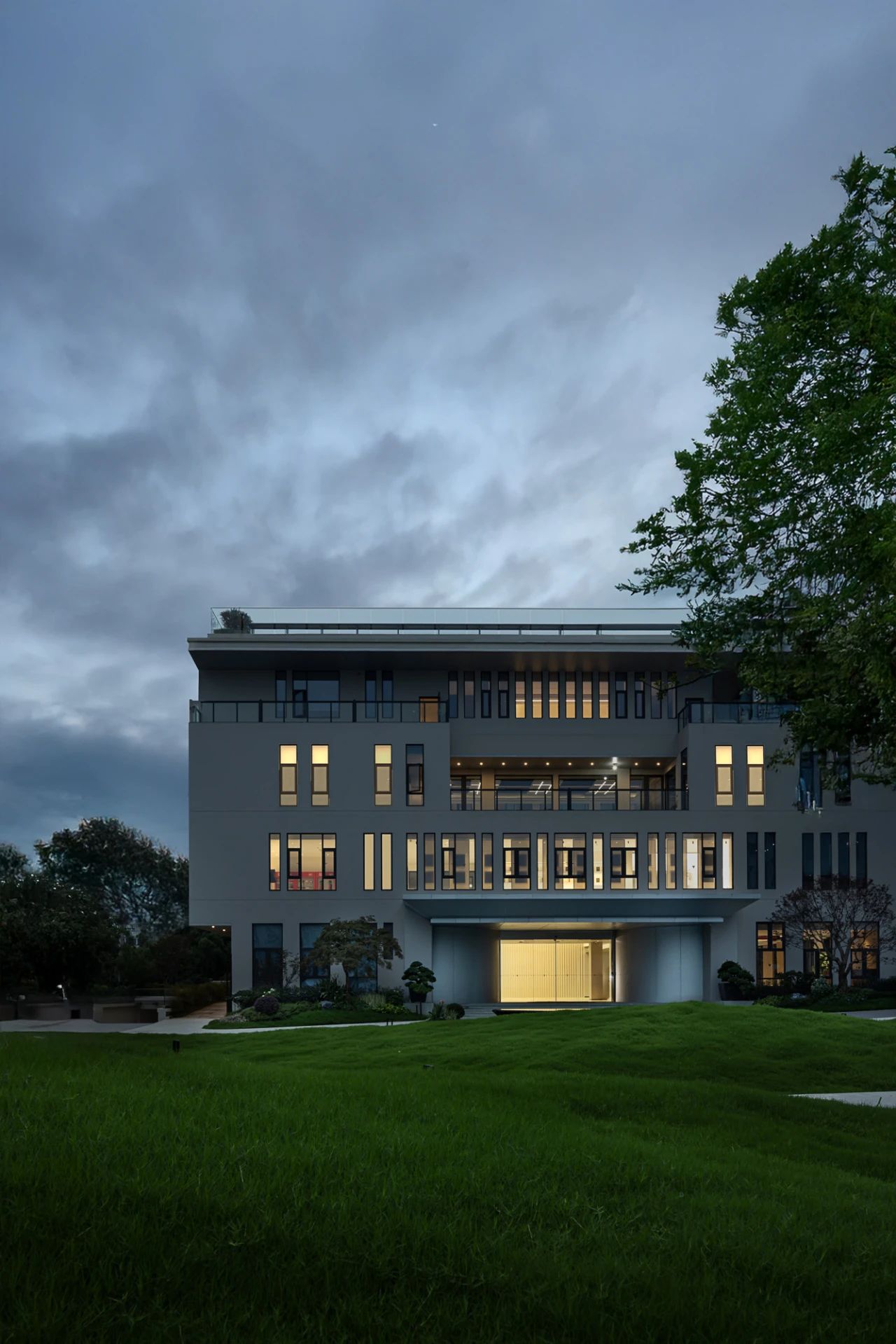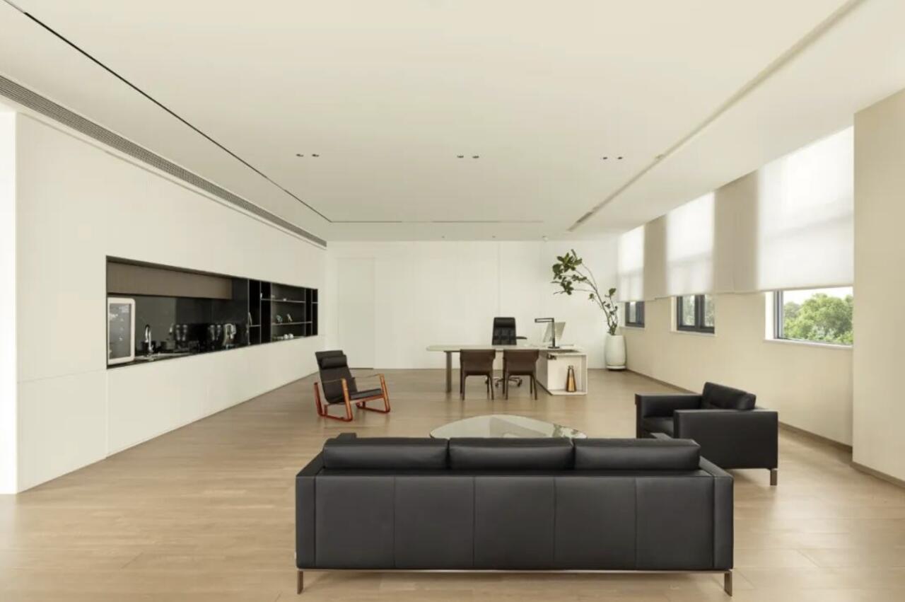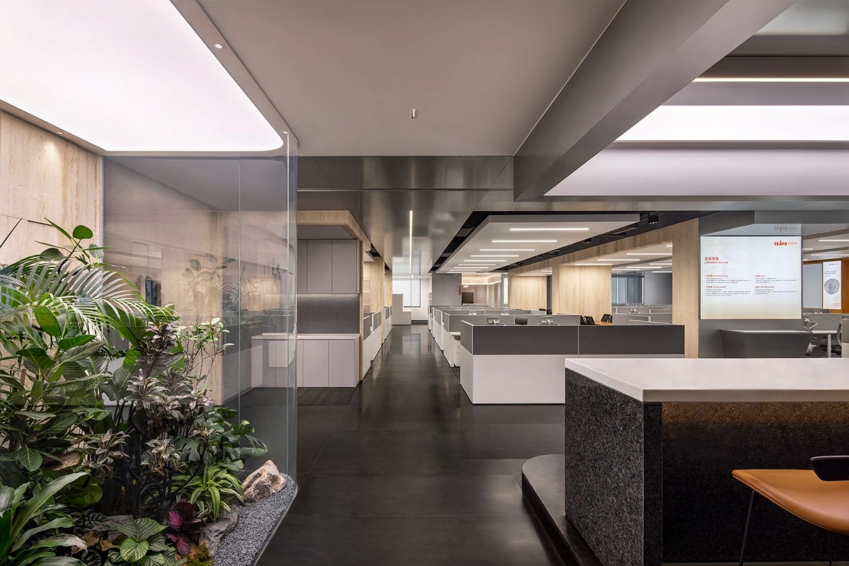 3-4楼则被定义为企业的研发和管理办公空间。3楼的空间环绕一个精致的瓦砖小花园展开,蜿蜒的连廊实现了室内与室外空间的最大化连通,为员工提供了一个绿意盎然的休息和思考空间,使自然之美与办公空间相融合。