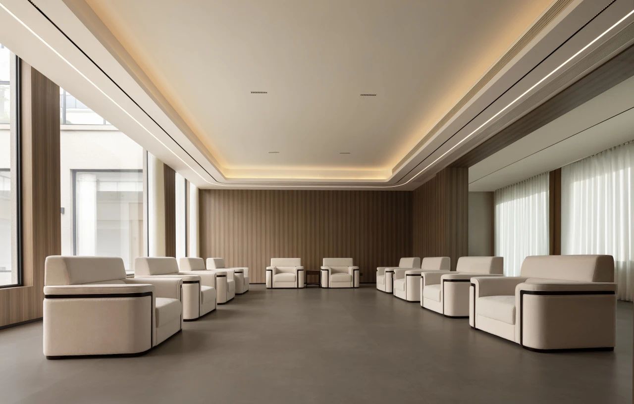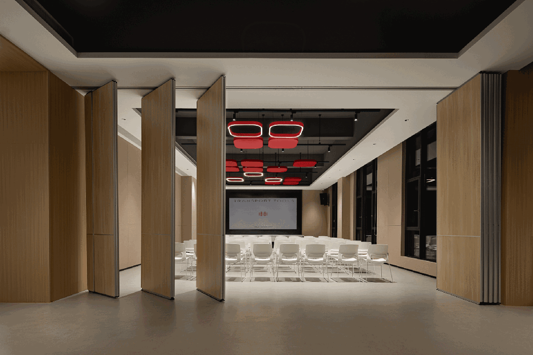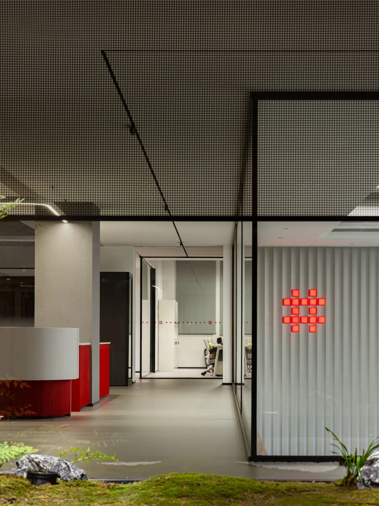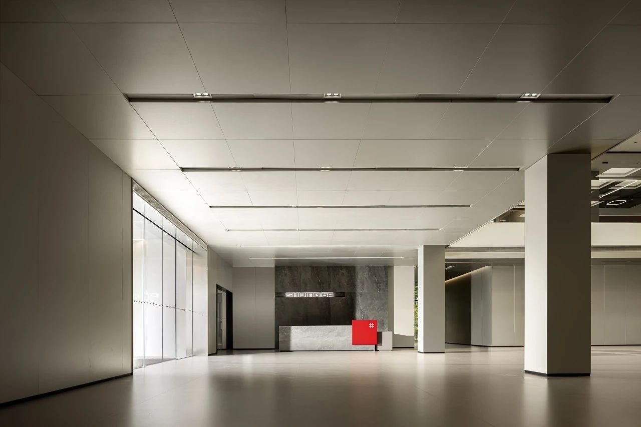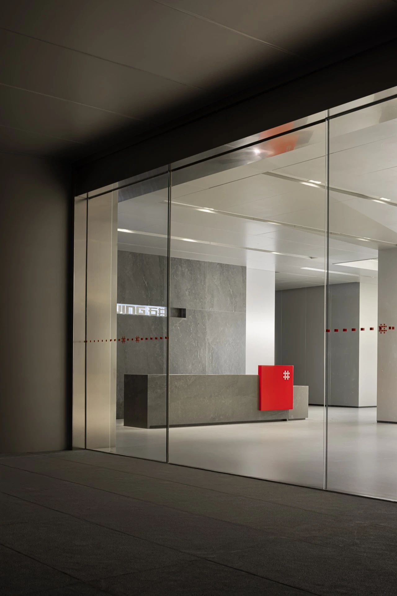 石井办公楼的大门采用玻璃作为主体材料,营造出通透感与开放性,内部空间与其标志性的LOGO一目了然。这种设计不仅避免了封闭性,同时也起到了引导的作用,体现了石井工具有限公司开放包容的企业文化。