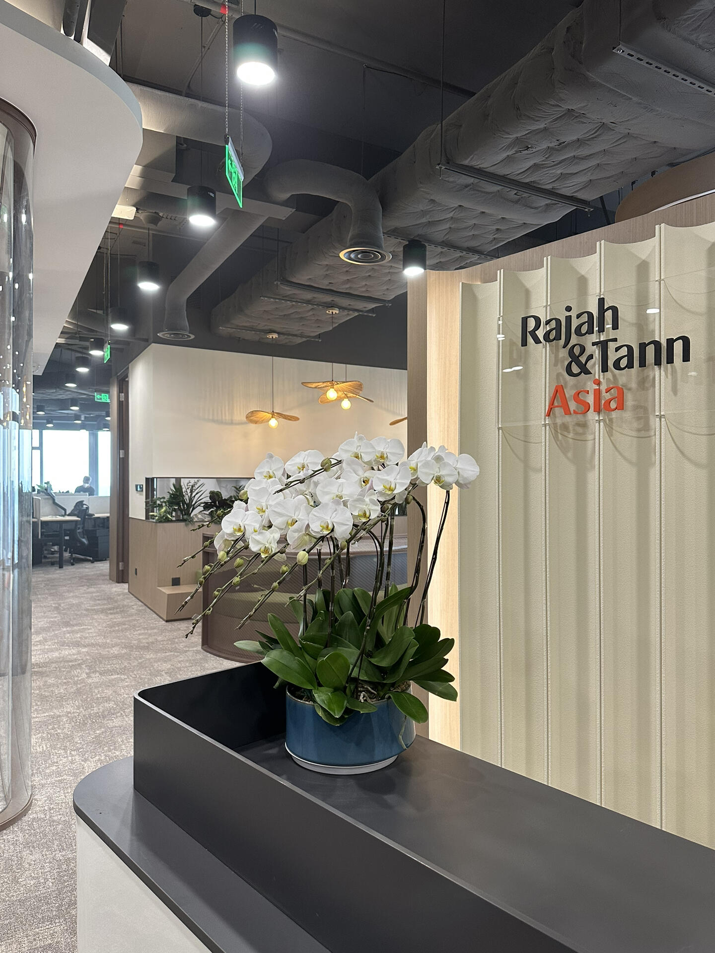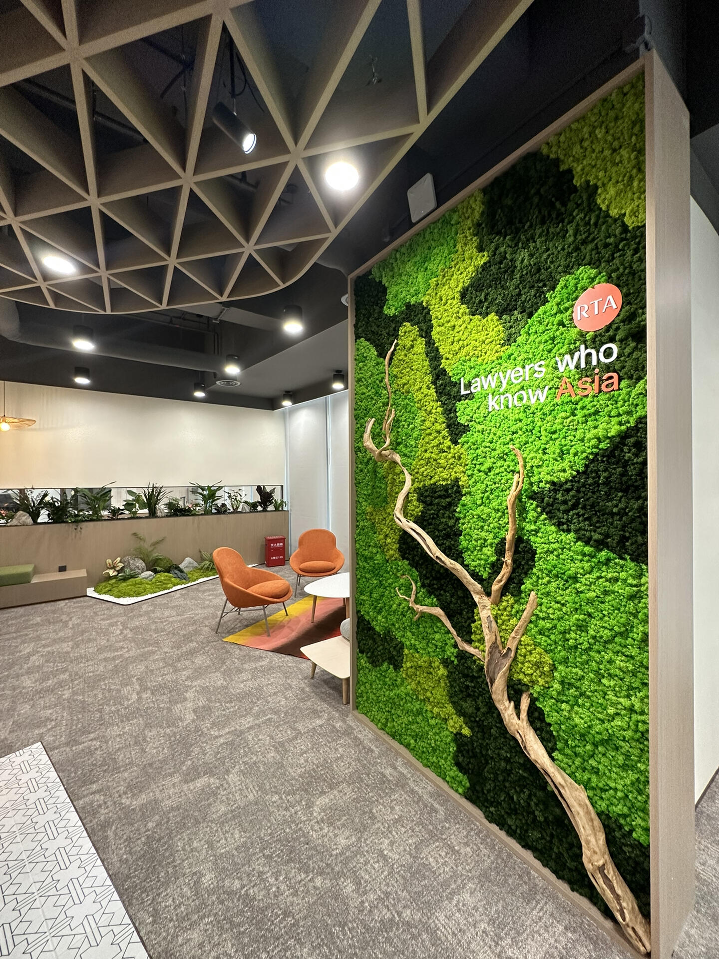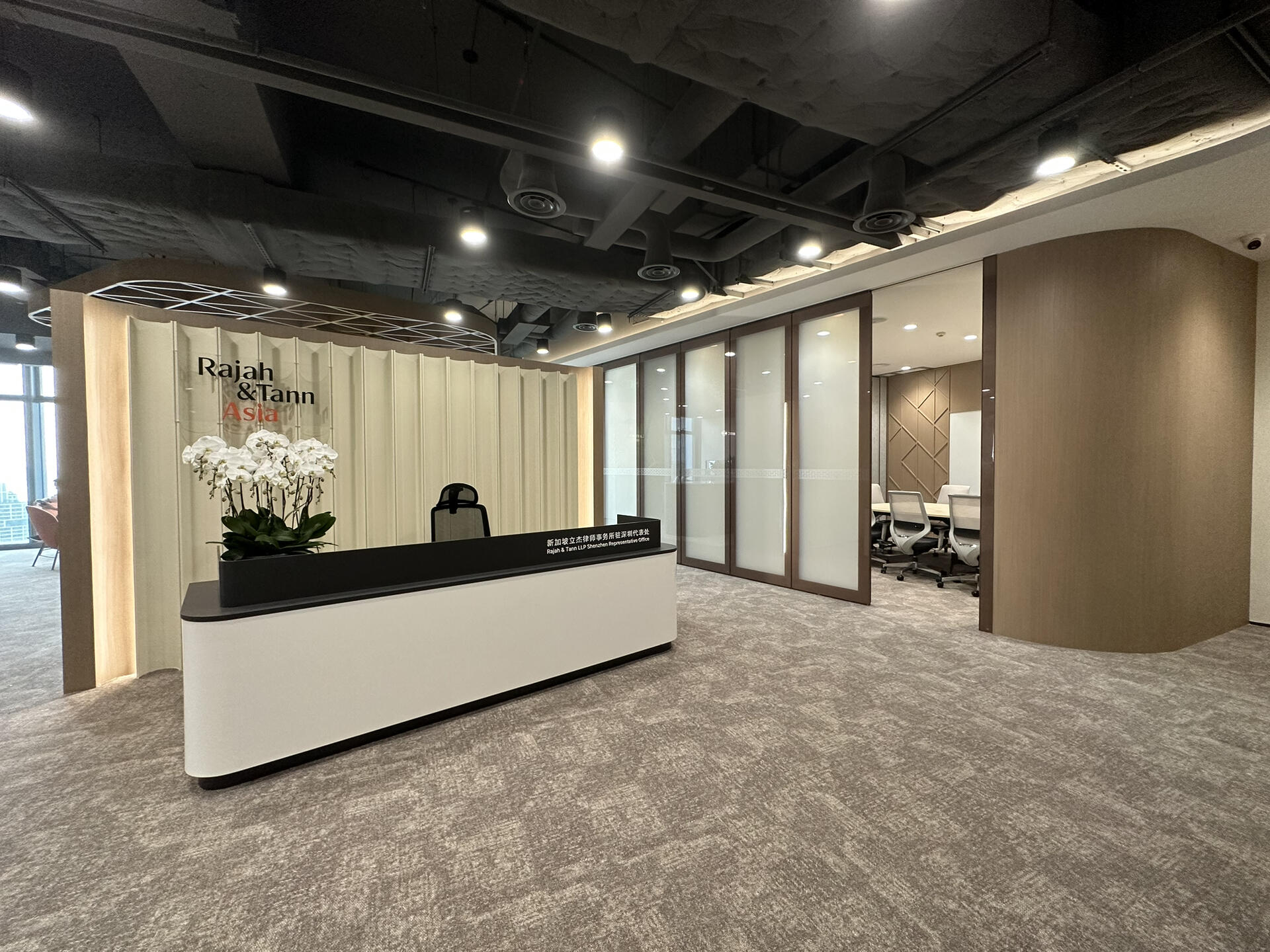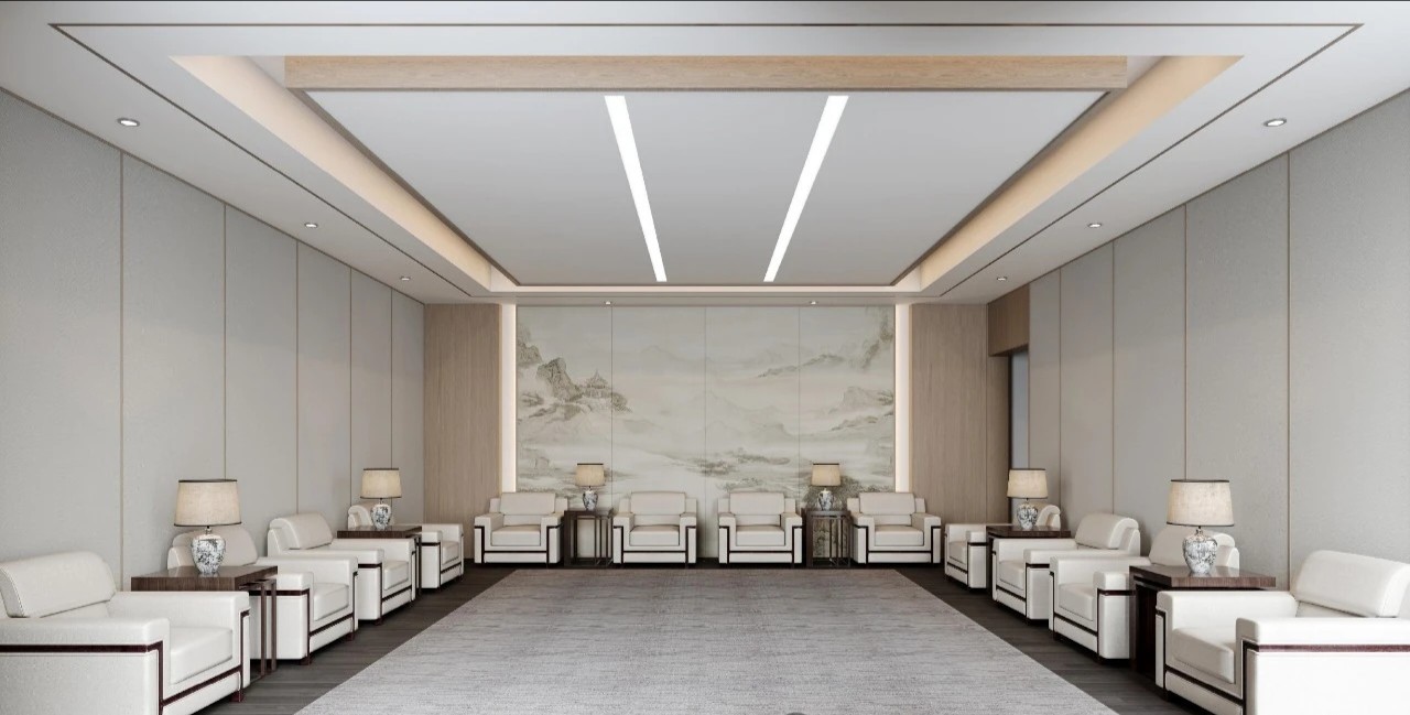 接待室的整体布局采用对称设计,给人一种平衡和稳定的感觉。宽敞的空间和简洁的线条使整个环境显得大气而不失温馨。设计中主要使用了中性色调,如白色、灰色和米色,搭配木质元素,营造一种宁静而高雅的氛围。局部点缀的绿色植物和装饰画,为空间增添了一丝生机和艺术感。