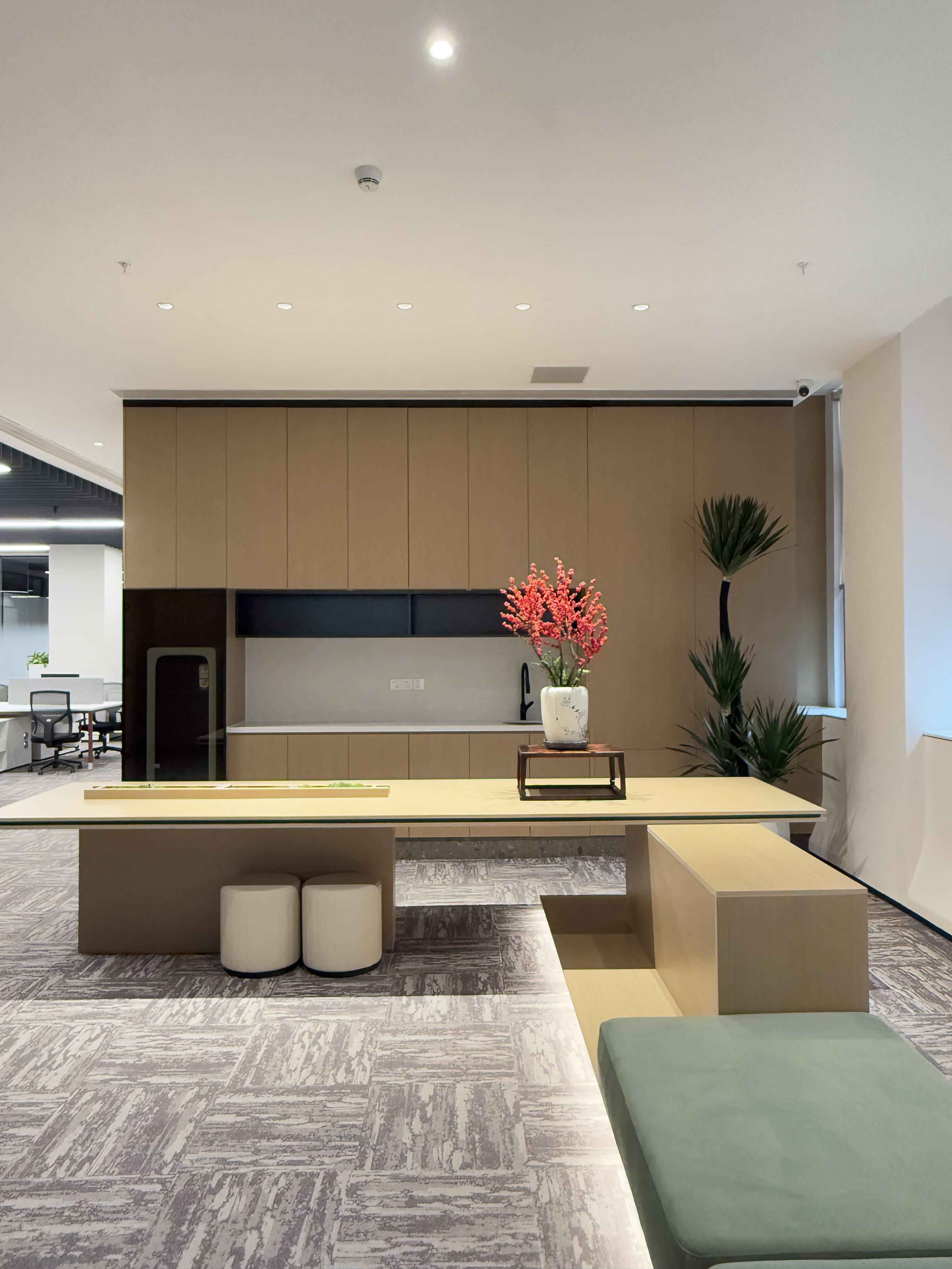 本项目不仅是物理空间的改造,更是一次办公场景多元化尝试,空间采用模块化设计,灵活划分团队协作区、独立工位及私密会议室。公共区域设置开放式洽谈区与非正式的茶水间,鼓励员工在非结构化交流中碰撞创意;而通过玻璃隔断实现的半私密空间,既保障了专注工作的需求,又维系了空间的通透性。