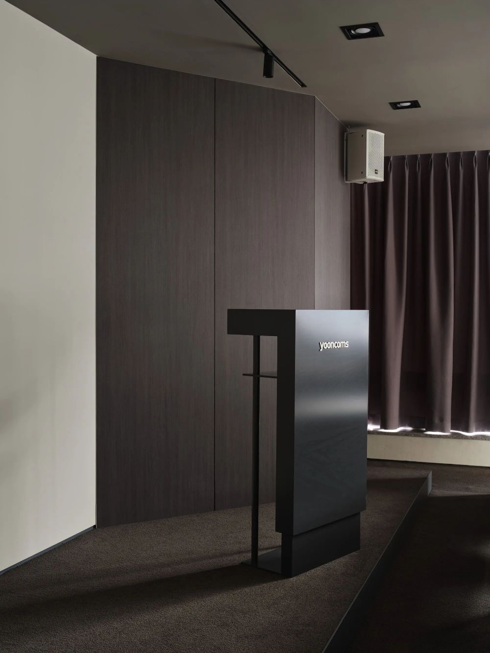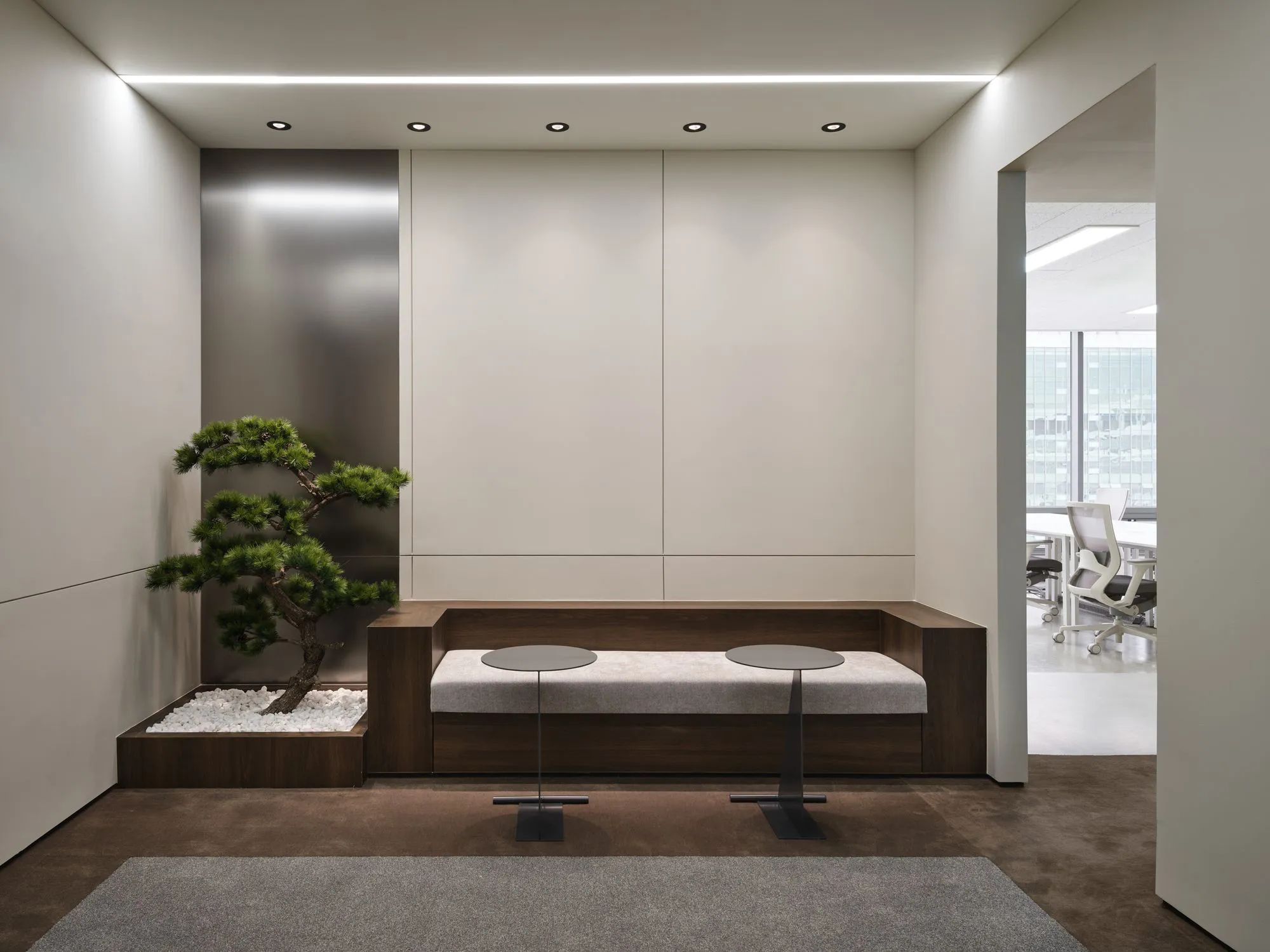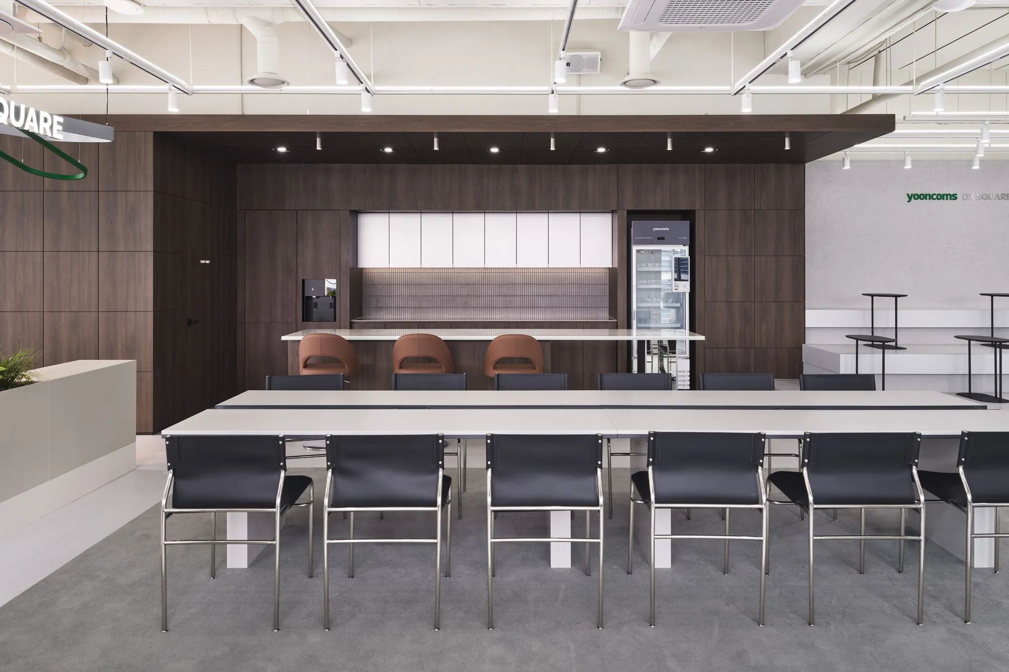 采用了 “新传统 ”的概念--将看似对立的理念进行组合。设计的目标是将公司的历史成就与新兴技术的前瞻性形象相协调,在同一空间内体现出对 “传统 ”和 “未来 ”的双重关注。设计将丰富的木材与轻质钢材、光滑的金属饰面与粗糙的石材纹理、浅色调与深木色相结合,以达到深度和视觉张力的效果。墙壁和天花板采用了微妙的灰色调,并融入了 YOONCOMS 的品牌色--绿色,使公司的品牌形象在整个空间中产生柔和的共鸣。