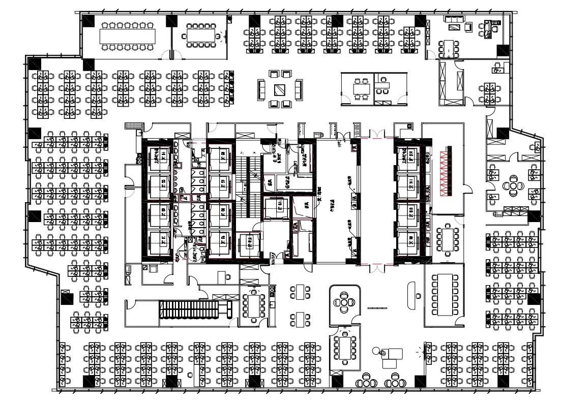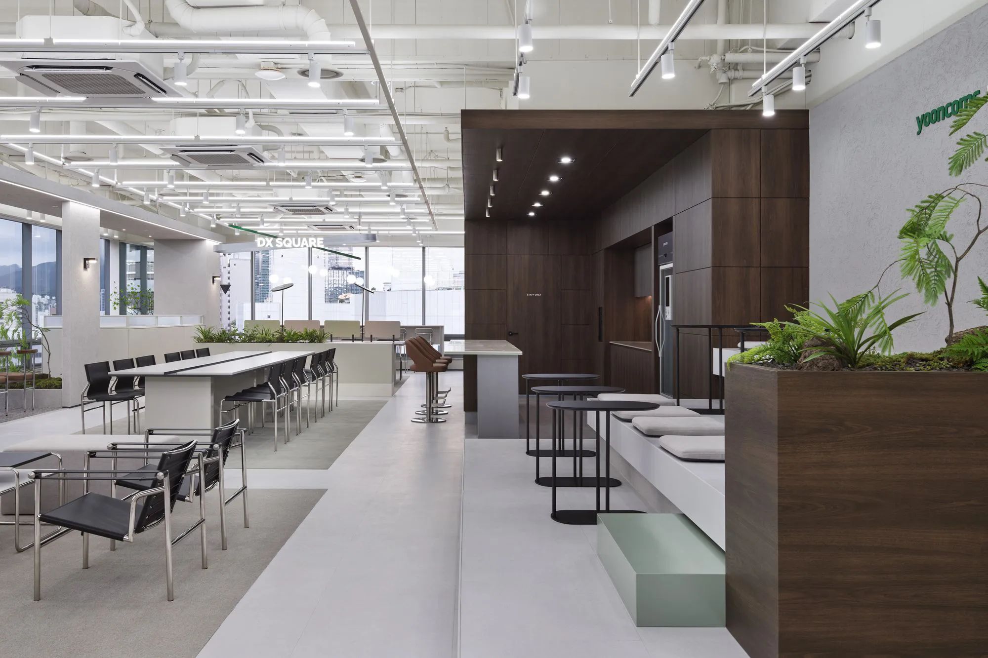 工作空间布局精心分隔了 DX 广场、会议室、研讨室和办公区等关键区域,以防止功能重叠,确保每个区域都有其独特的用途。研讨室设计有专门的外部入口,并采用隔音和吸音措施,以防止噪音扩散到相邻的会议室。该区域还包括一个前庭和一条 90 度走廊,以进一步提高私密性和安静性。