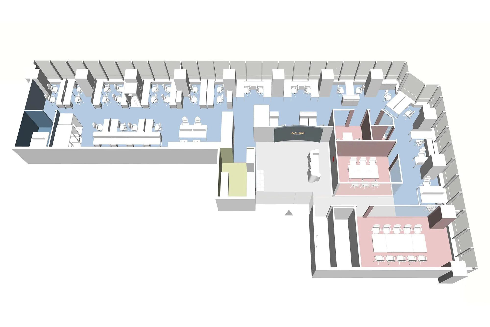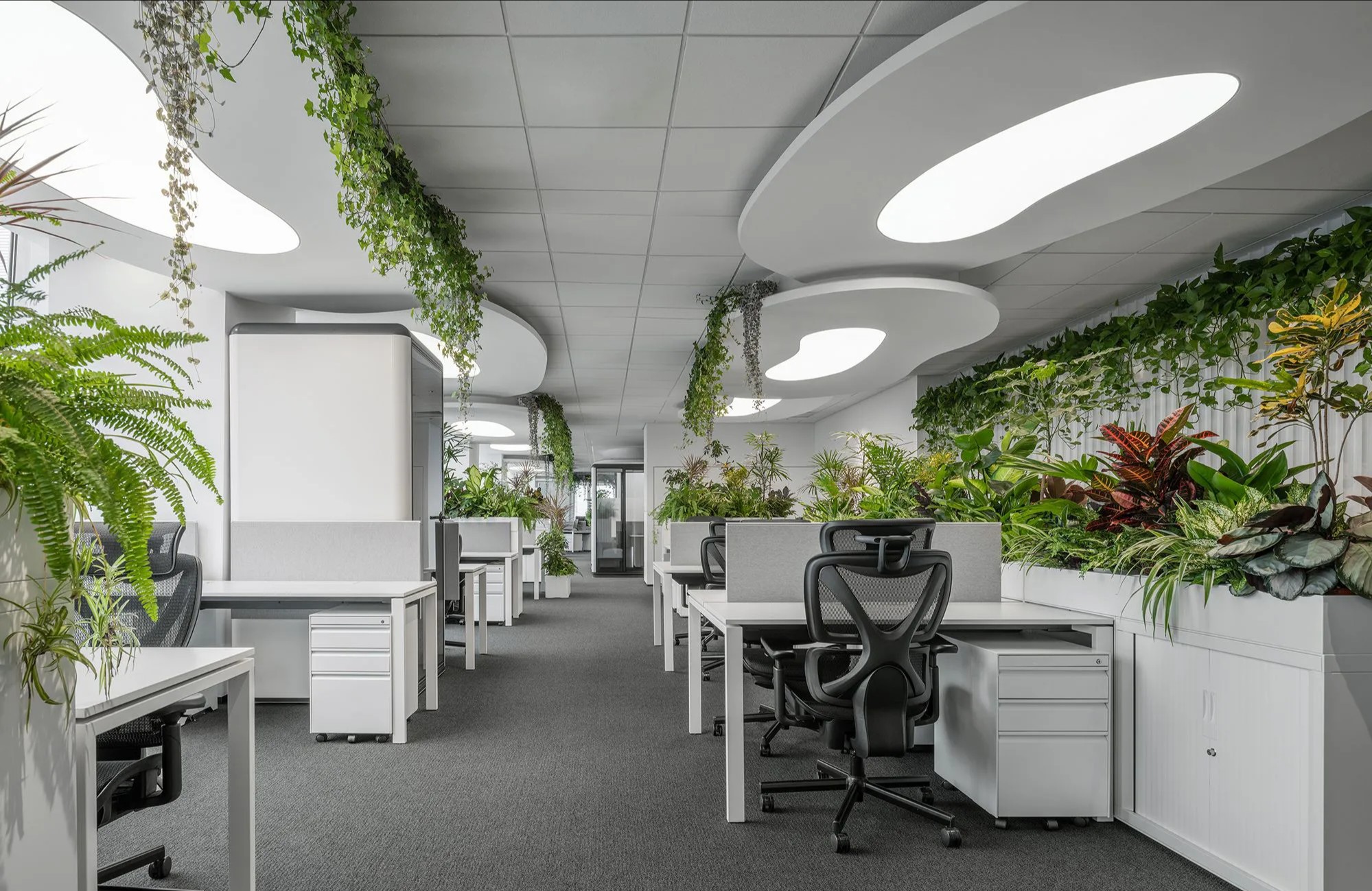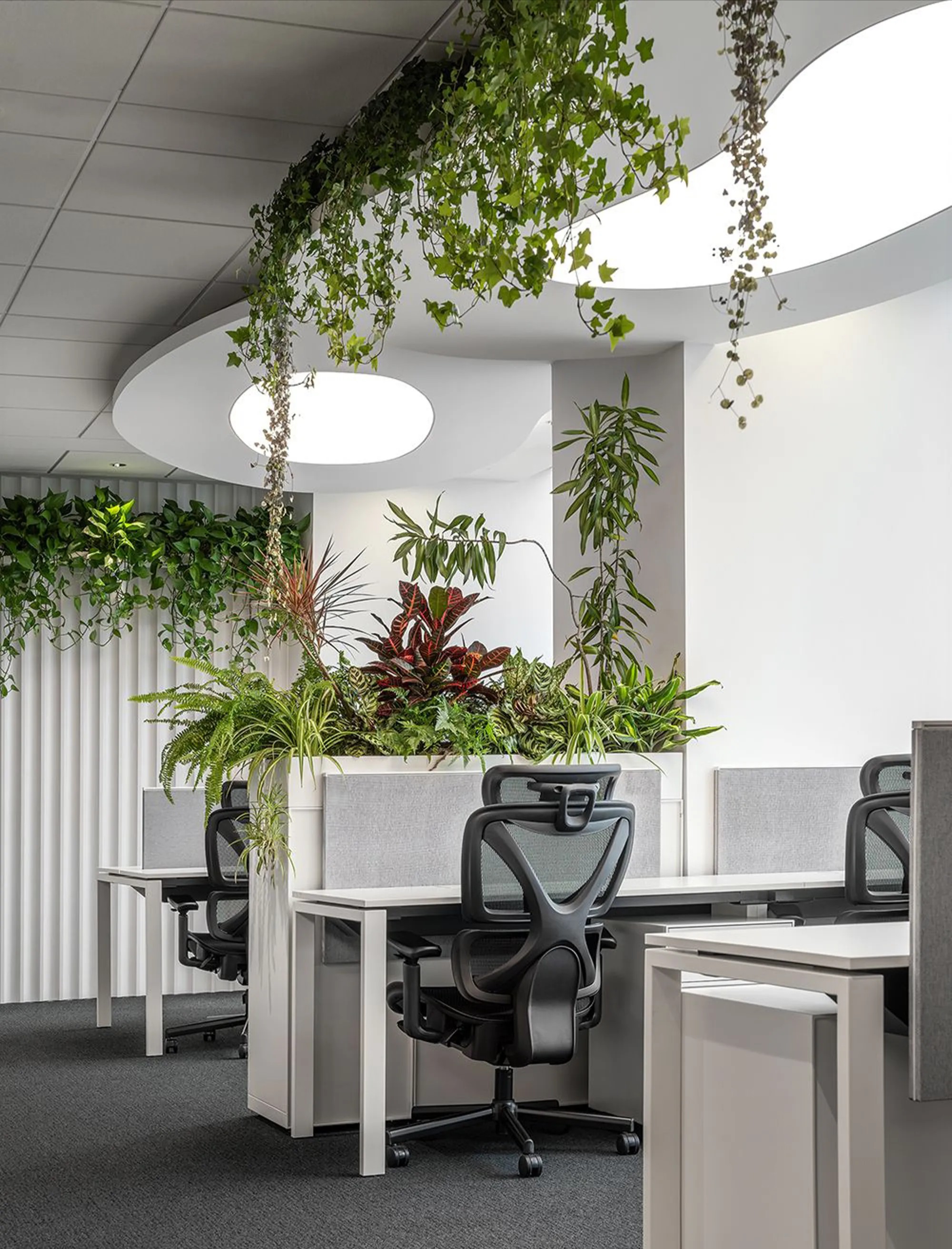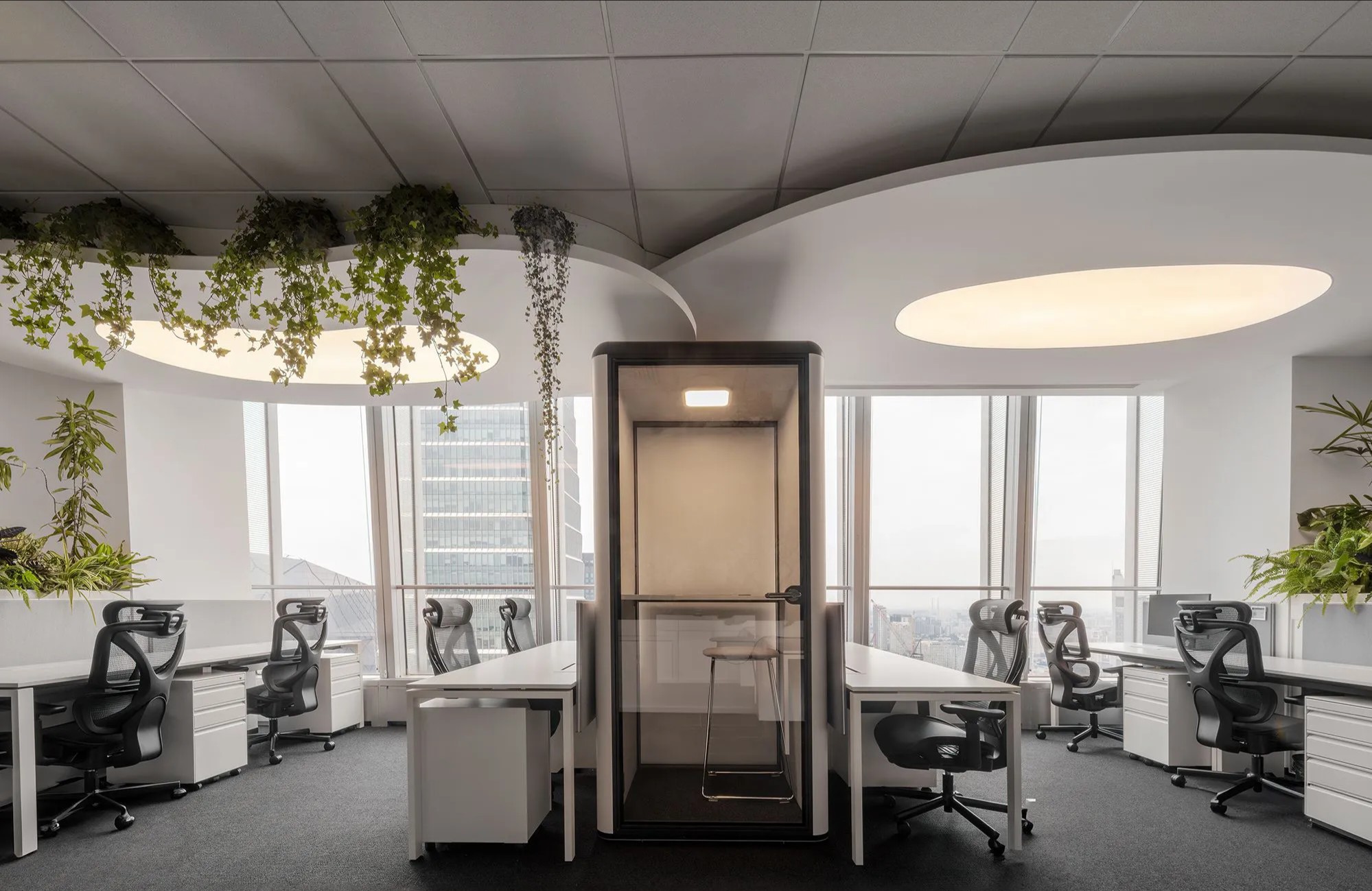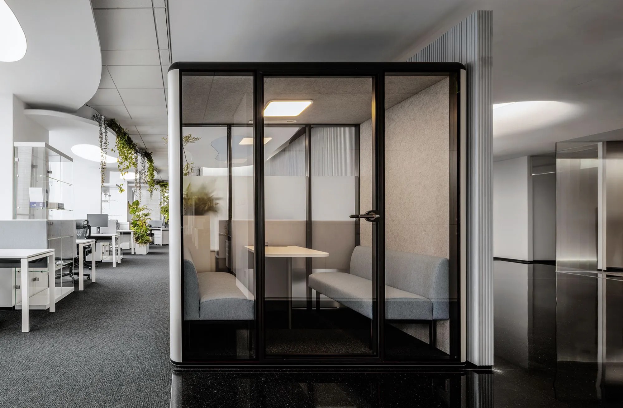 在色彩配置方面,本案以绿色为主色调,黑色和白色为对比色,突出绿色。接待区主要采用对比强烈的黑白两色,体现出律师事务所的简洁和高效。会议室的整体色调为灰色,蓝色地毯为灰色调增添了活力。电话亭采用不同颜色的吸音织物,以突出其特点。办公区全部采用白色,使绿色植物的氛围更加明显。