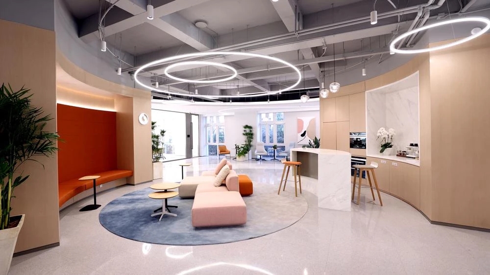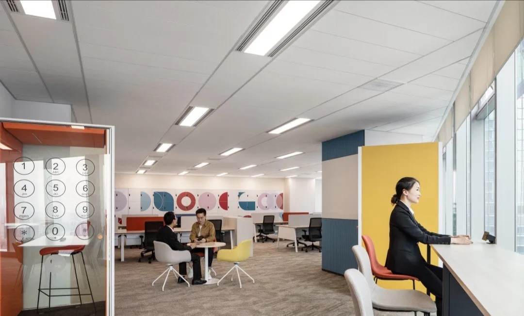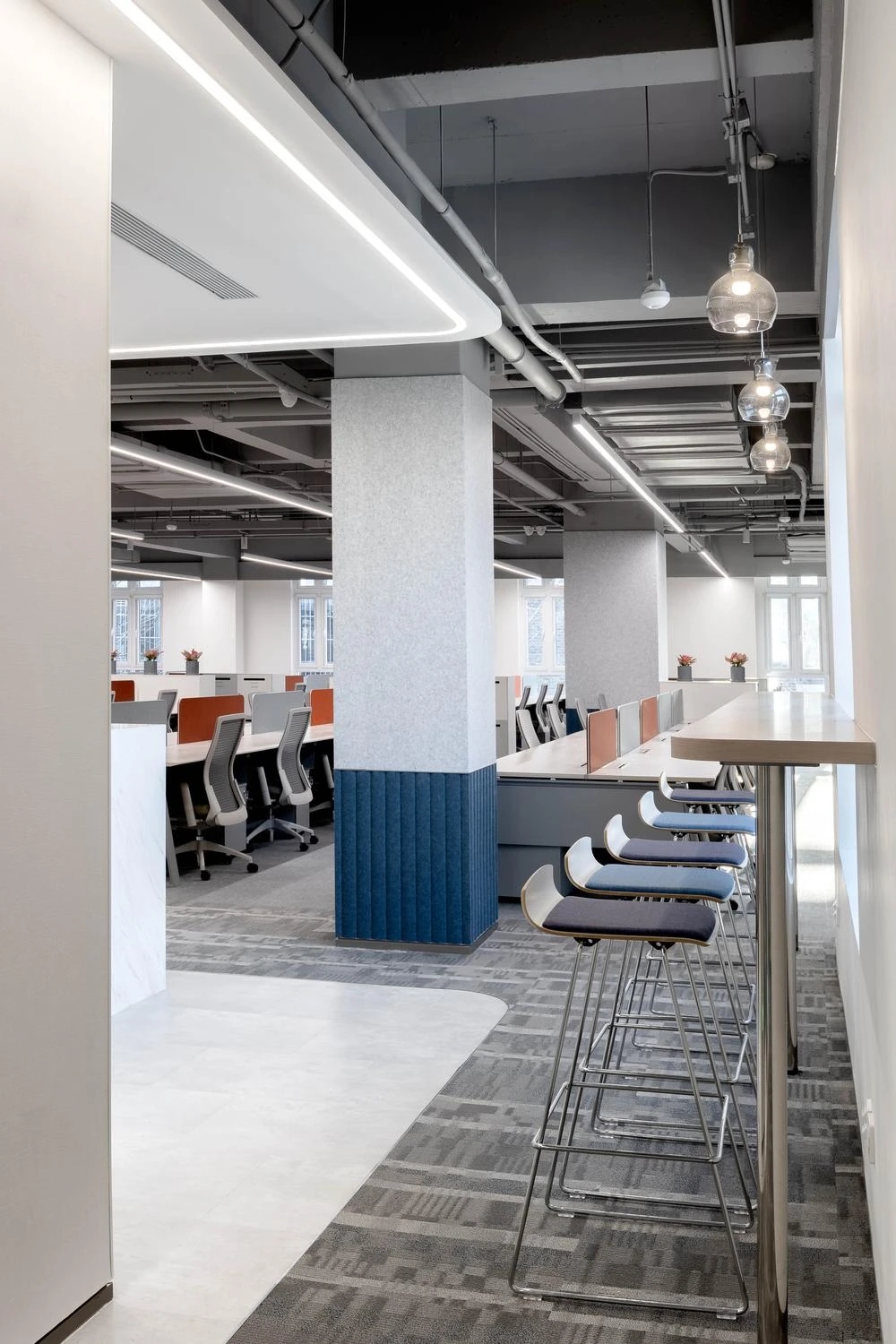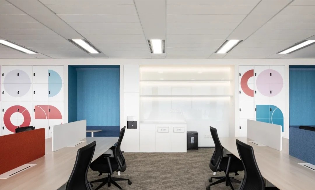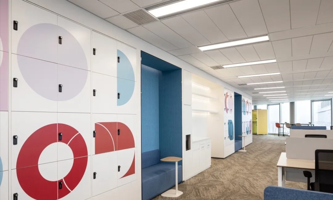 开放式办公空间结合休闲洽谈,独立电话间,将不同的办公场景融入其中,使空间的功能多样化,起到提升空间高效性和协作性。丰富的色彩搭配,虽是多种色彩但莫兰迪色系独有的灰调融入其中,让空间色彩更和谐,使空间具有活跃但不喧闹的视觉感受。利用隔墙走道空间,配合办公协作需求,将功能设施集合为整体有关联及有延续性的设计在办公区中,便于提升空间协作性。并提升中金财富logo的圆形设计元素,将图形与原本纯白色的Locker相结合,在单一的功能区加注了活跃性和趣味性,提升办公的视觉舒适感。